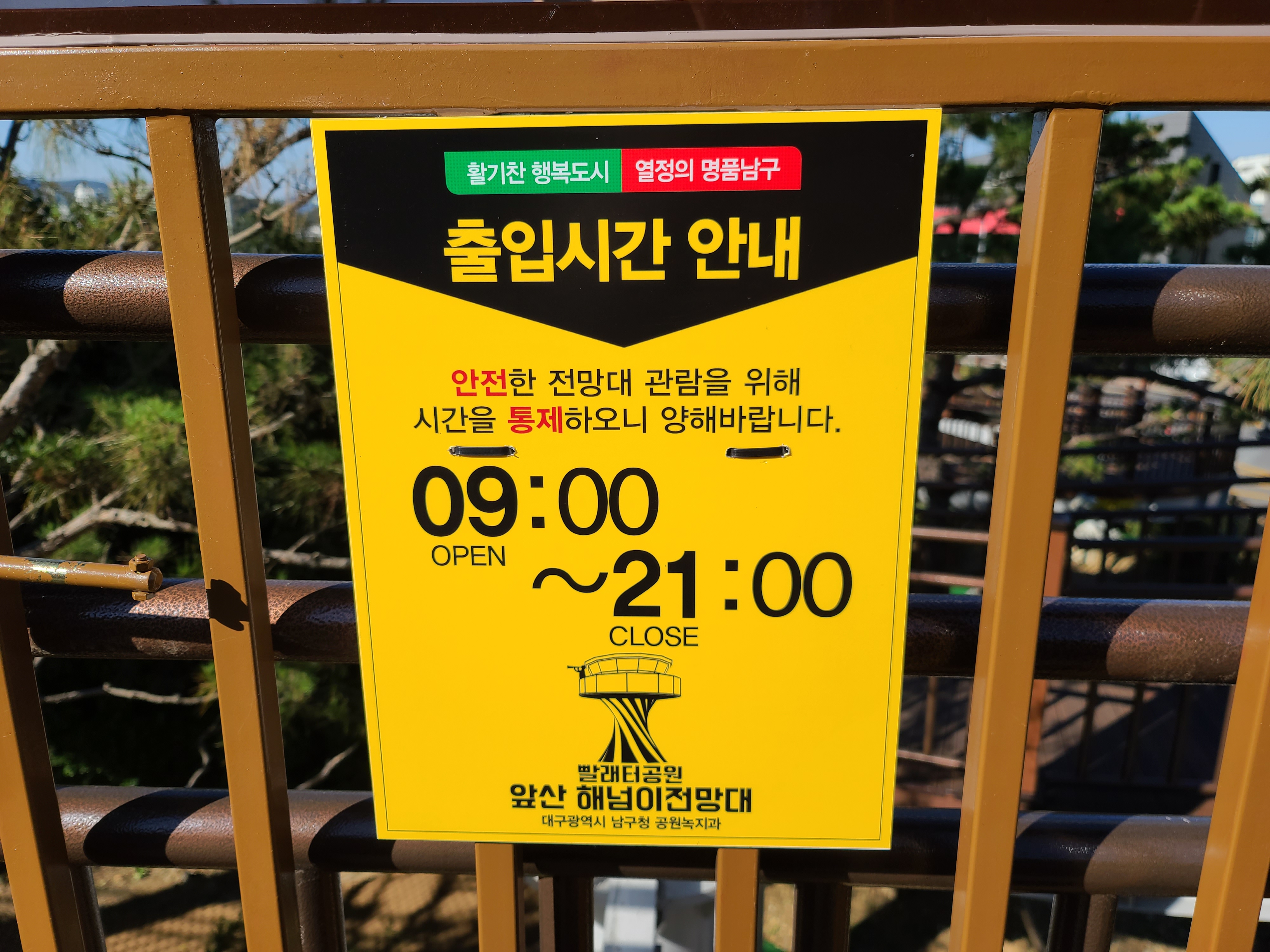 공원 근처엔 앞산 맛둘레길 이라는 먹자골목이 형성되어 있었고, 데크를 따라 이동하면 앞산 빨래터공원의 명소 해넘이전망대에 다다를수 있었습니다. 해넘이전망대 이용시간은 09:00~ 21:00 까지였으며, 약간의 경사로가 있지만 크게 오르기 어렵지 않았습니다.
