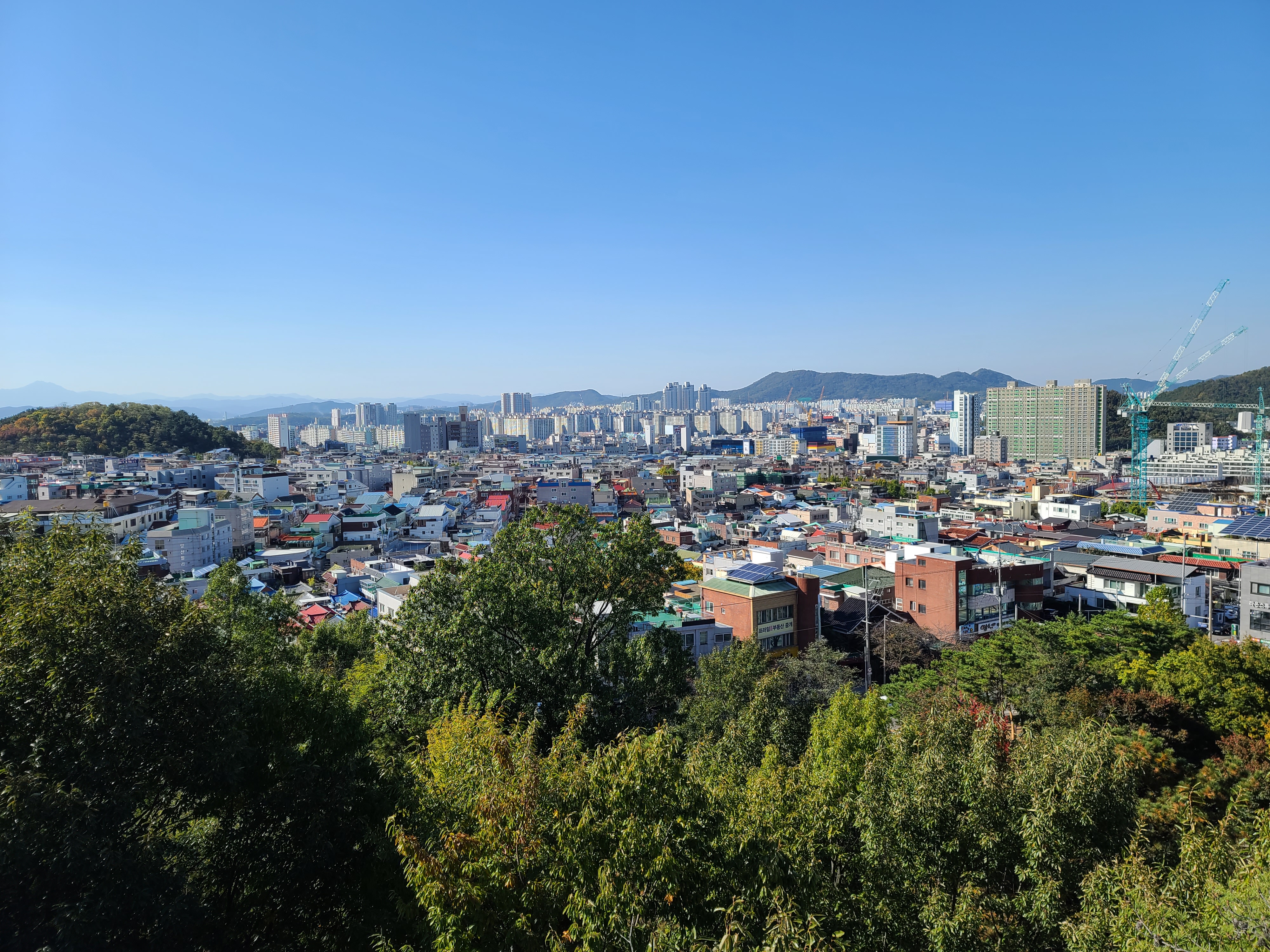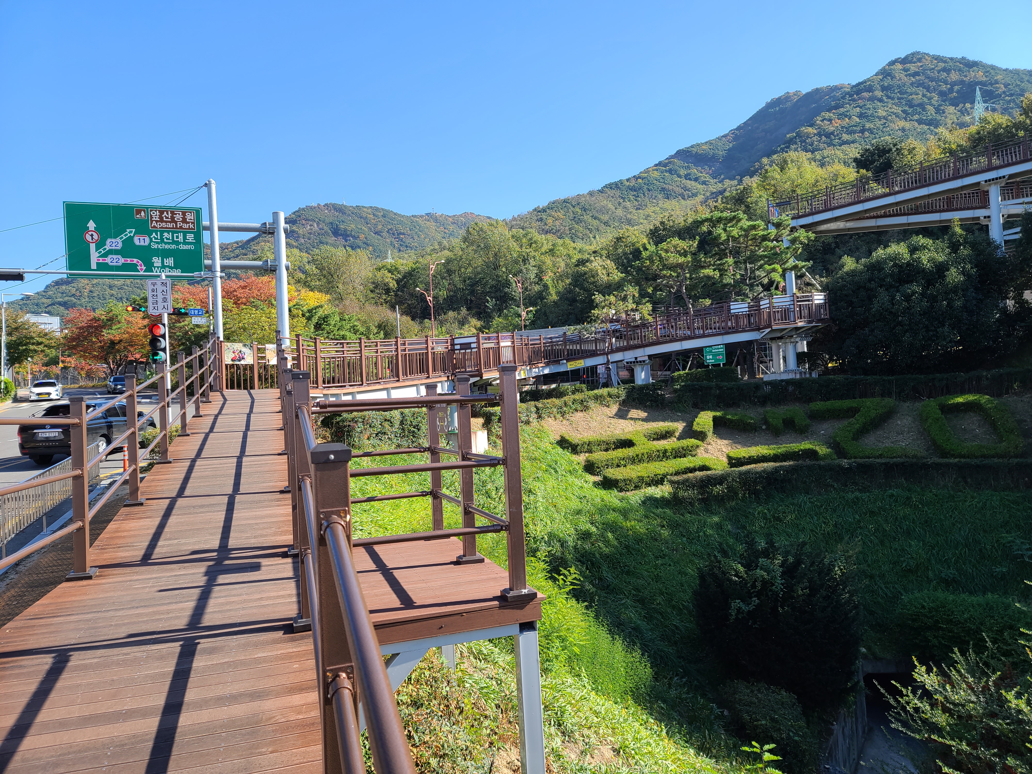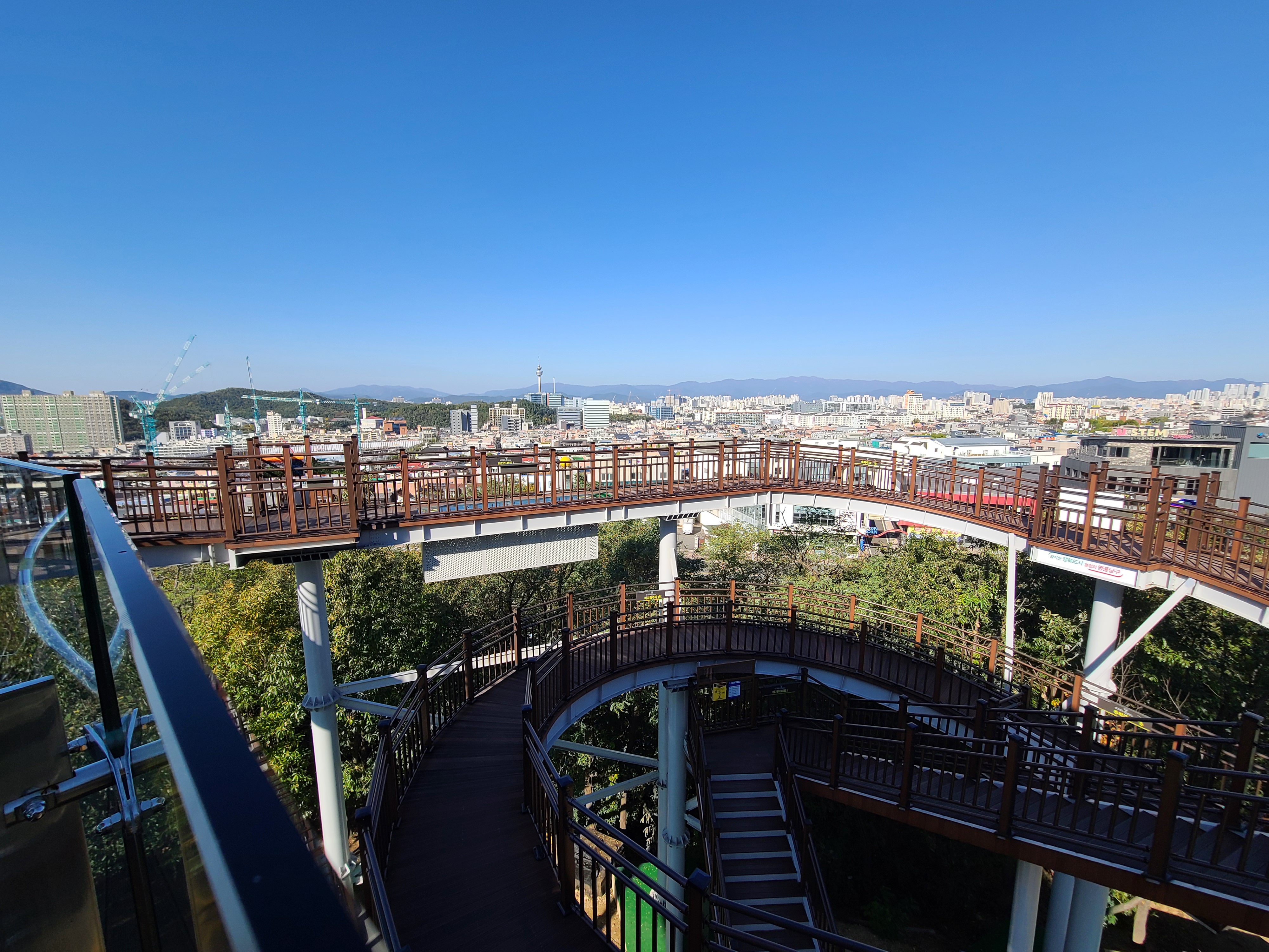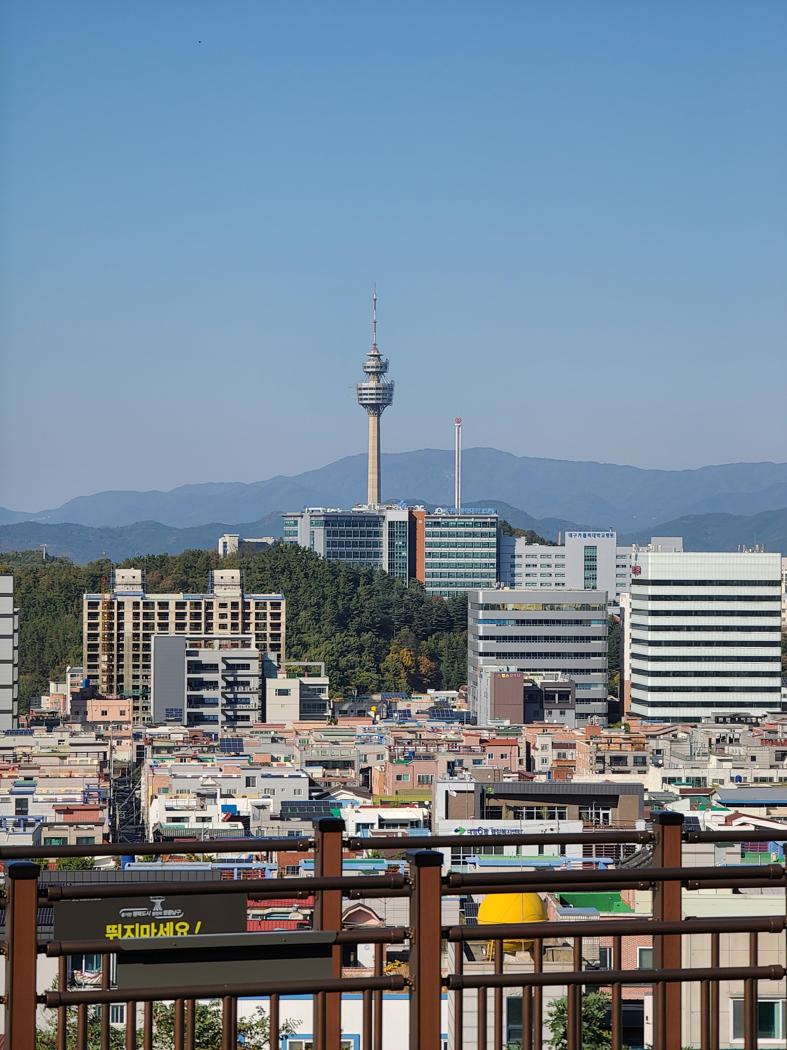 가을이라 맑은 하늘 아래 빨래터공원에서 전망을 보니 대구 시내가 잘 보이고, 멀리 두류공원 83타워도 보이더라고요. 앞산순환로를 끼고 있는 앞산 빨래터공원 해넘이전망대는 앞산순환로 도로의 모습도 사진으로 쉽게 담을 수 있었습니다.