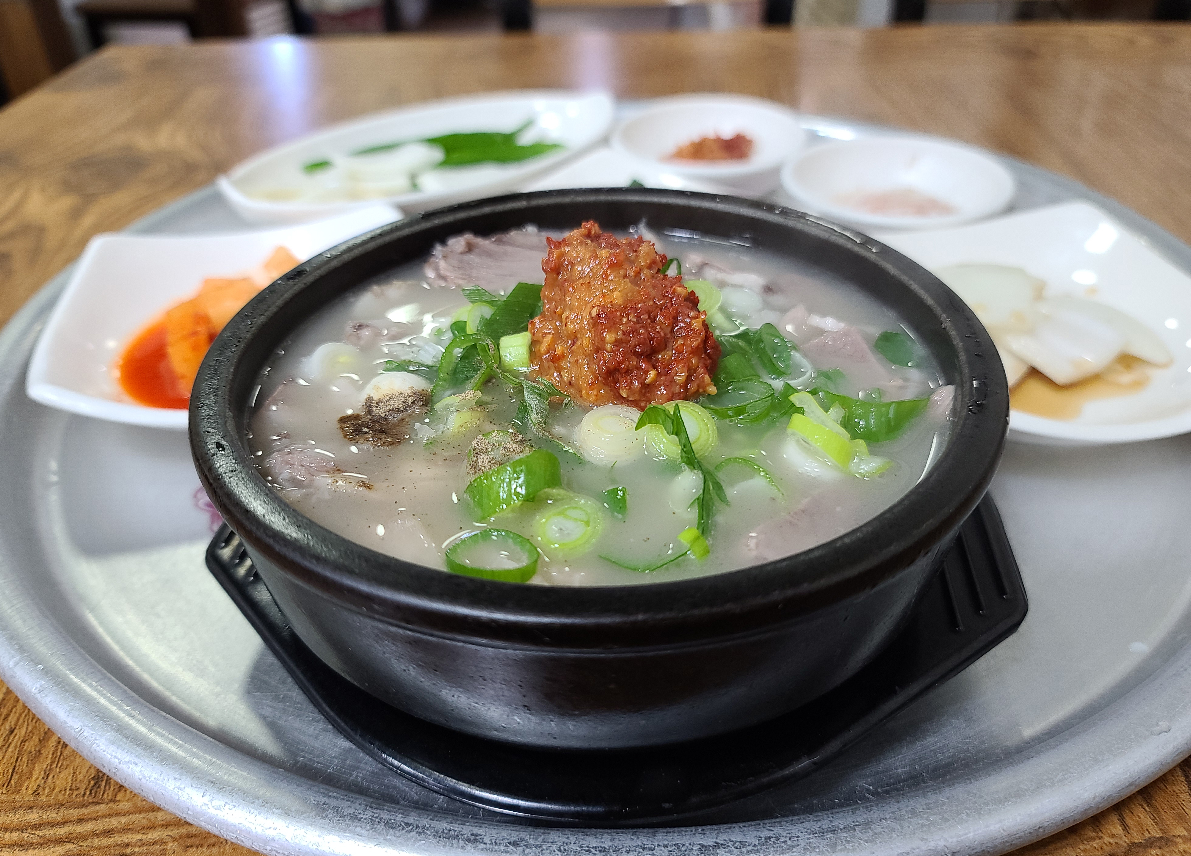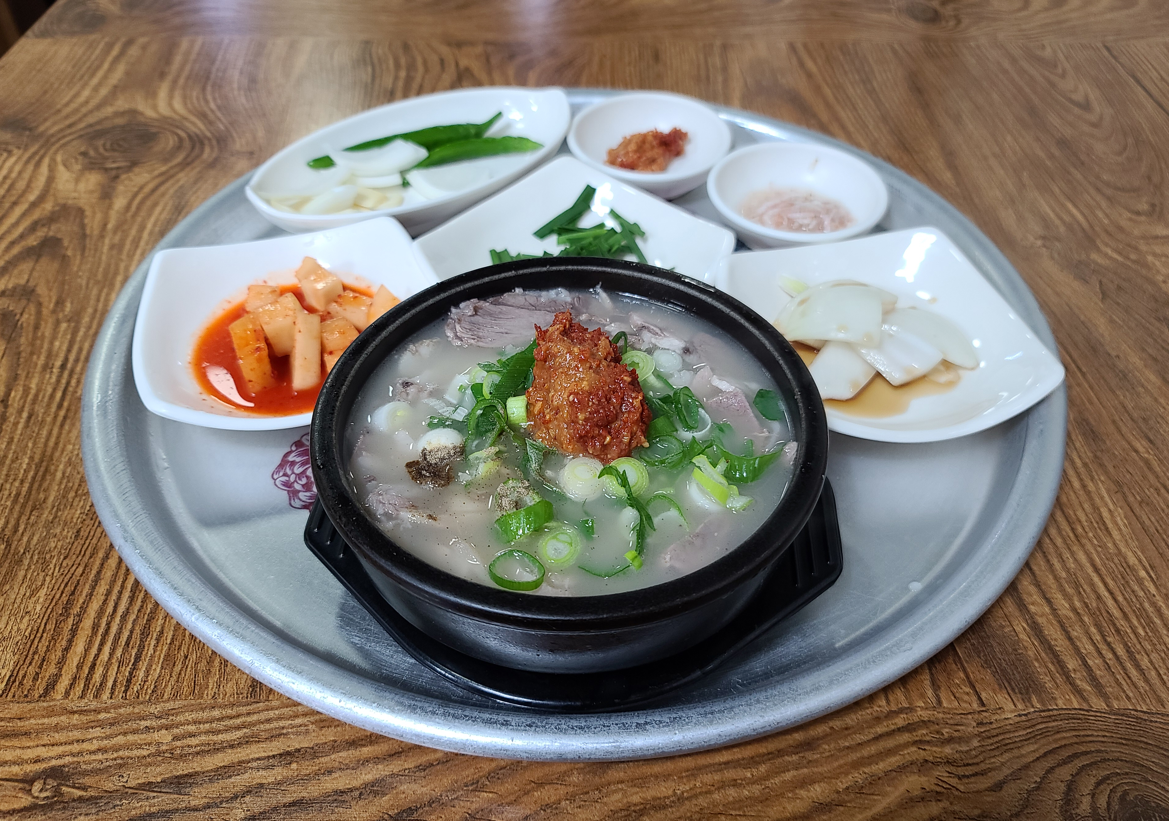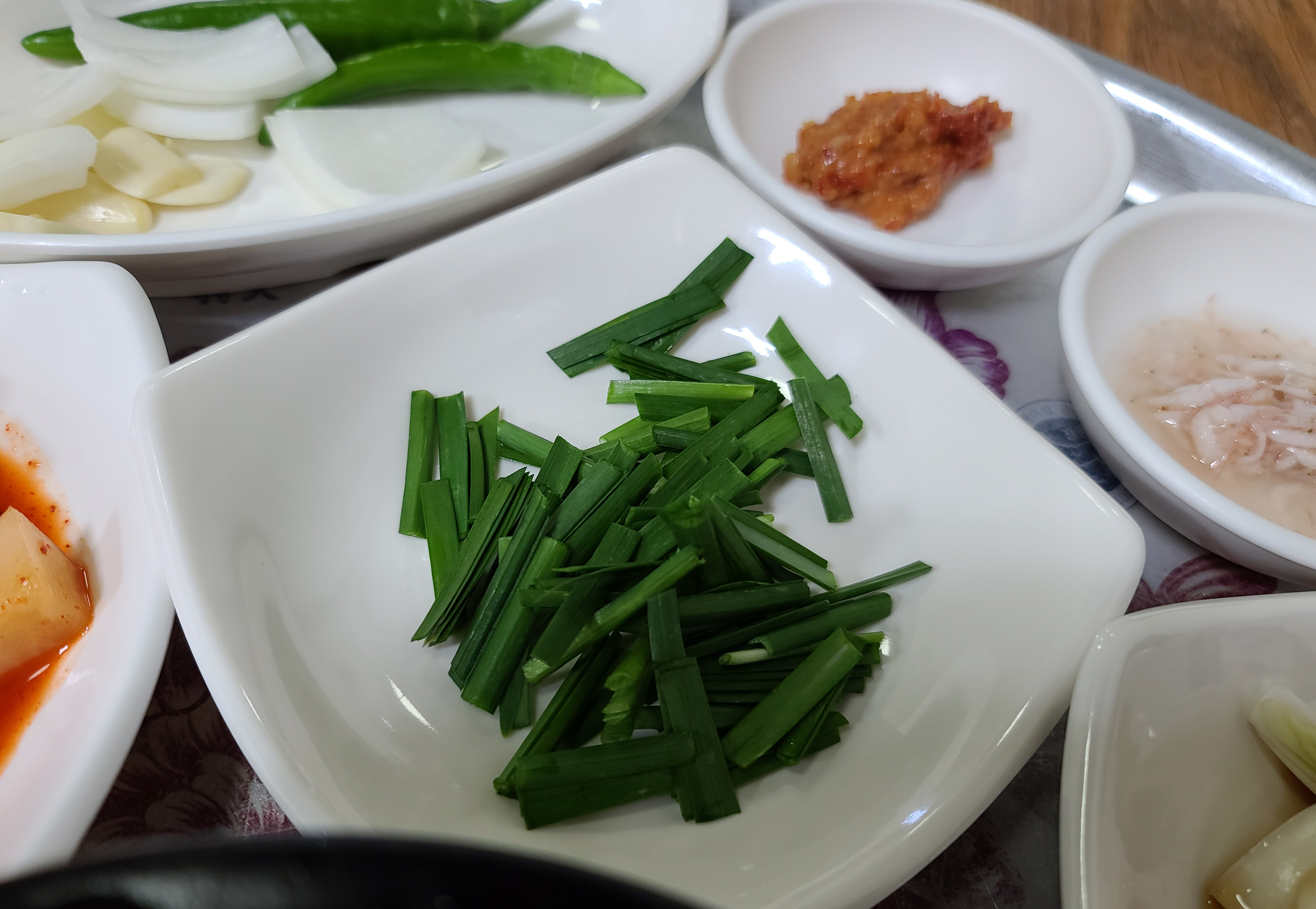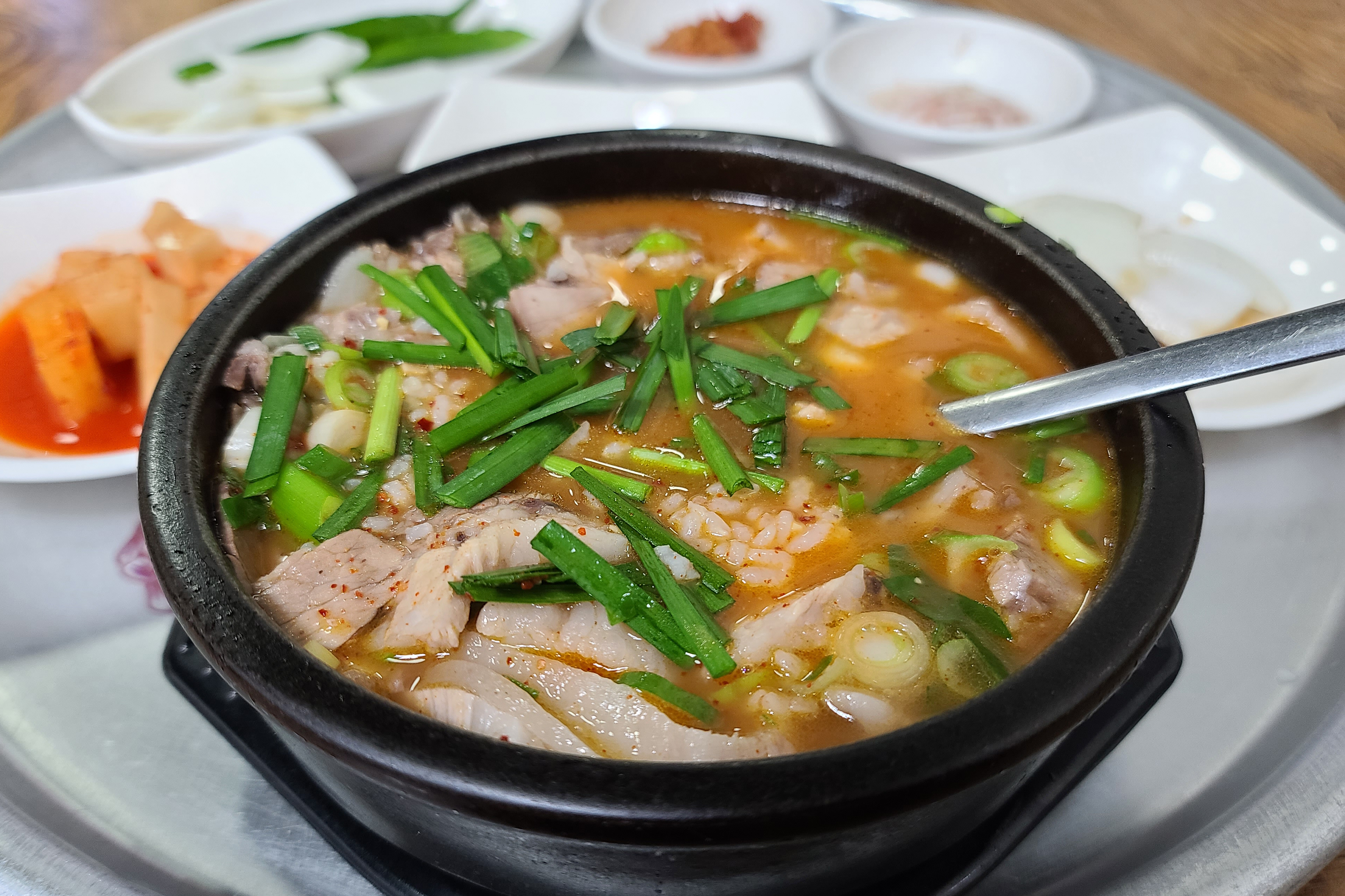 돼지국밥과 반찬들은 정말 흠잡을 데 없이 깔끔한 상태에 제공되었고, 봉덕시장 깍두기보다 더 맛있게 담근 깍두기가 입맛을 사로잡았습니다. 그밖에도 국밥 위에 깔끔한 맛을 더해줄 부추도 곁들일 수 있었고, 시장 돼지국밥과 차이점이 있다면 고기가 좀 퍽퍽하고 양이 좀 적은 듯하더라고요.