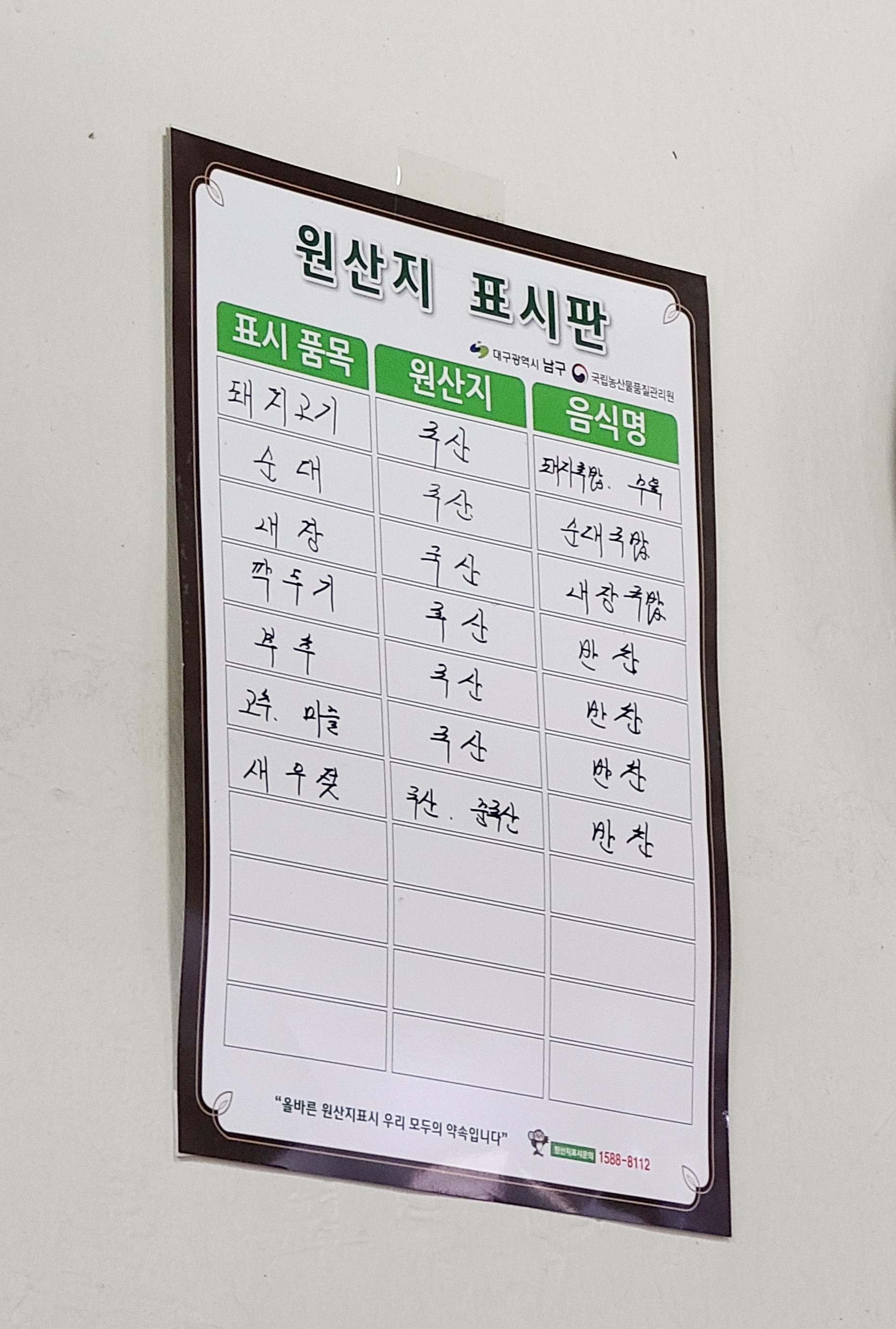봉덕동 원조김천식당은 봉덕시장의 김천식당보다 1,000원 저렴한 금액에 국밥을 판매하고 있었습니다. 원조김천식당의 메뉴는 돼지국밥, 수육, 순대국밥, 내장국밥, 모듬수육, 따로국밥, 돼지국, 섞어국밥, 국밥곱빼기, 수육백반, 순대 등 이 있었습니다. 저는 비교를 위해 돼지국밥을 주문하였고, 원조김천식당의 대부분 메뉴는 국내산 재료를 사용하고 있었습니다.