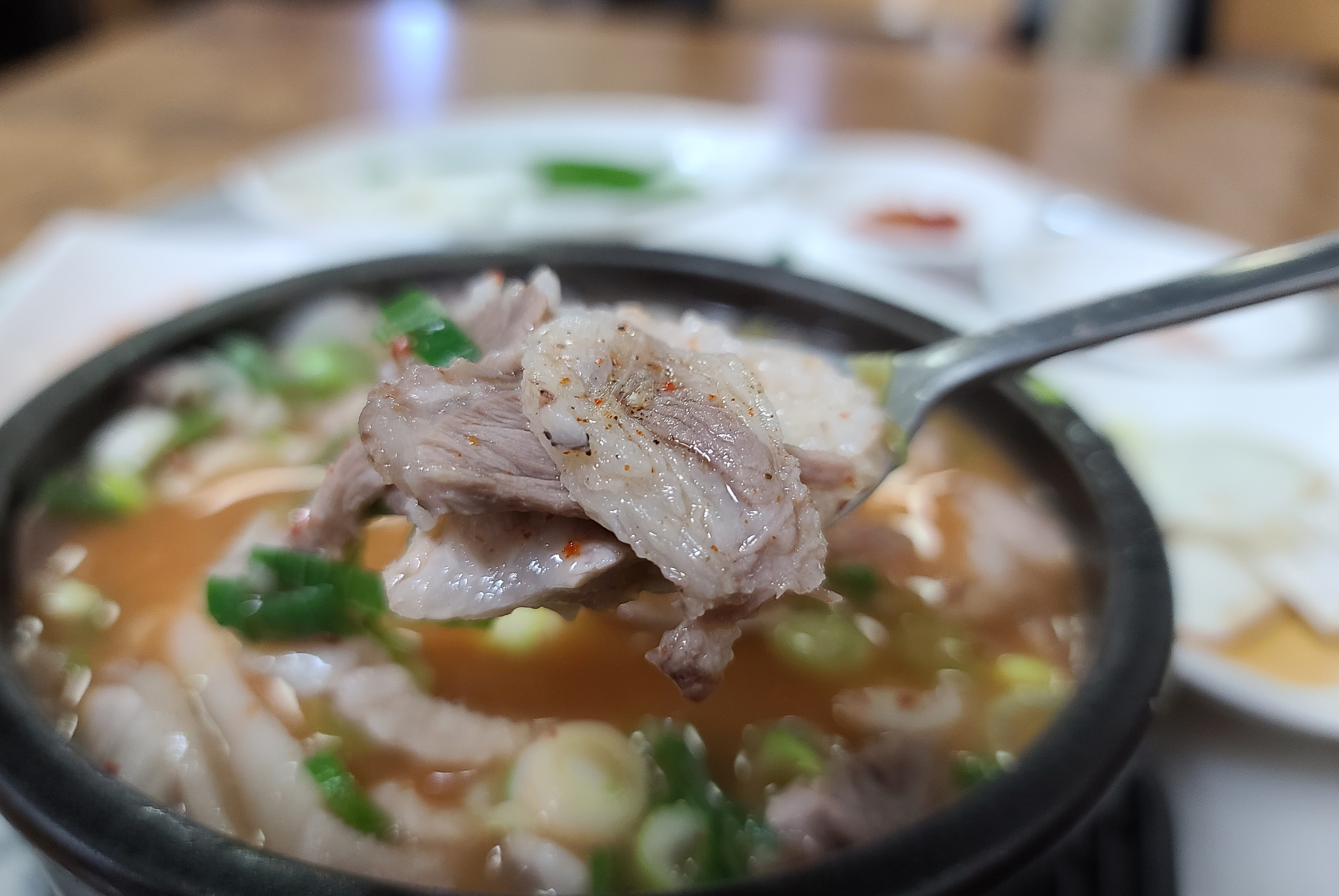 봉덕동 원조김천식당 돼지국밥 위에는 송송 썰어진 대파가 고명으로 올라갔고, 돼지국밥이라는 이름답게 돼지고기도 들어간 모습이었습니다. 봉덕시장 국밥은 진하고 구수한 맛이 있는 반면, 봉덕동 원조김천식당은 국물 맛이 텁텁하지 않고 깔끔했으며, 고기도 담백한 맛이었습니다.