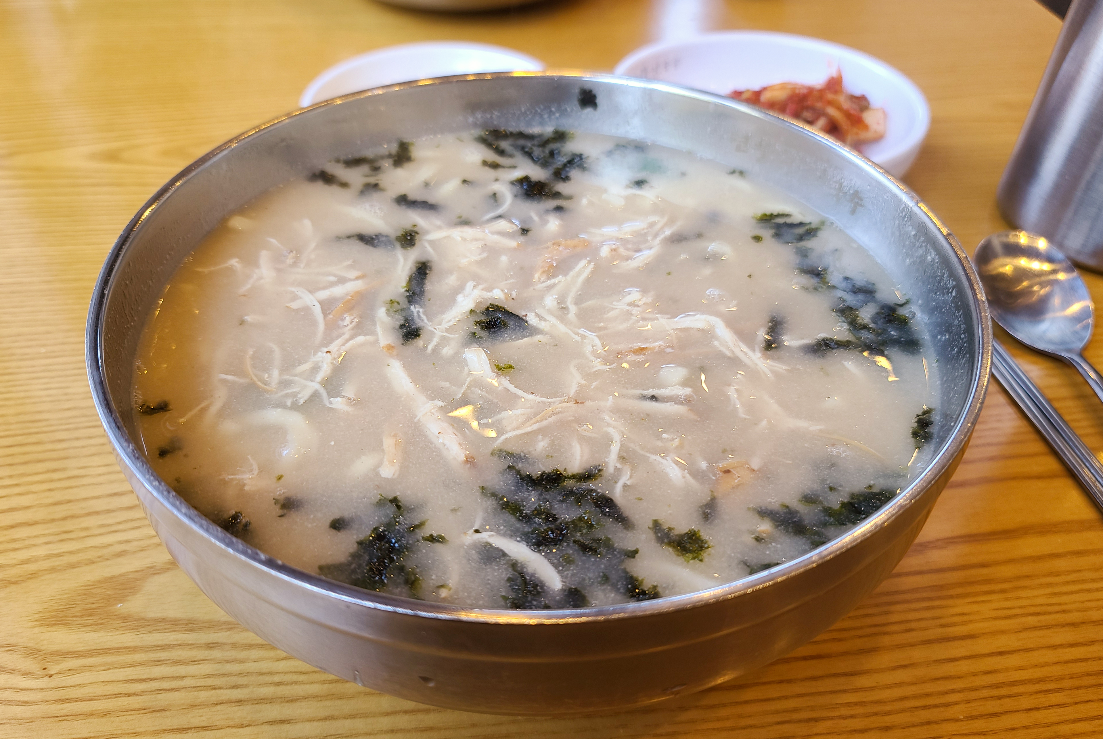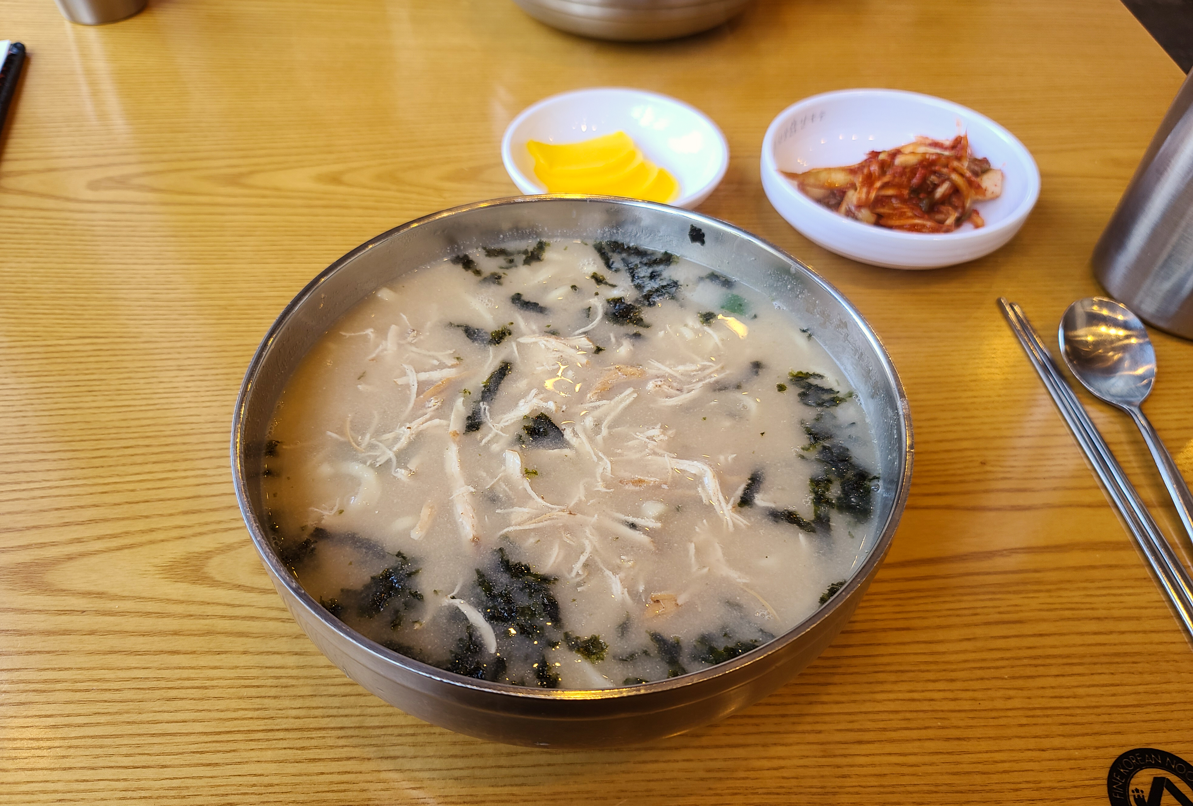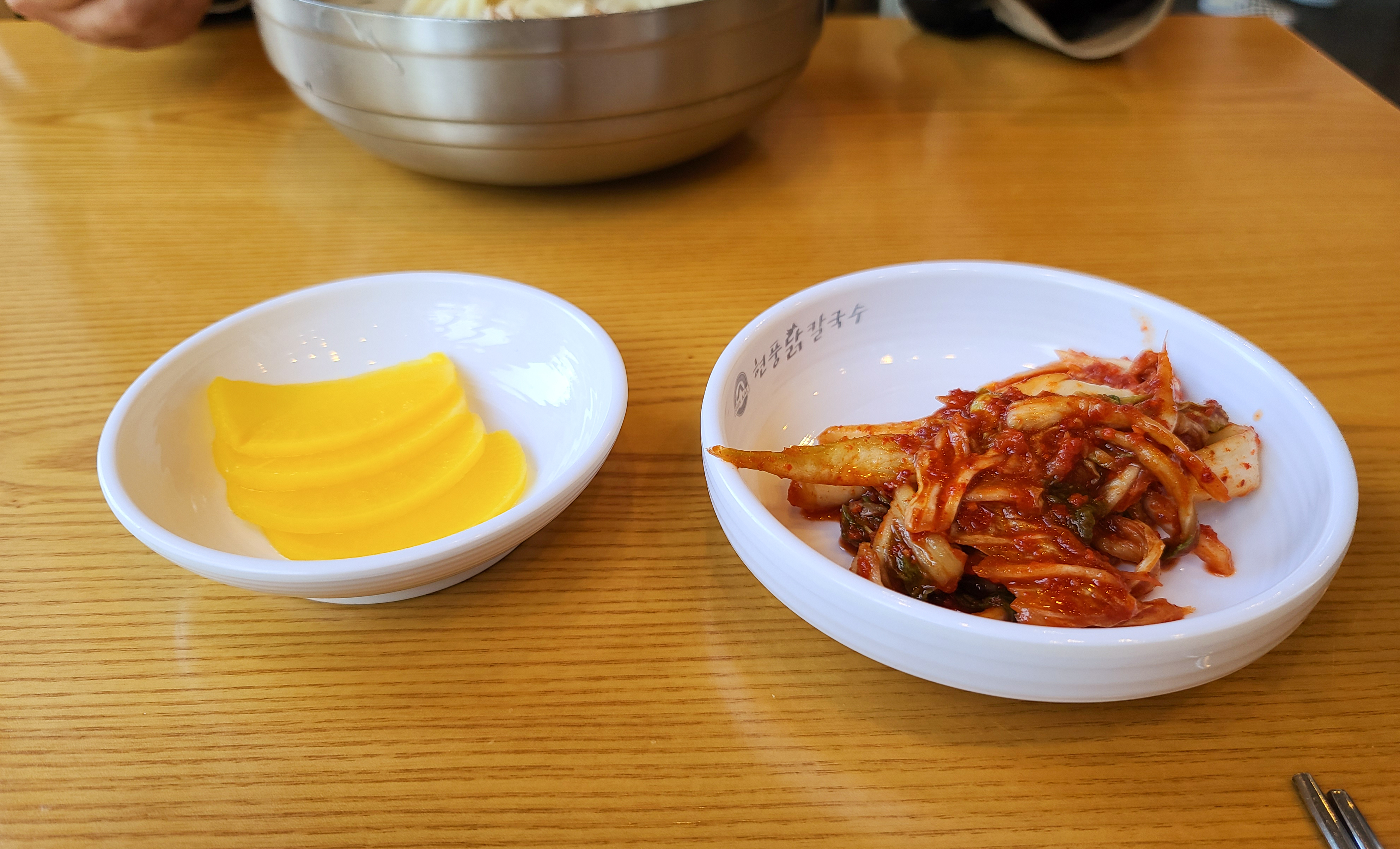 현풍닭칼국수 가게를 둘러보는 동안 닭칼국수가 등장했습니다. 닭칼국수의 반찬으로 단무지와 김치가 있었습니다. 김치가 맵다고 되어있었는데 저는 먹을만했습니다.