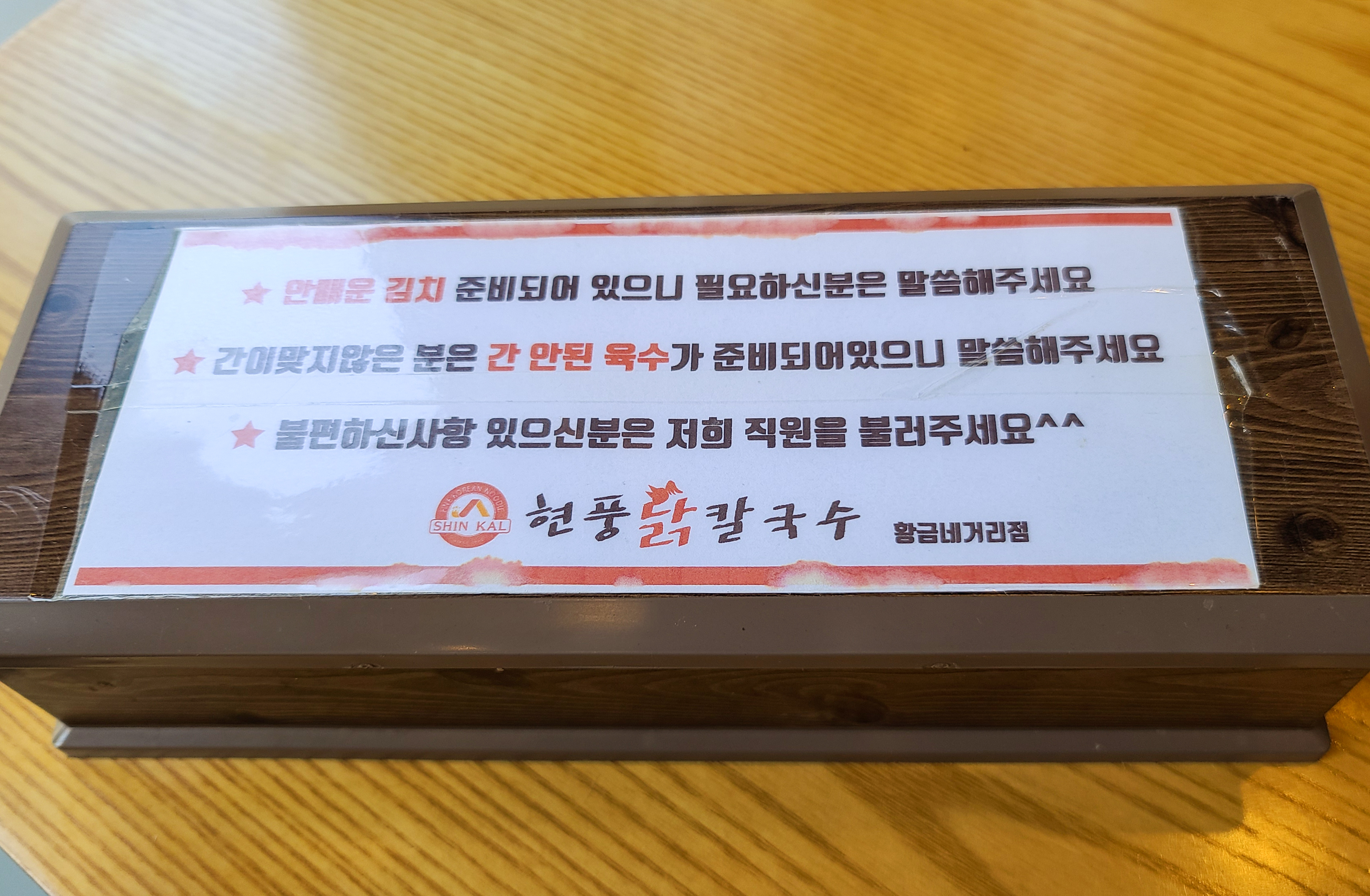 현풍닭칼국수의 메뉴는 위와 같습니다. 닭칼국수, 삼계칼국수, 닭곰탕, 김치말이냉국수, 육전김치말이냉국수, 한방수육, 수육세트, 갈비고기만두, 김치볶음왕만두, 감자순대만두, 공기밥 등 이 있었습니다. 닭칼국수와 곁들이는 김치로 매운 김치가 제공되는지, 안 매운 김치도 준비되어있다는 안내를 볼 수 있었고, 간이 맞지 않는 분을 위해 간이 안된 육수를 추가로 받을 수 있다고 되어있었습니다. 저희는 닭칼국수 2개를 주문하였습니다.