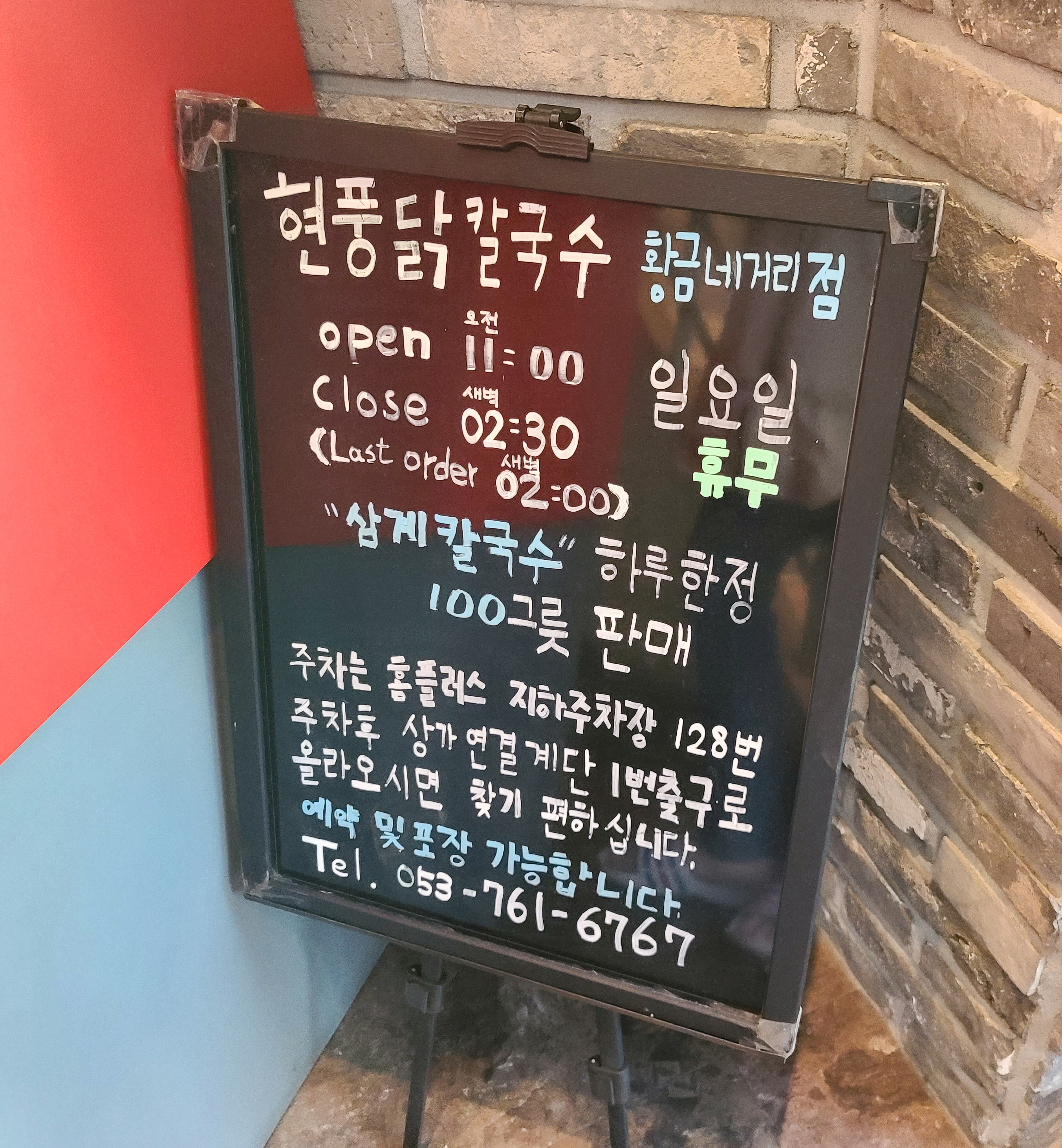 두산동 현풍닭칼국수 주차는 홈플러스 지하주차장 128번 주차 후 상가 연결 계단 1번 출구로 올라오면 편하다고 합니다. 주차 이용에 참고하시기 바랍니다. 지금 보니 하루 한정 100그릇만 판매한다고 하네요, 관심 있으신 분은 이용해보셔도 괜찮을 것 같습니다.