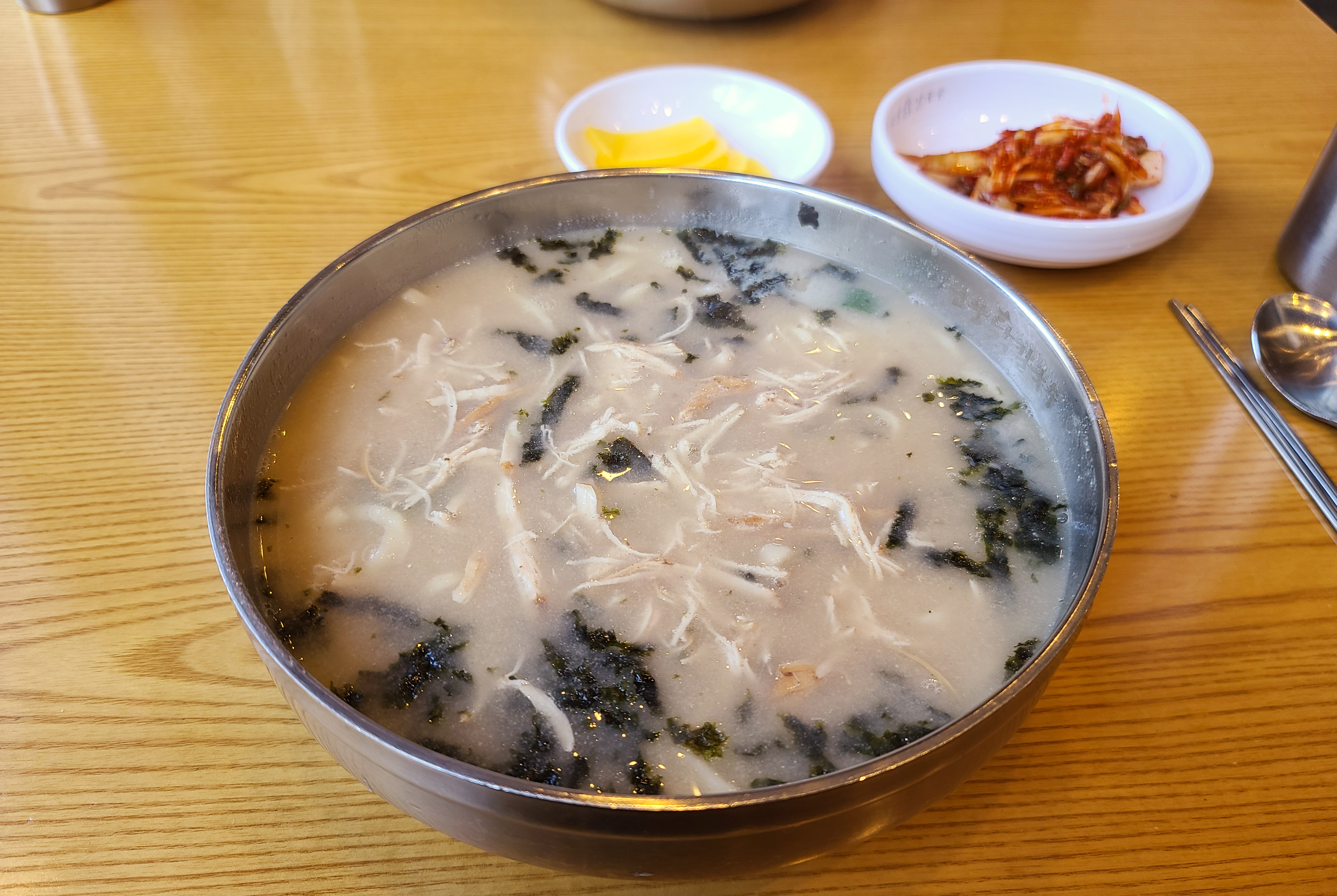 현풍닭칼국수 가게를 둘러보는 동안 닭칼국수가 등장했습니다. 닭칼국수의 반찬으로 단무지와 김치가 있었습니다. 김치가 맵다고 되어있었는데 저는 먹을만했습니다.