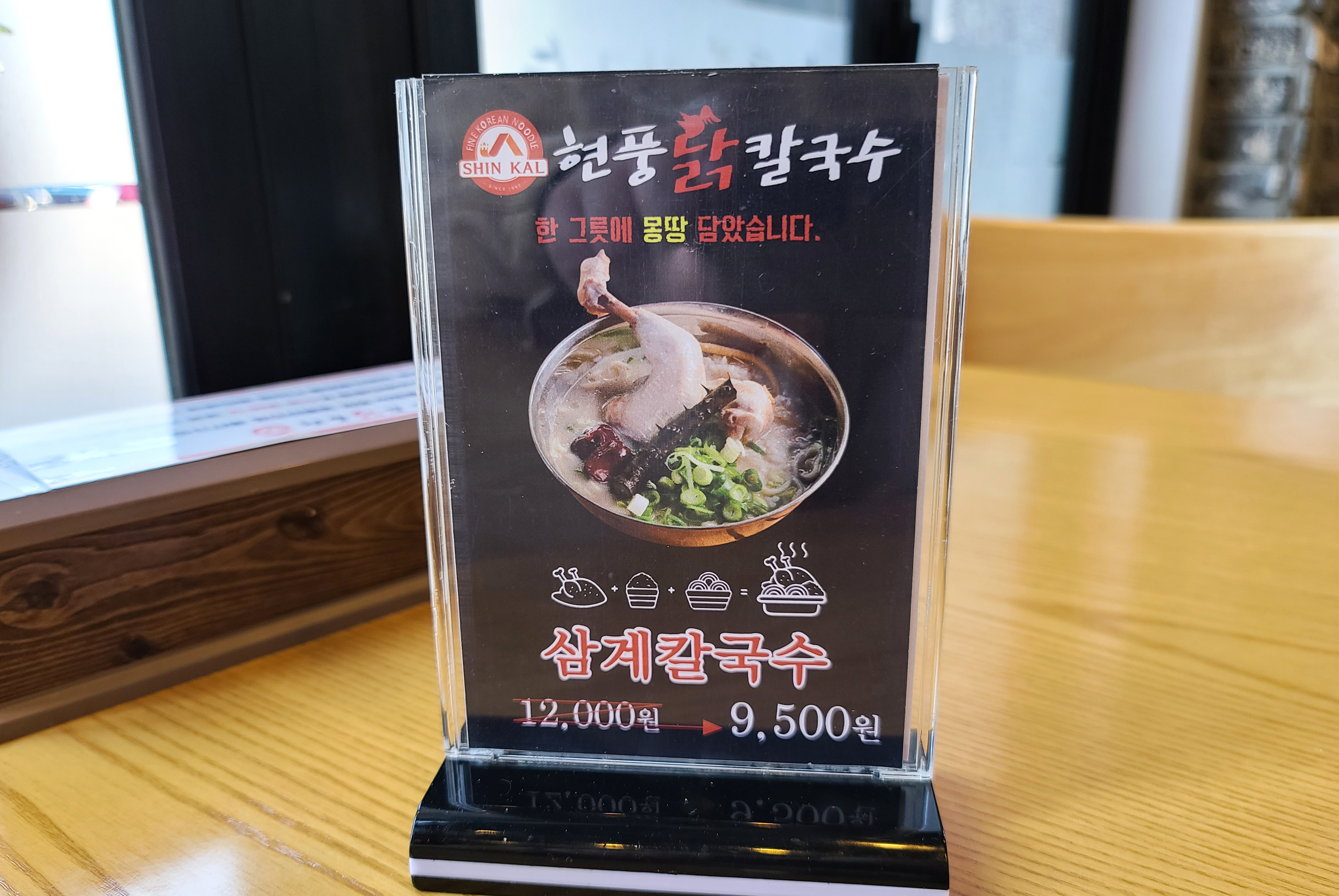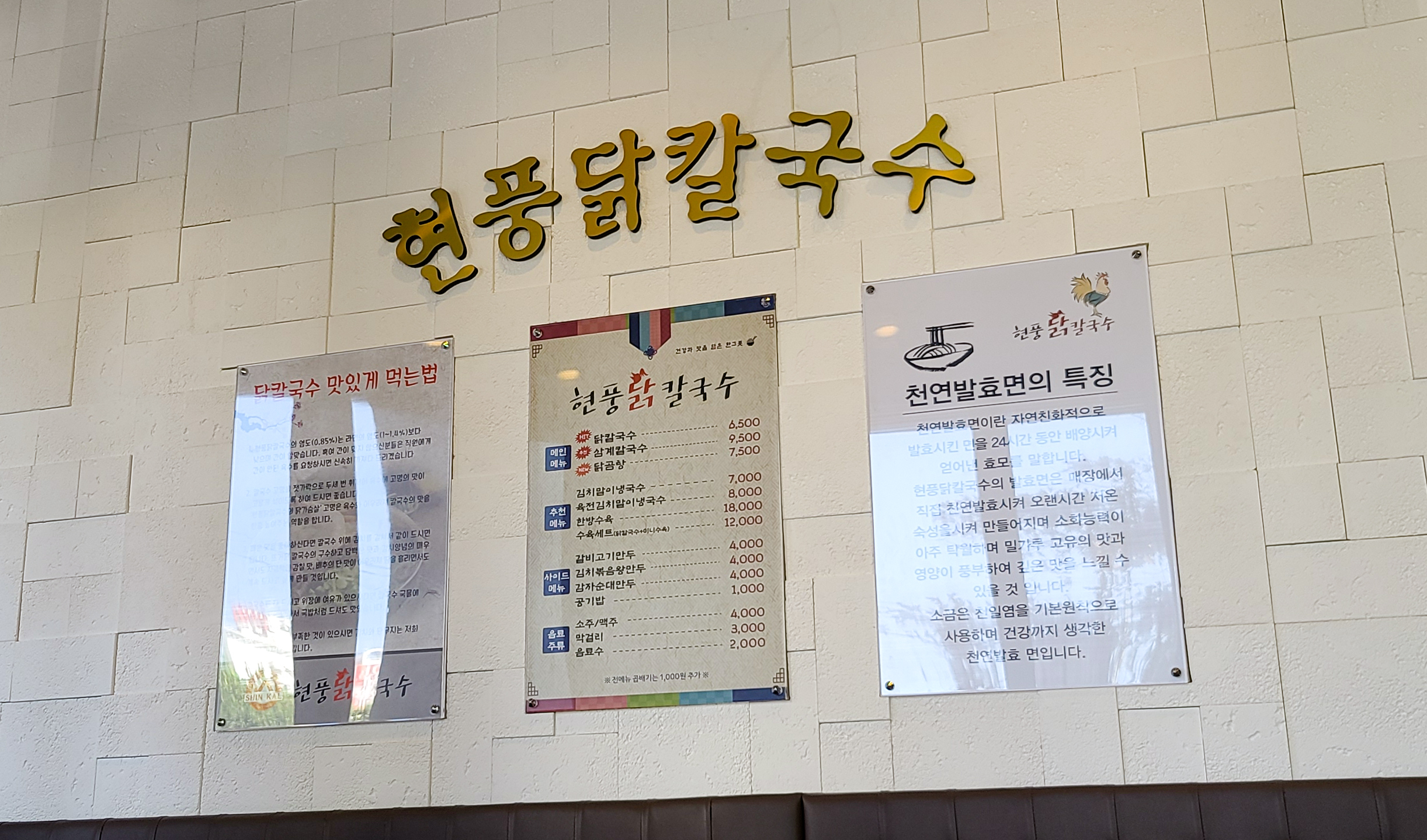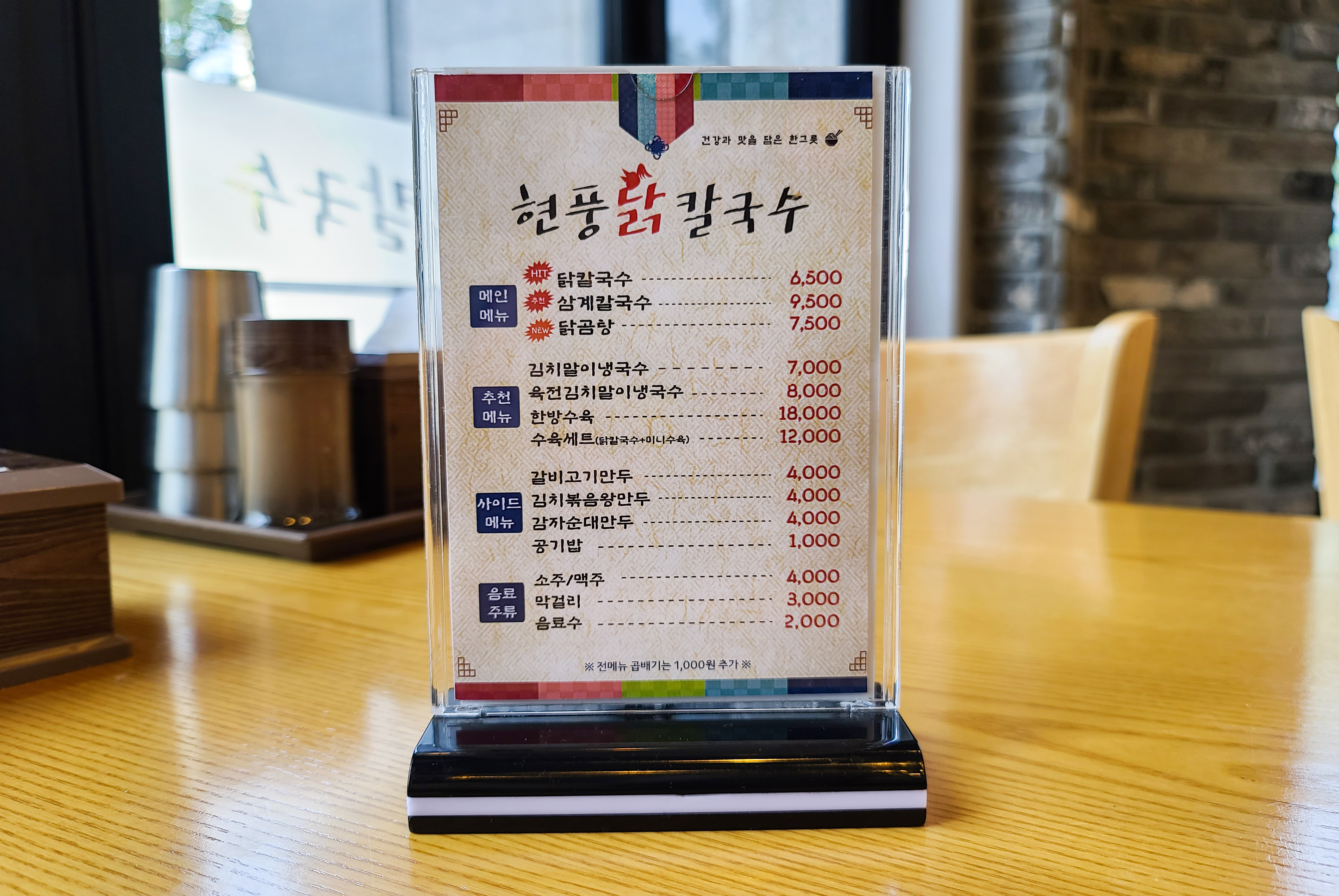 현풍닭칼국수의 메뉴는 위와 같습니다. 닭칼국수, 삼계칼국수, 닭곰탕, 김치말이냉국수, 육전김치말이냉국수, 한방수육, 수육세트, 갈비고기만두, 김치볶음왕만두, 감자순대만두, 공기밥 등 이 있었습니다. 닭칼국수와 곁들이는 김치로 매운 김치가 제공되는지, 안 매운 김치도 준비되어있다는 안내를 볼 수 있었고, 간이 맞지 않는 분을 위해 간이 안된 육수를 추가로 받을 수 있다고 되어있었습니다. 저희는 닭칼국수 2개를 주문하였습니다.