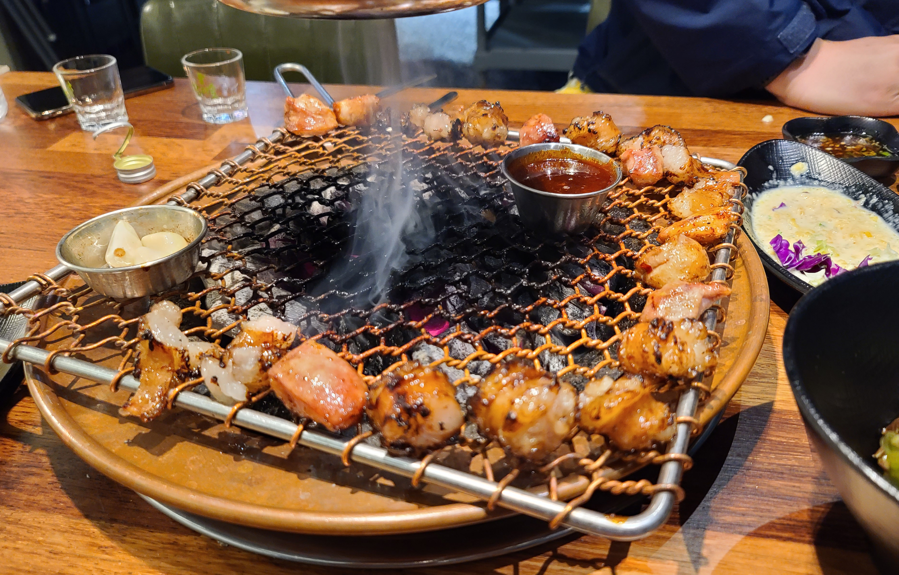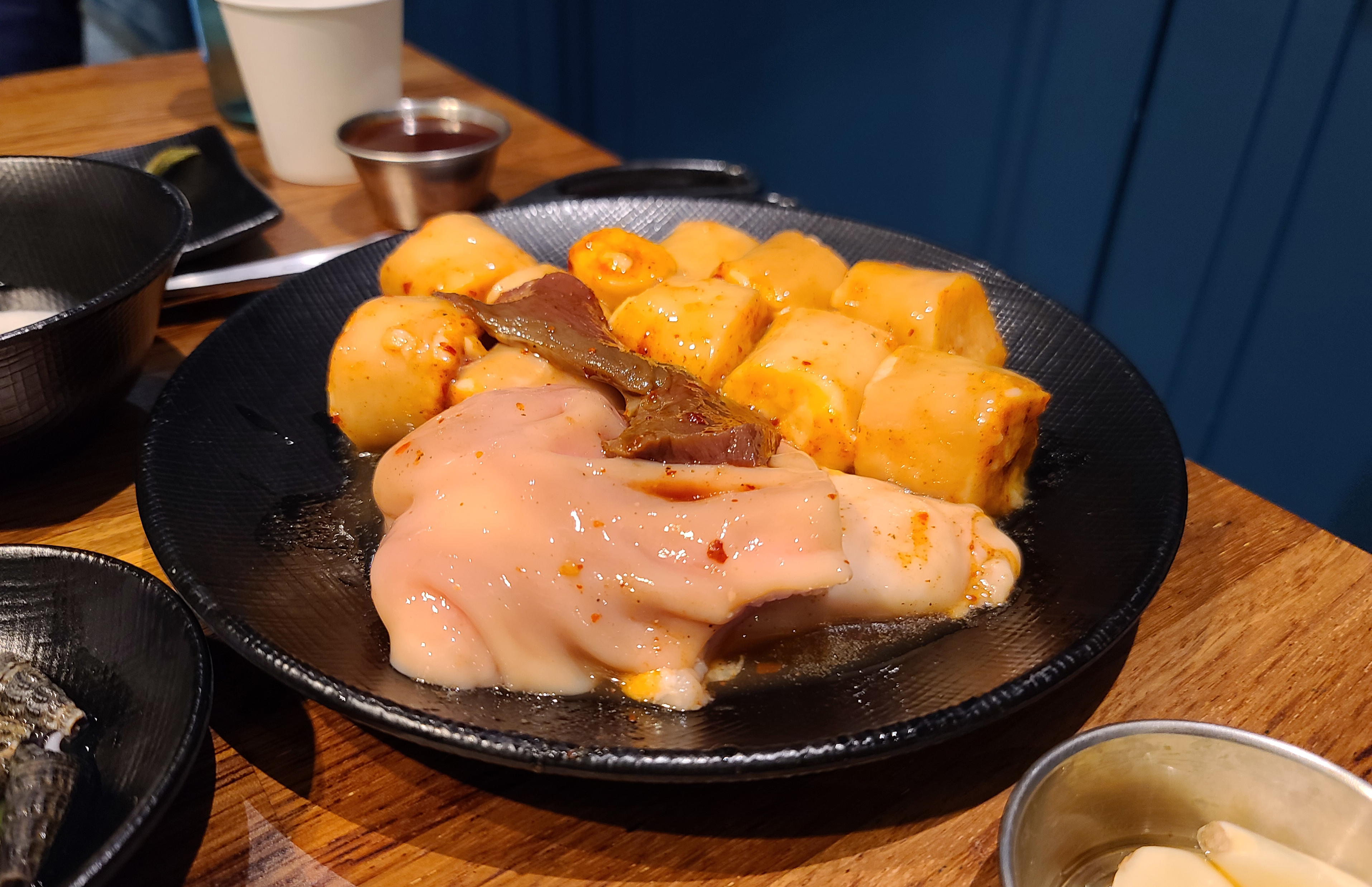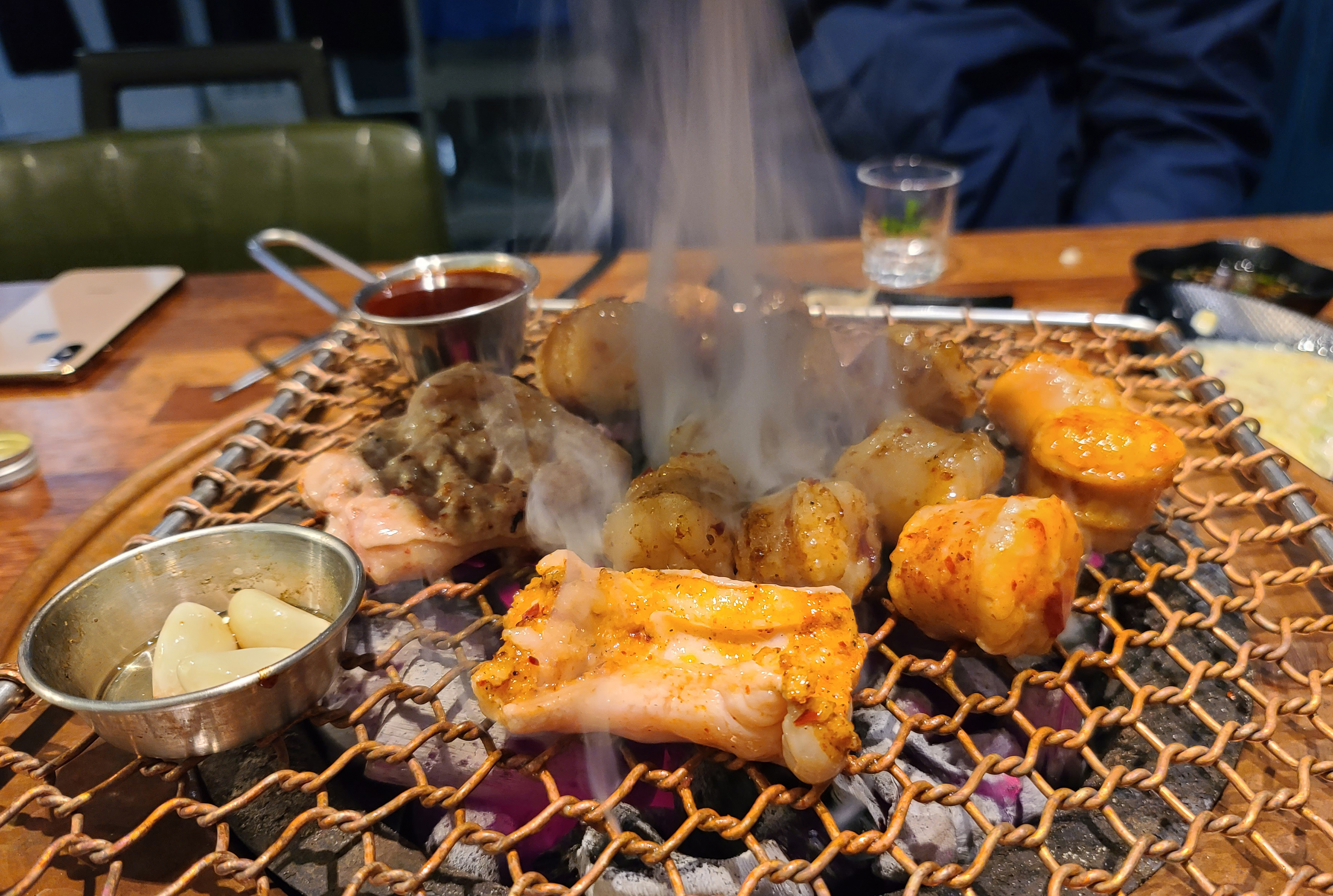 곧이어 불이랑 그릴이 준비되었고, 친구가 추천해주었던 대창・막창이 나왔습니다. 양곱화는 특히 통통한 대창이 인상적인 가게였는데요, 보통 대창하면 기름기가 너무 많아서 느끼한(고소한) 맛을 강조하고 있는데, 양곱화의 대창은 탱탱한 게 양념까지 되어 보기에도 좋고 먹음직스럽게 생겼더라고요.