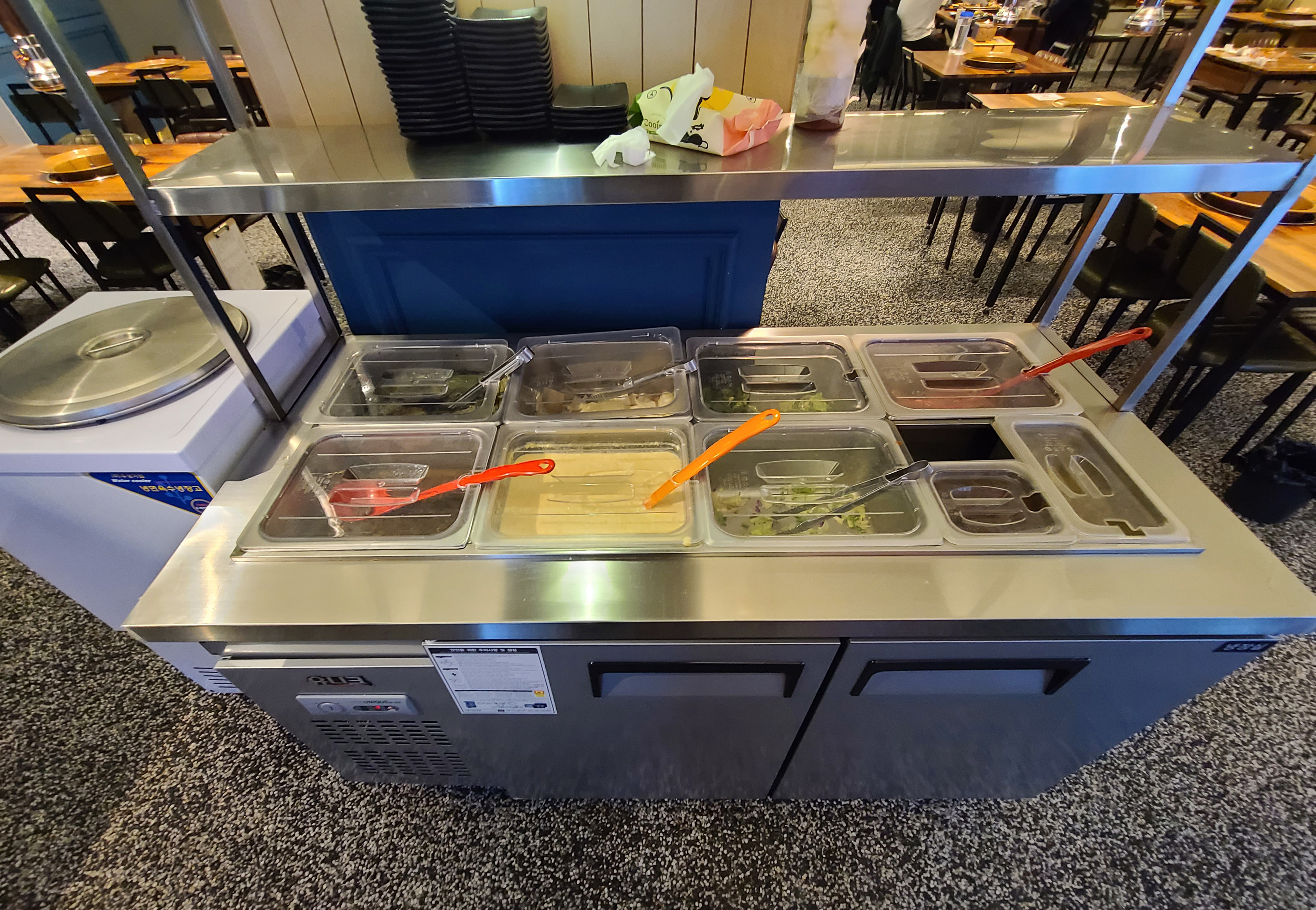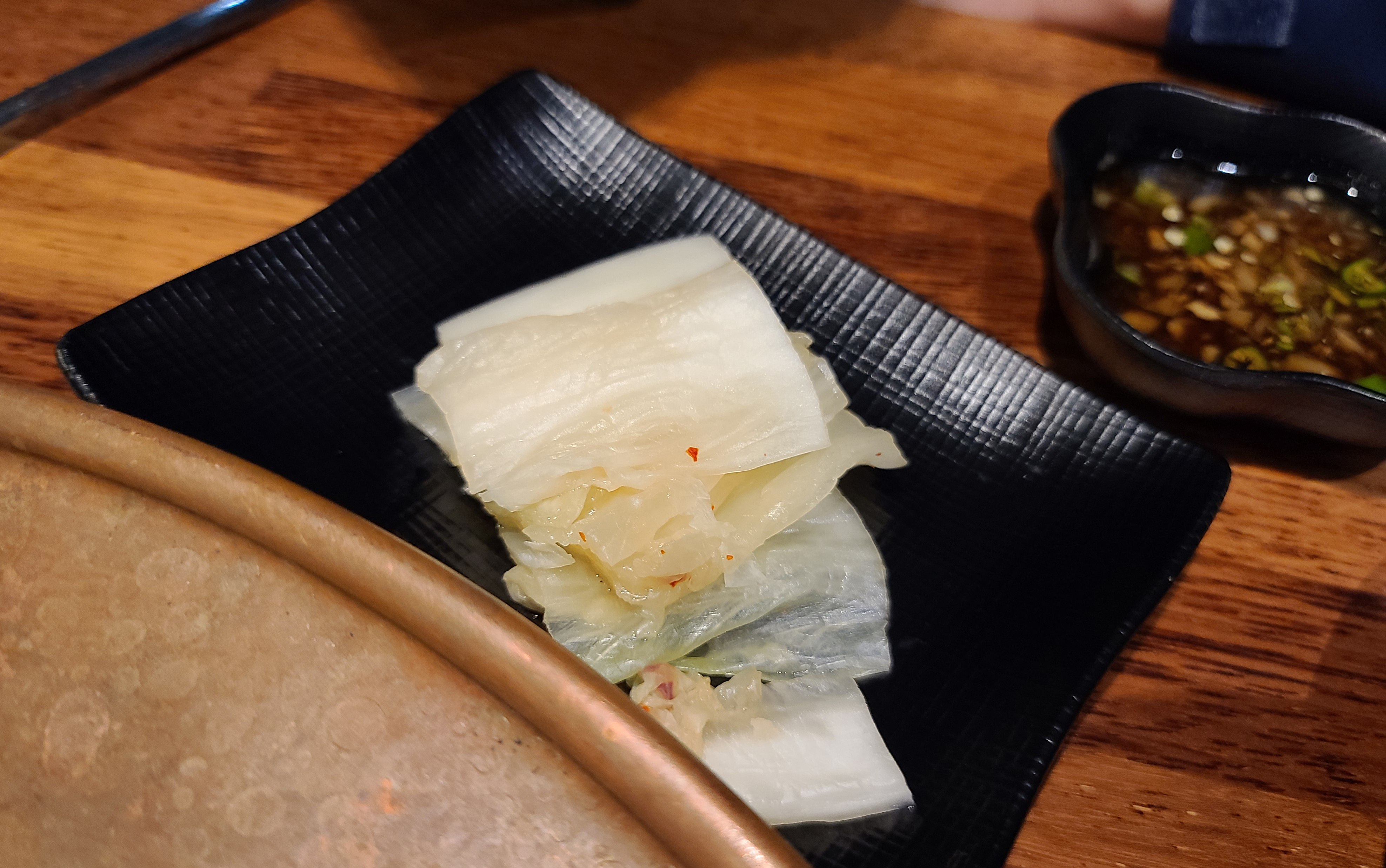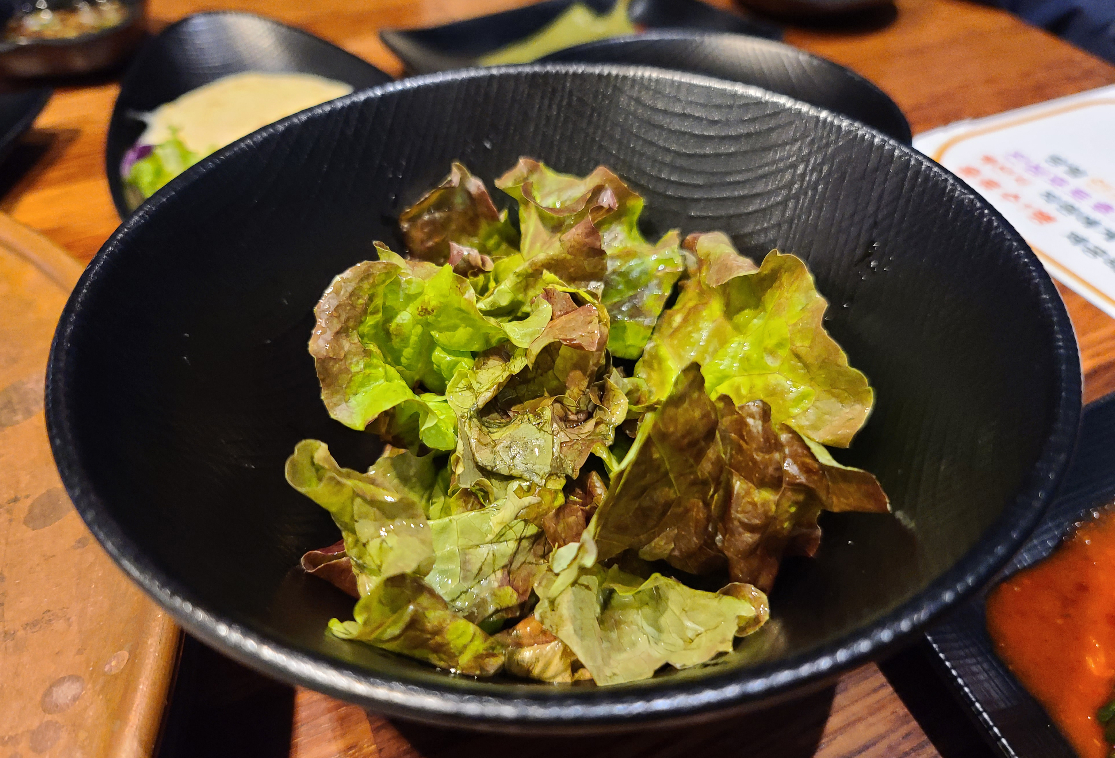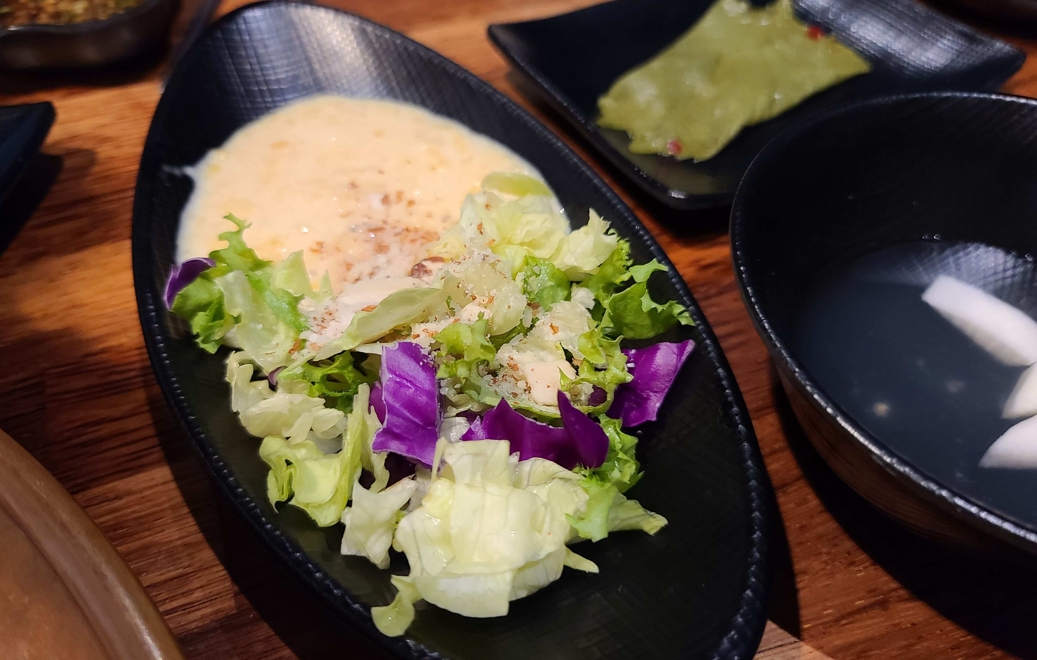 곧이어 밑반찬들이 준비되었습니다. 오이, 깻잎장, 상추무침, 백김치, 샐러드 등이 나왔고, 양곱창에 곁들일 소스도 함께 제공되었습니다. 반찬이 부족할 경우 셀프바를 통해 직접 가져다 먹을 수도 있었습니다.
