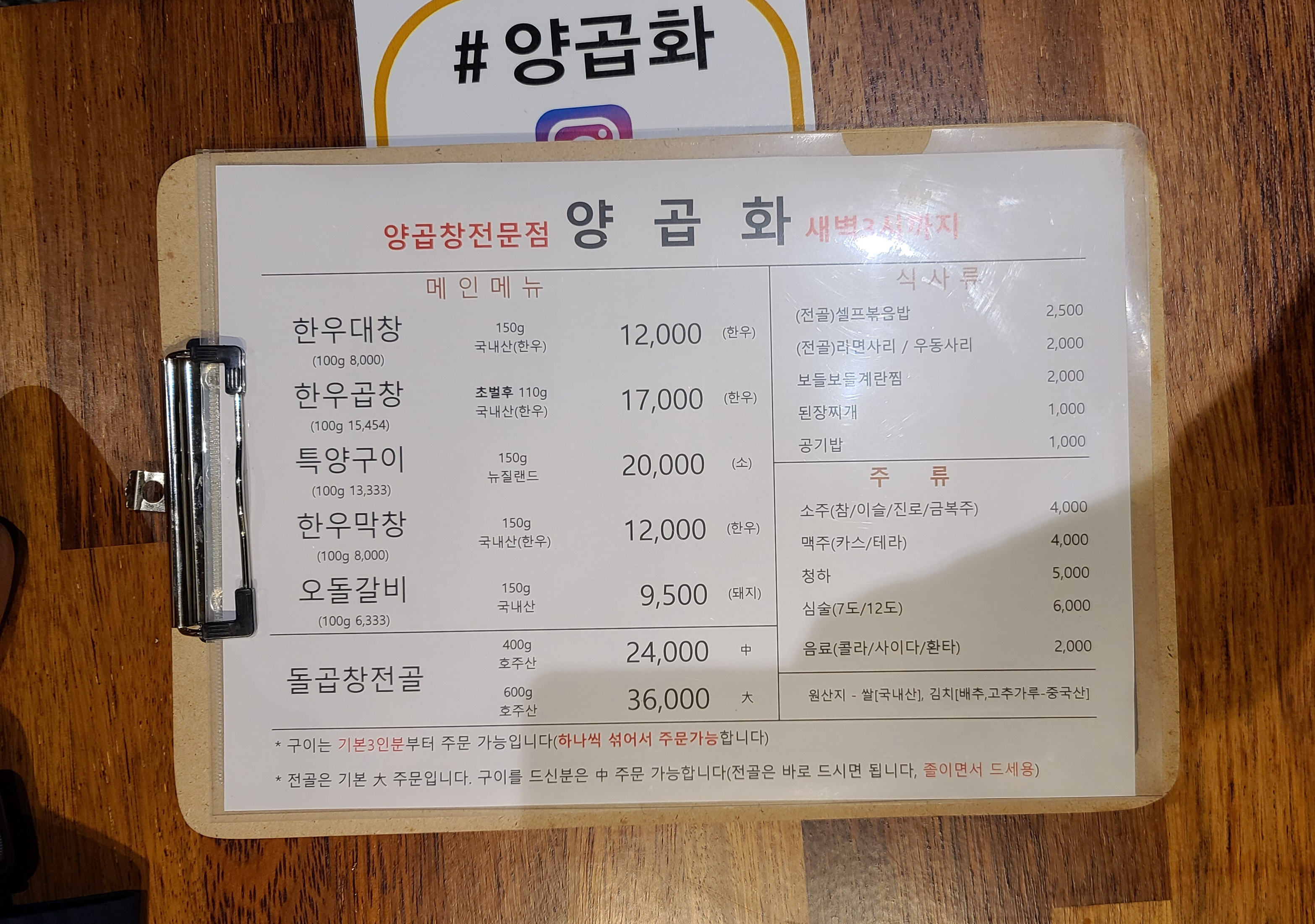 친구의 추천으로 양곱화의 소막창, 대창을 먹어보았는데, 역시나 추천해준 대로 맛있게 먹을 수 있었습니다. 구이메뉴만 먹기엔 좀 아쉬워서 전골도 주문했는데 전골도 맛있었습니다.