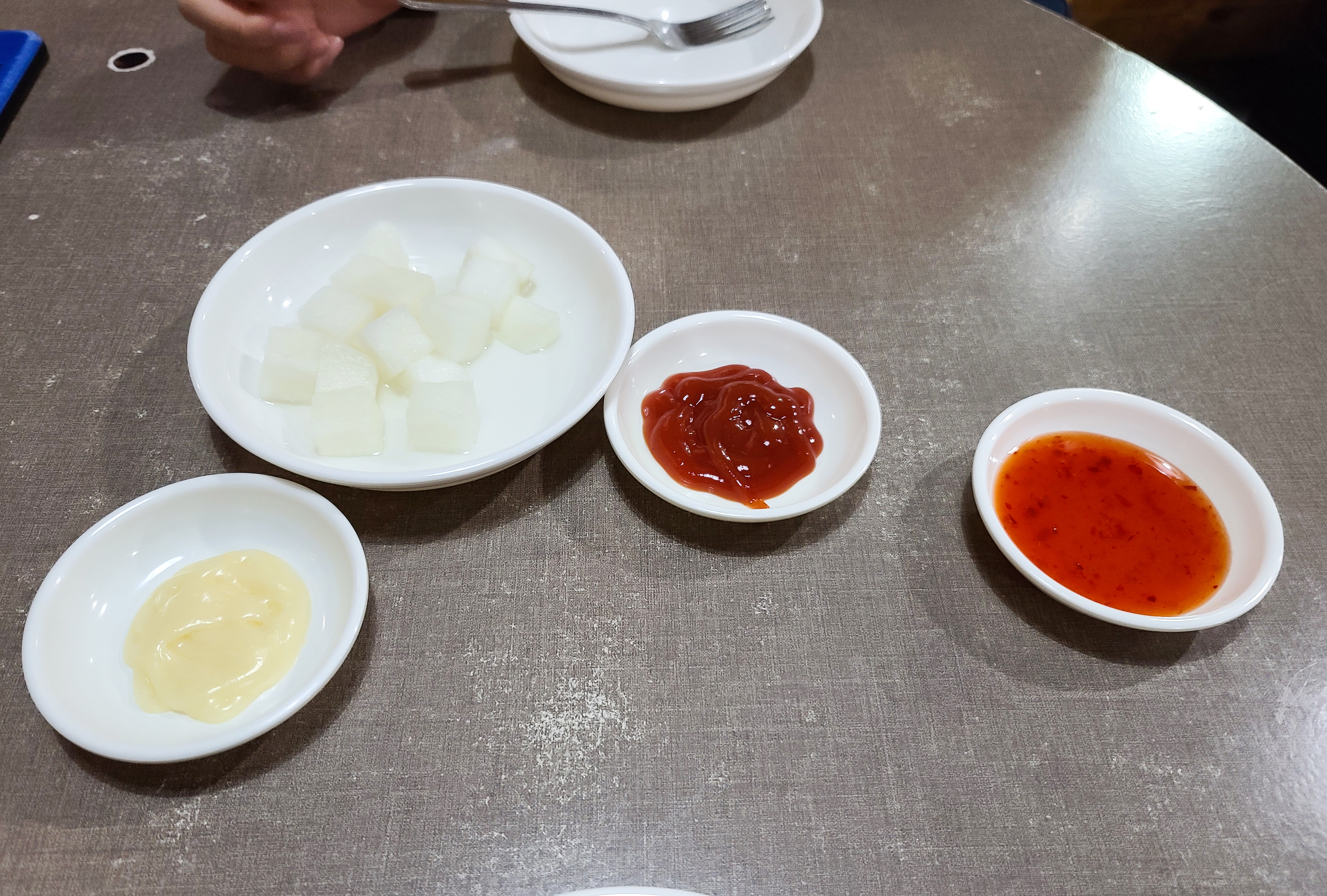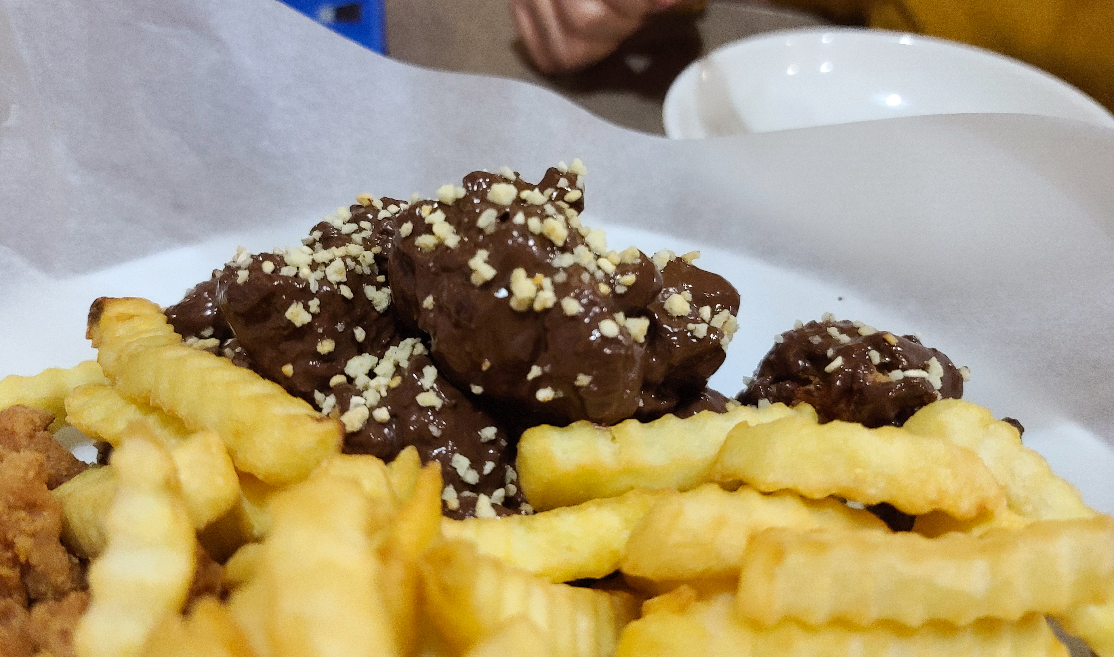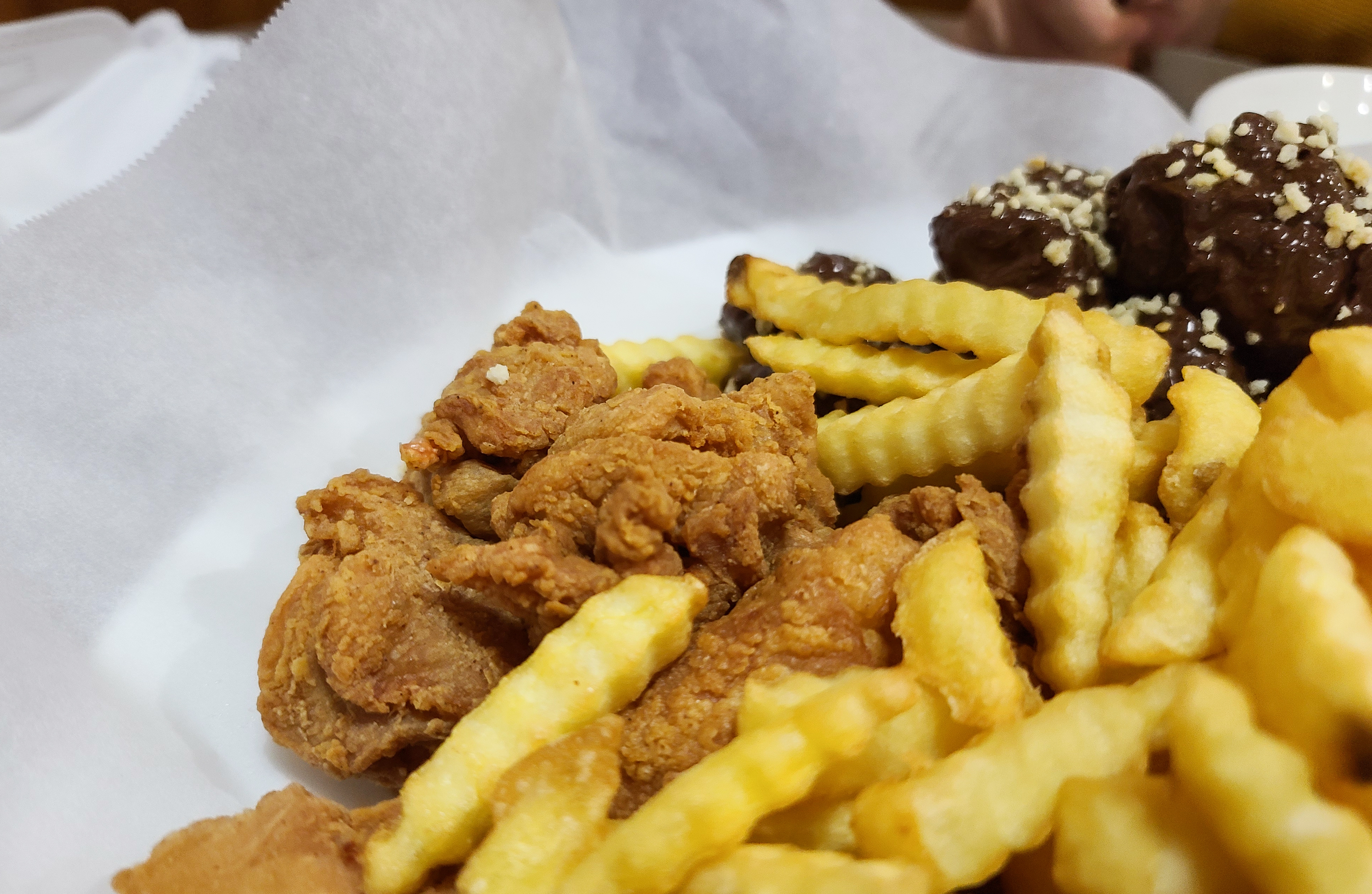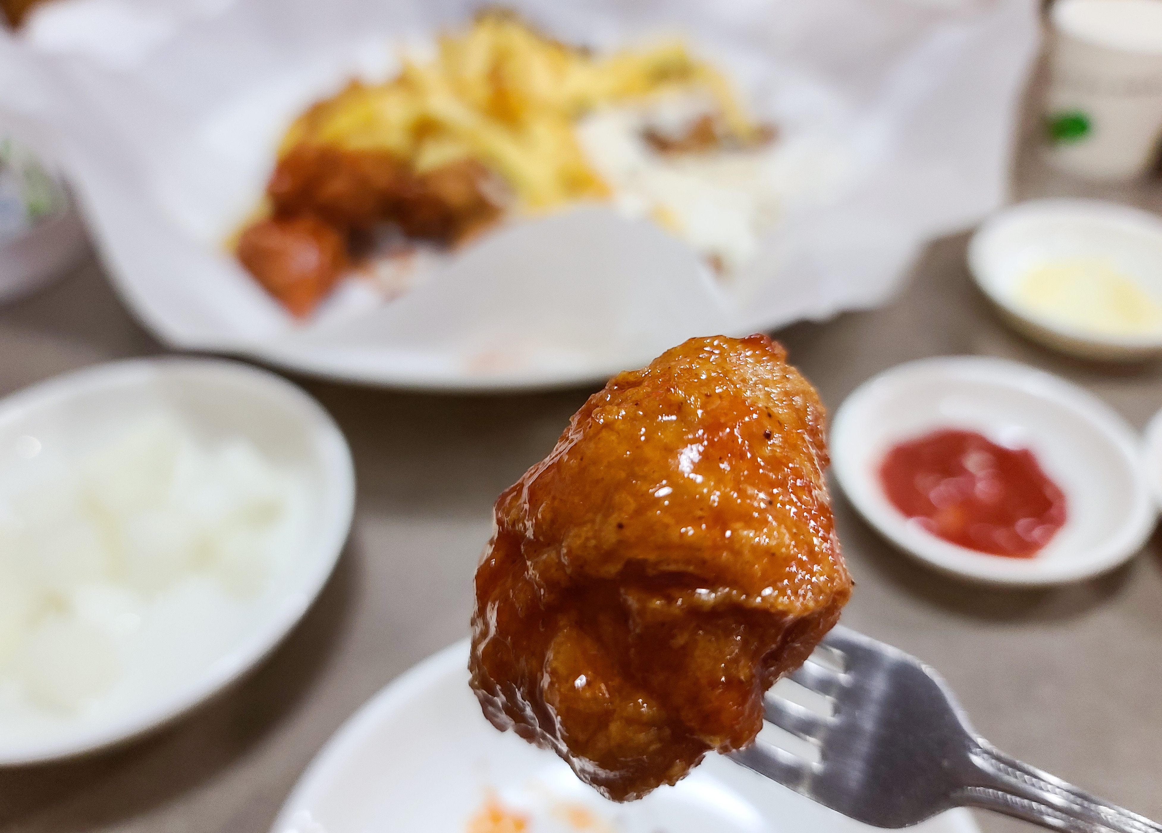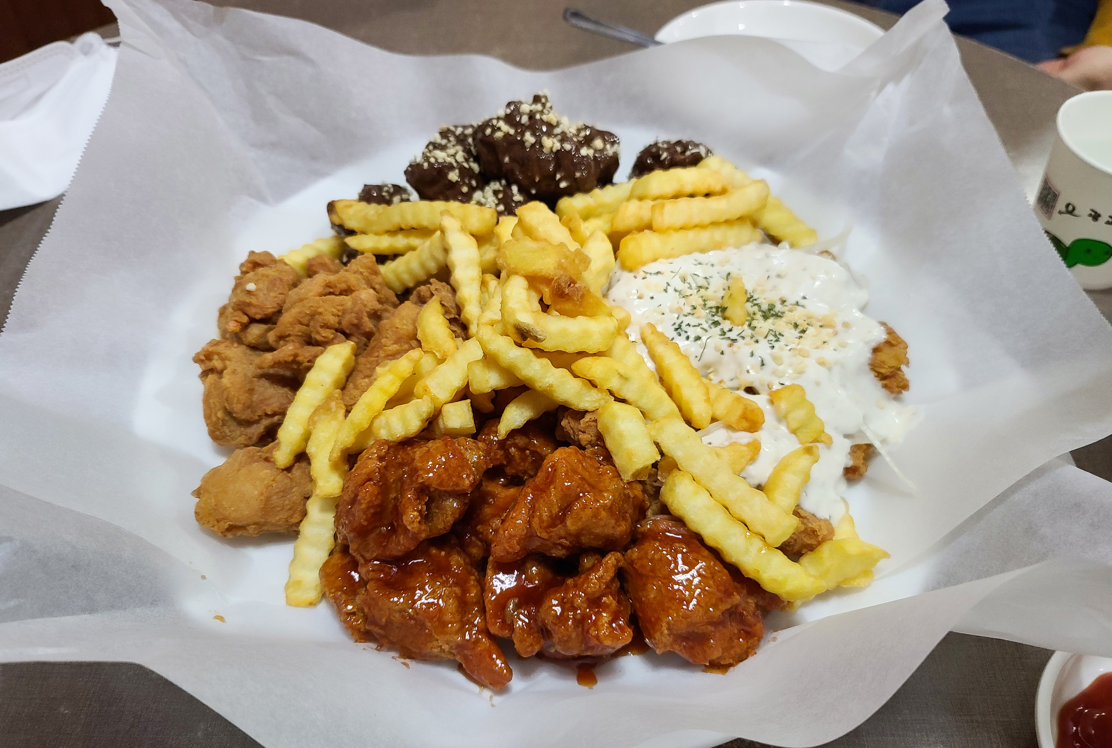 주문한 초콜릿 치킨이 등장하였고, 초콜릿 치킨에는 그냥 먹기에 부담스럽다며 감자튀김과 후라이드치킨, 양념치킨, 양파소스치킨이 함께 제공되었습니다. 다양한 메뉴들과 곁들여 먹을 수 있다는 데는 안심이 되었지만, 역시나 그 생각은 잠시뿐이었고, 초콜릿 치킨을 먹는 순간 입 안이 마비된 듯 다른 메뉴들의 맛은 잘 못 느끼고 초콜릿의 잔향만 입안을 맴돌았습니다.