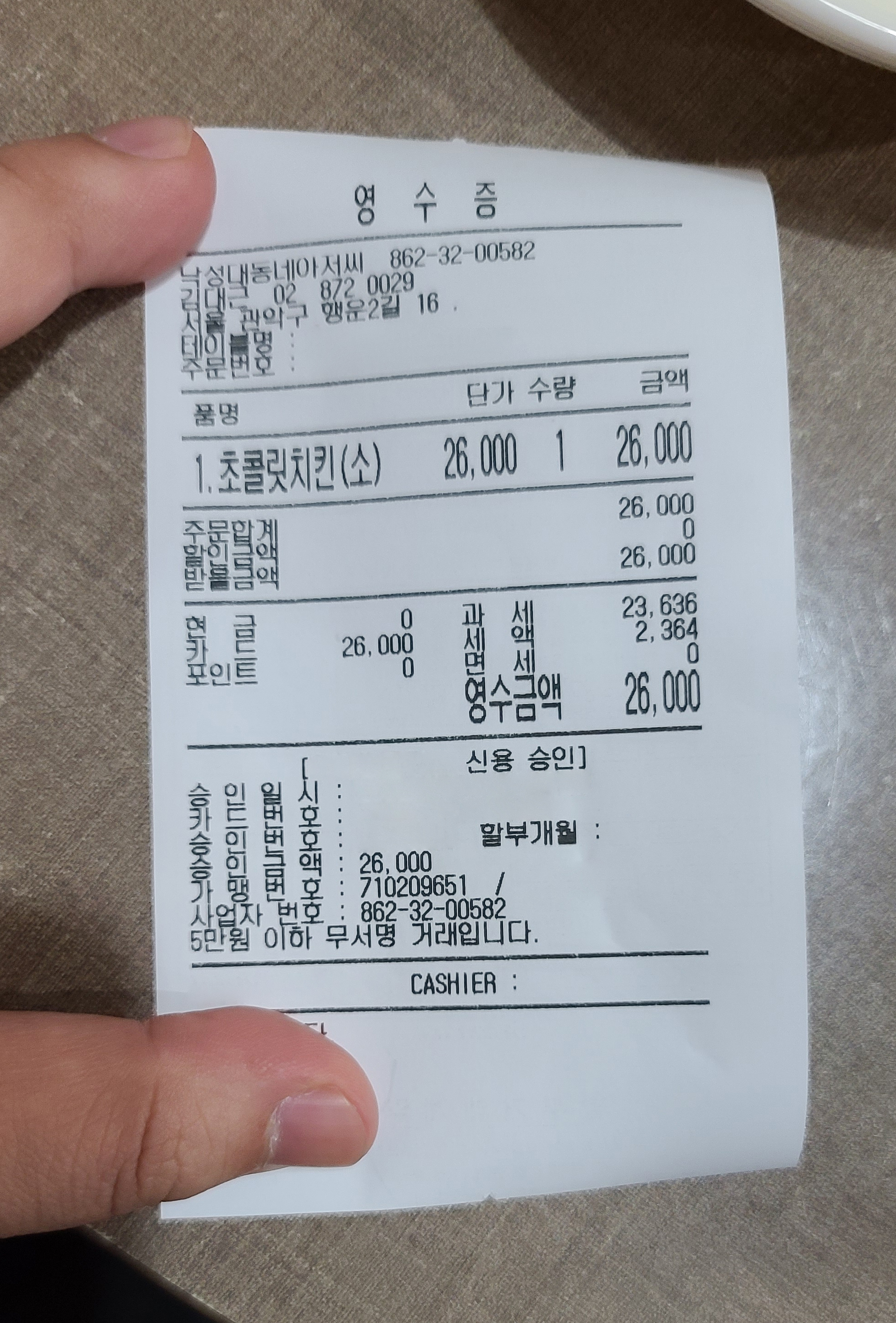 메뉴는 위와 같습니다. 초콜릿치킨, 클레이지치킨, 순살치킨, 뼈있는치킨, 치즈범벅, 치킨과친구들, 동아치, 충성치킨, 아정치, 아사치, 감자튀김, 감자새우튀김, 왕새우튀김 등이 있었습니다. 차마 초콜릿 치킨만 나오는 클레이지 치킨을 주문할 수 없어서 26,000원짜리 초콜릿 치킨으로 주문했습니다.