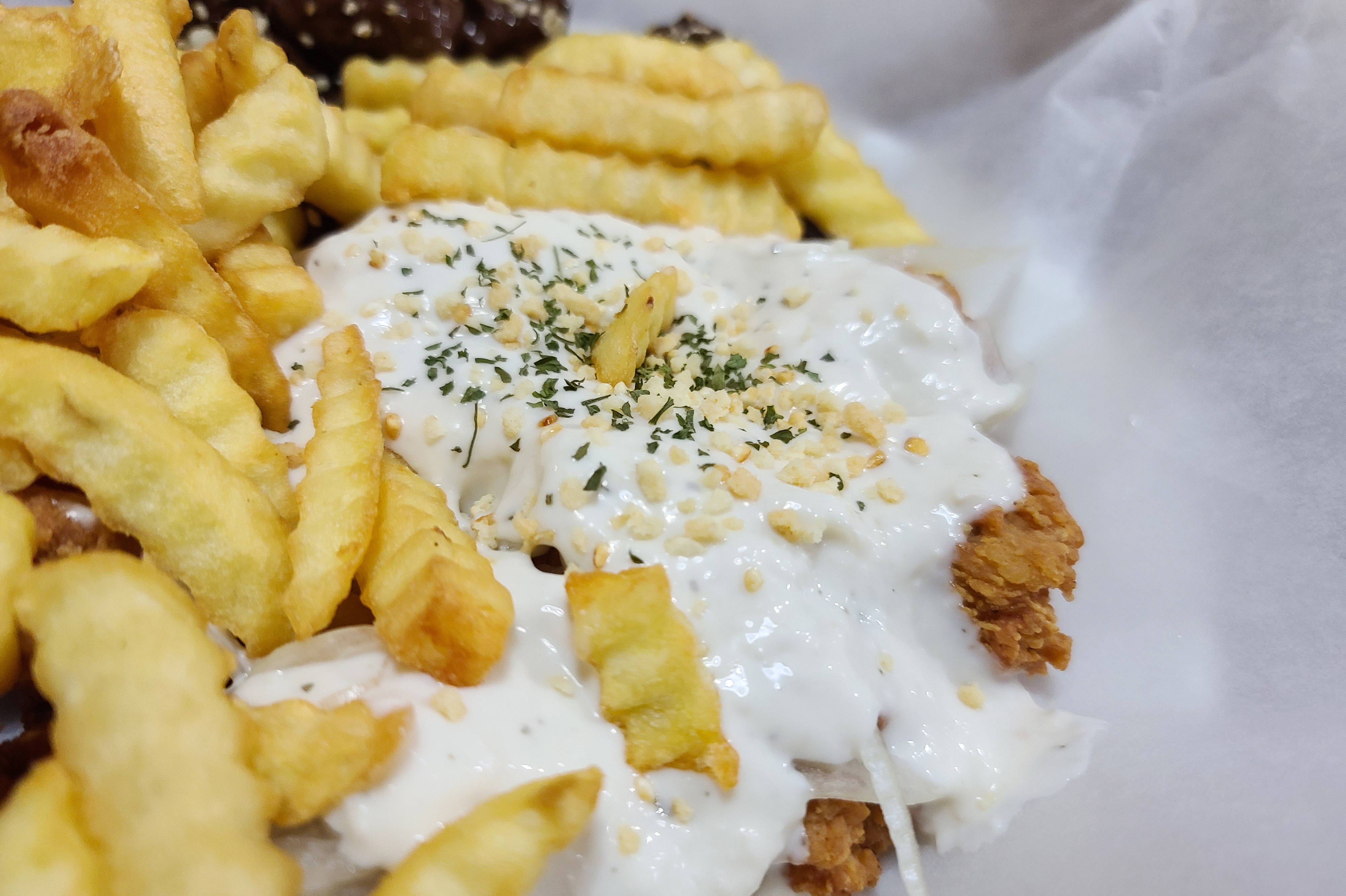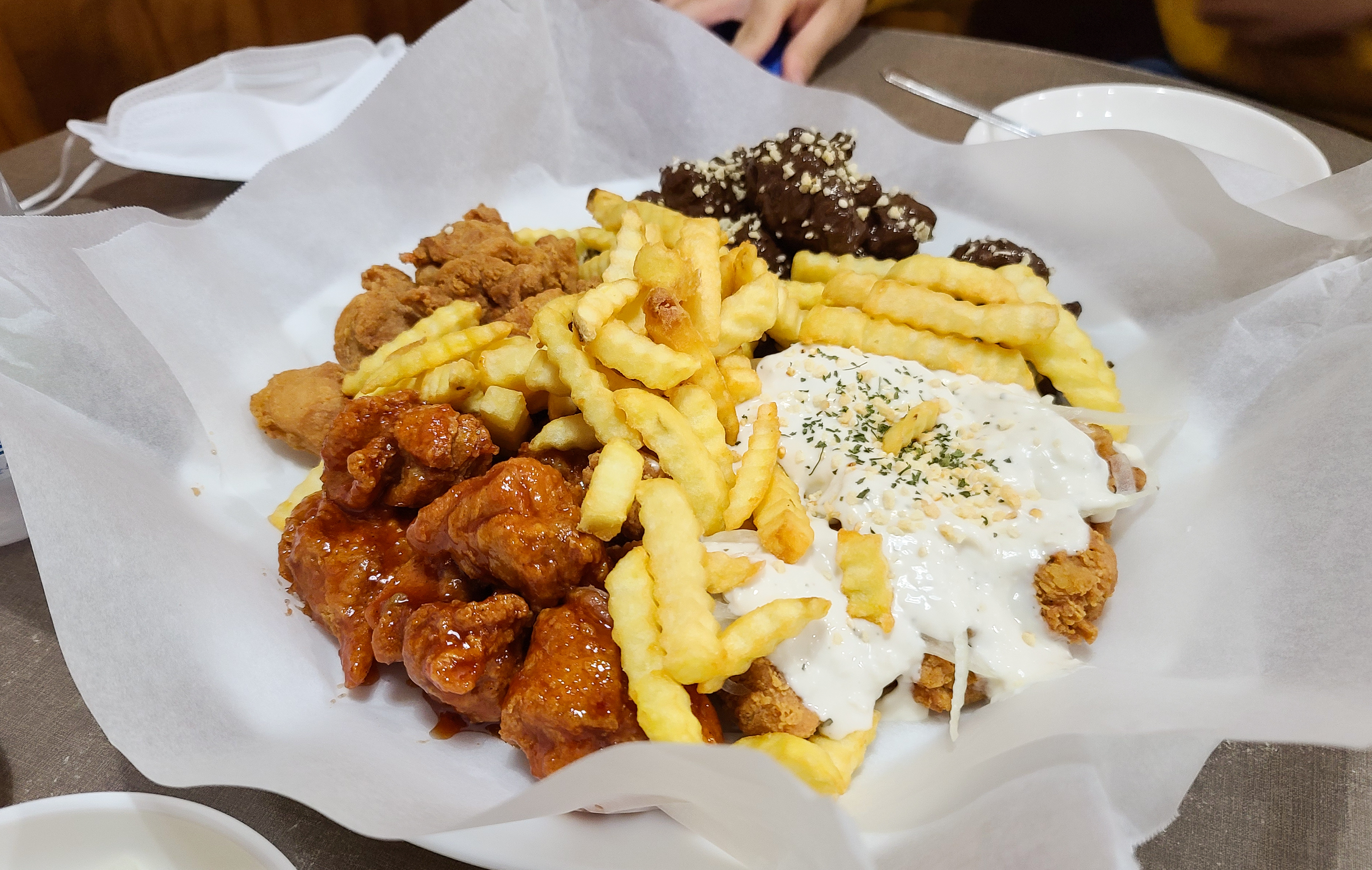 주문한 초콜릿 치킨이 등장하였고, 초콜릿 치킨에는 그냥 먹기에 부담스럽다며 감자튀김과 후라이드치킨, 양념치킨, 양파소스치킨이 함께 제공되었습니다. 다양한 메뉴들과 곁들여 먹을 수 있다는 데는 안심이 되었지만, 역시나 그 생각은 잠시뿐이었고, 초콜릿 치킨을 먹는 순간 입 안이 마비된 듯 다른 메뉴들의 맛은 잘 못 느끼고 초콜릿의 잔향만 입안을 맴돌았습니다.