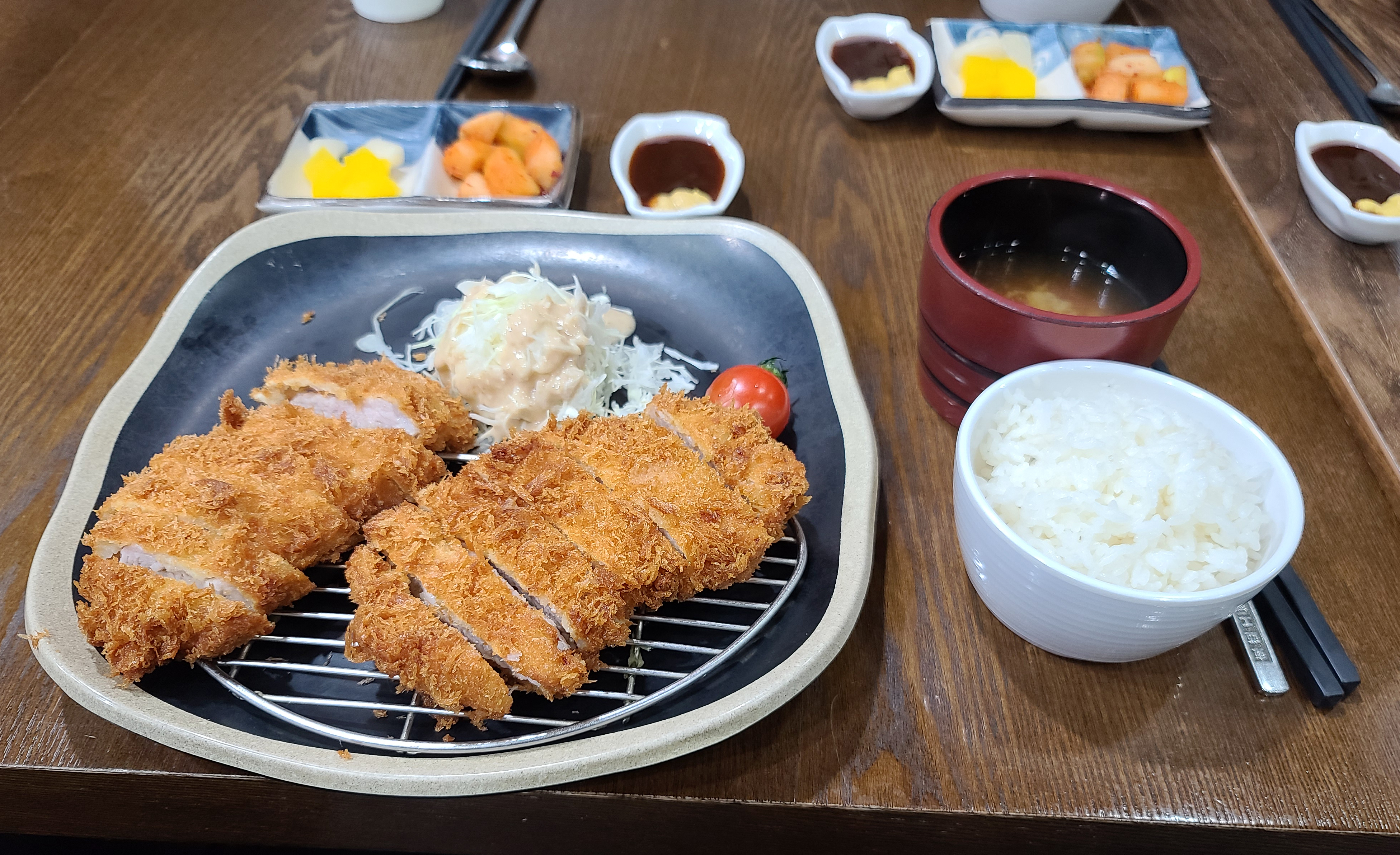 우선 제가 주문한 등심까스입니다. 정식 메뉴를 주문하면 대부분 작은 크기의 돈까스가 제공되기에 저는 양껏 먹고 싶어서 등심까스로 주문했습니다. 밑반찬으로 단무지, 락교, 깍두기가 제공되었고, 우스터소스에 겨자가 곁들여져 소스로 제공되었습니다. 그밖에 장국과 공기밥이 나왔고, 등심까스는 바삭한 튀김옷에 촉촉한 등심 고기를 머금고 있는 돈까스였습니다. 샐러드와 방울토마토가 함께 제공되었는데, 일단 다른 메뉴들도 함께 살펴보고 오시죠.