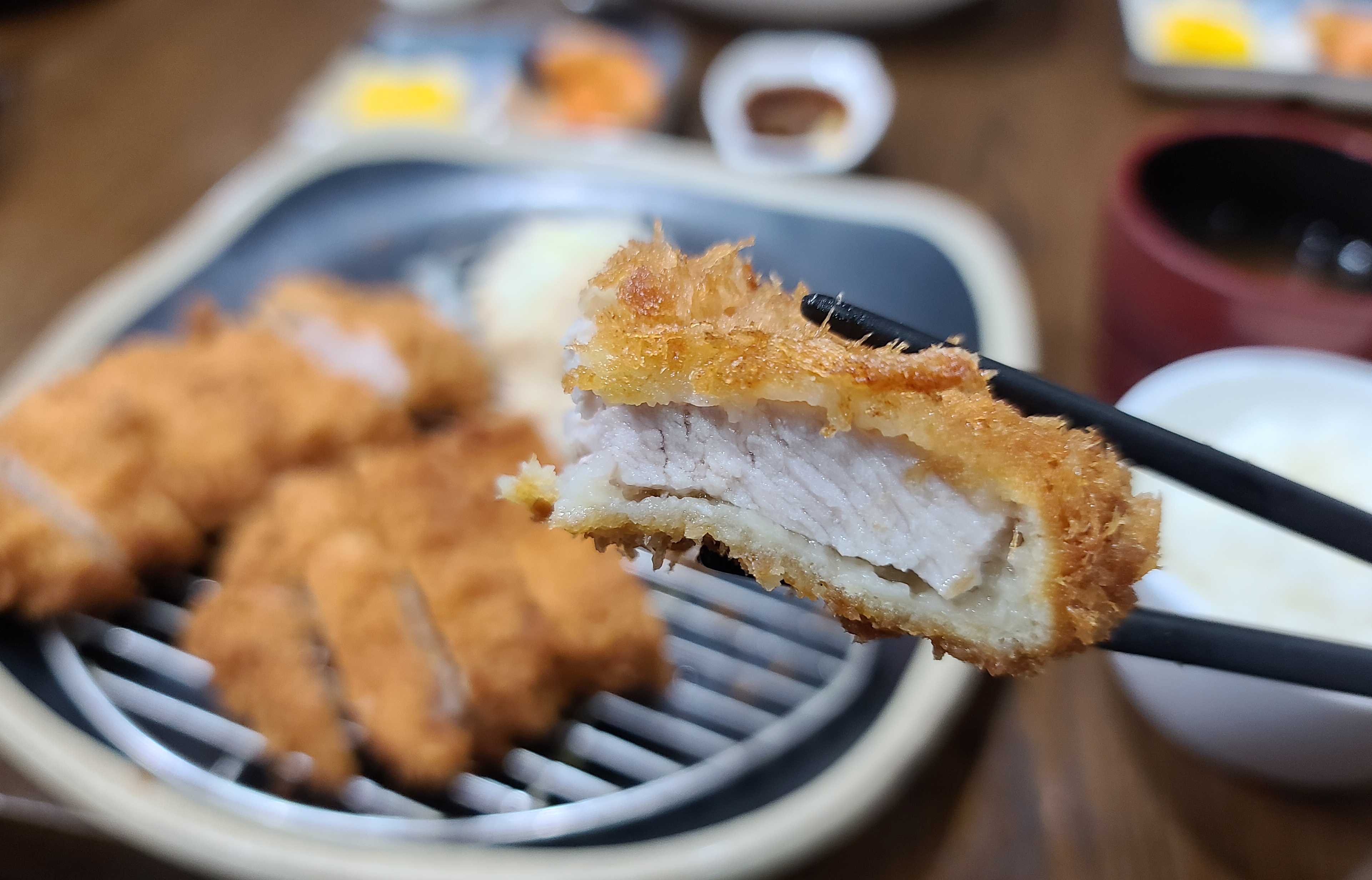 다른 메뉴인 냉모밀, 돈까스나베, 돈까스정식의 메뉴가 나왔습니다. 냉모밀은 양이 넉넉해 보이고, 맛있어 보이더라고요. 돈까스나베도 혼자 먹기에 부족함은 없어 보였는데, 돈까스정식은 맛보기용 돈까스가 나온 줄 알고 놀랐었죠. 그나마 등심까스를 주문한 저는 2 덩어리 다 큼직(?)하게 제공된 반면, 돈까스정식은 우동이 나온다는 것 때문인지 미니어쳐 돈까스가 제공되었기 때문이죠.