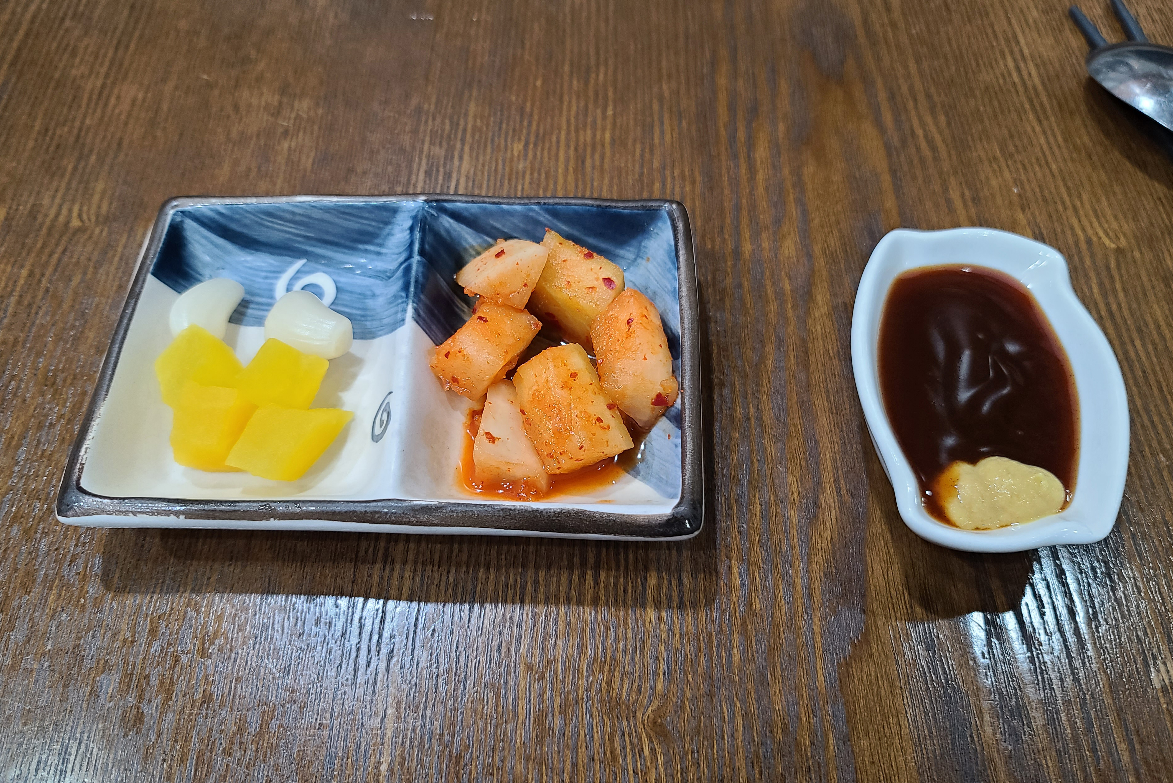 우선 제가 주문한 등심까스입니다. 정식 메뉴를 주문하면 대부분 작은 크기의 돈까스가 제공되기에 저는 양껏 먹고 싶어서 등심까스로 주문했습니다. 밑반찬으로 단무지, 락교, 깍두기가 제공되었고, 우스터소스에 겨자가 곁들여져 소스로 제공되었습니다. 그밖에 장국과 공기밥이 나왔고, 등심까스는 바삭한 튀김옷에 촉촉한 등심 고기를 머금고 있는 돈까스였습니다. 샐러드와 방울토마토가 함께 제공되었는데, 일단 다른 메뉴들도 함께 살펴보고 오시죠.