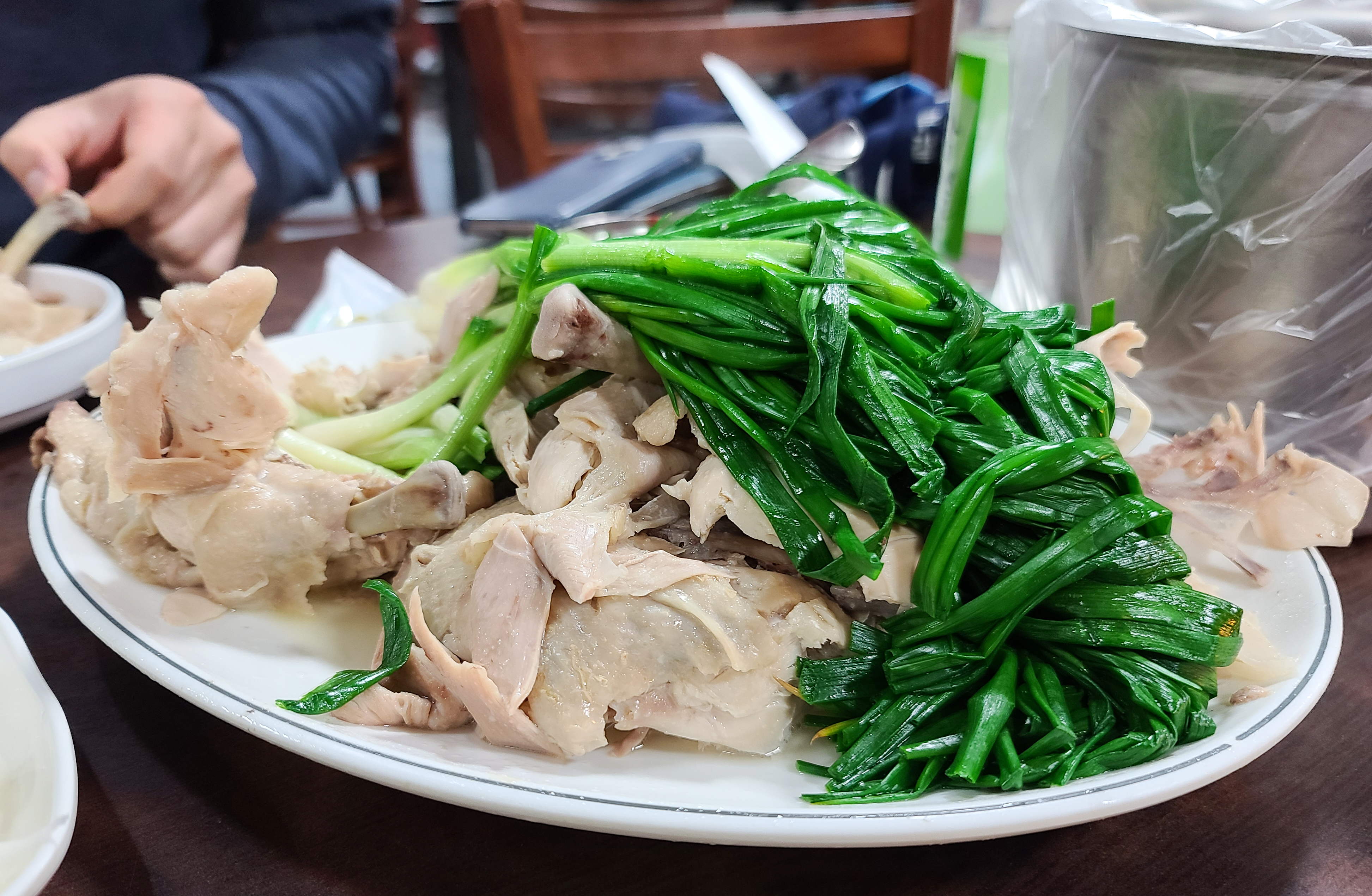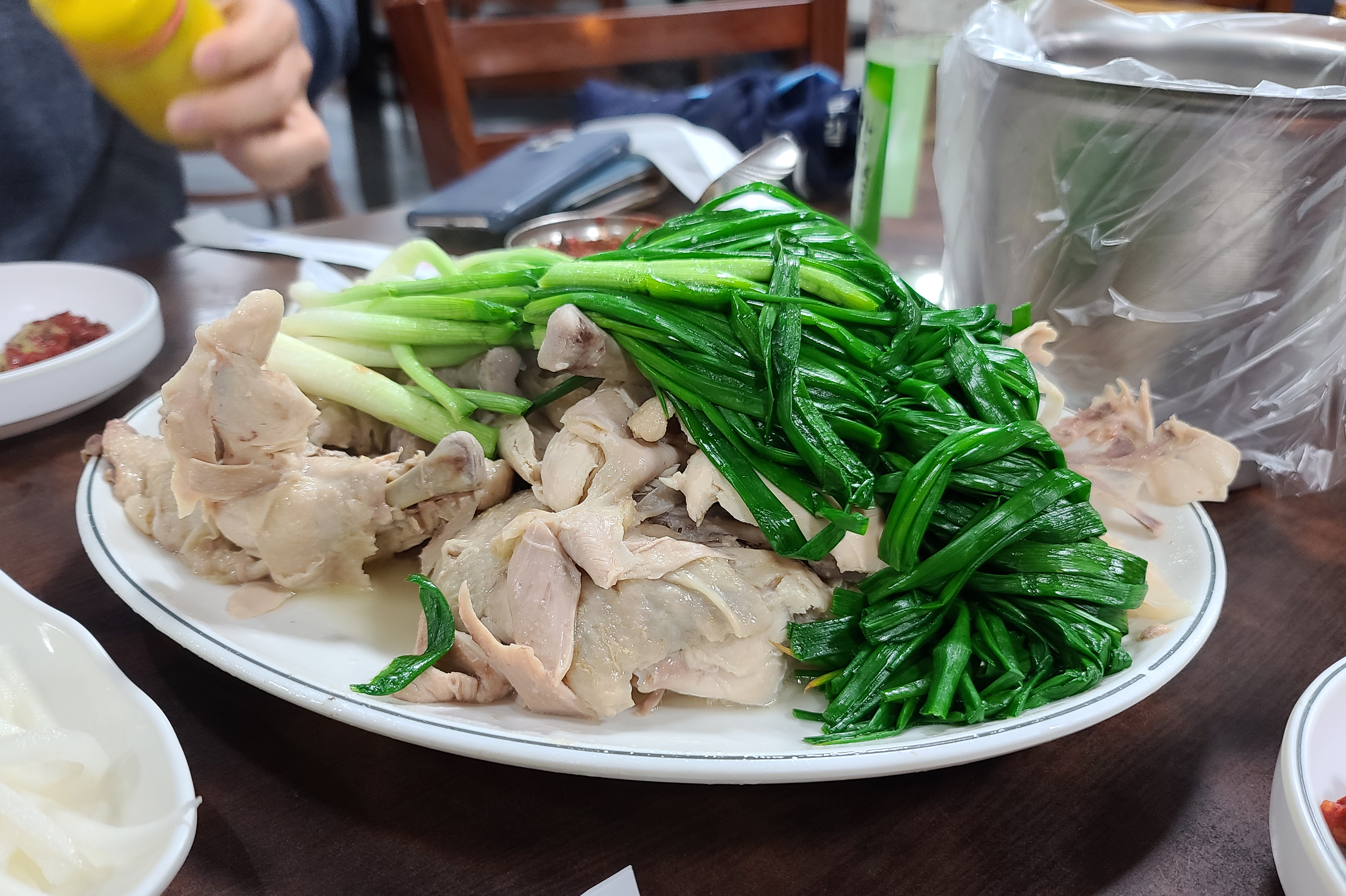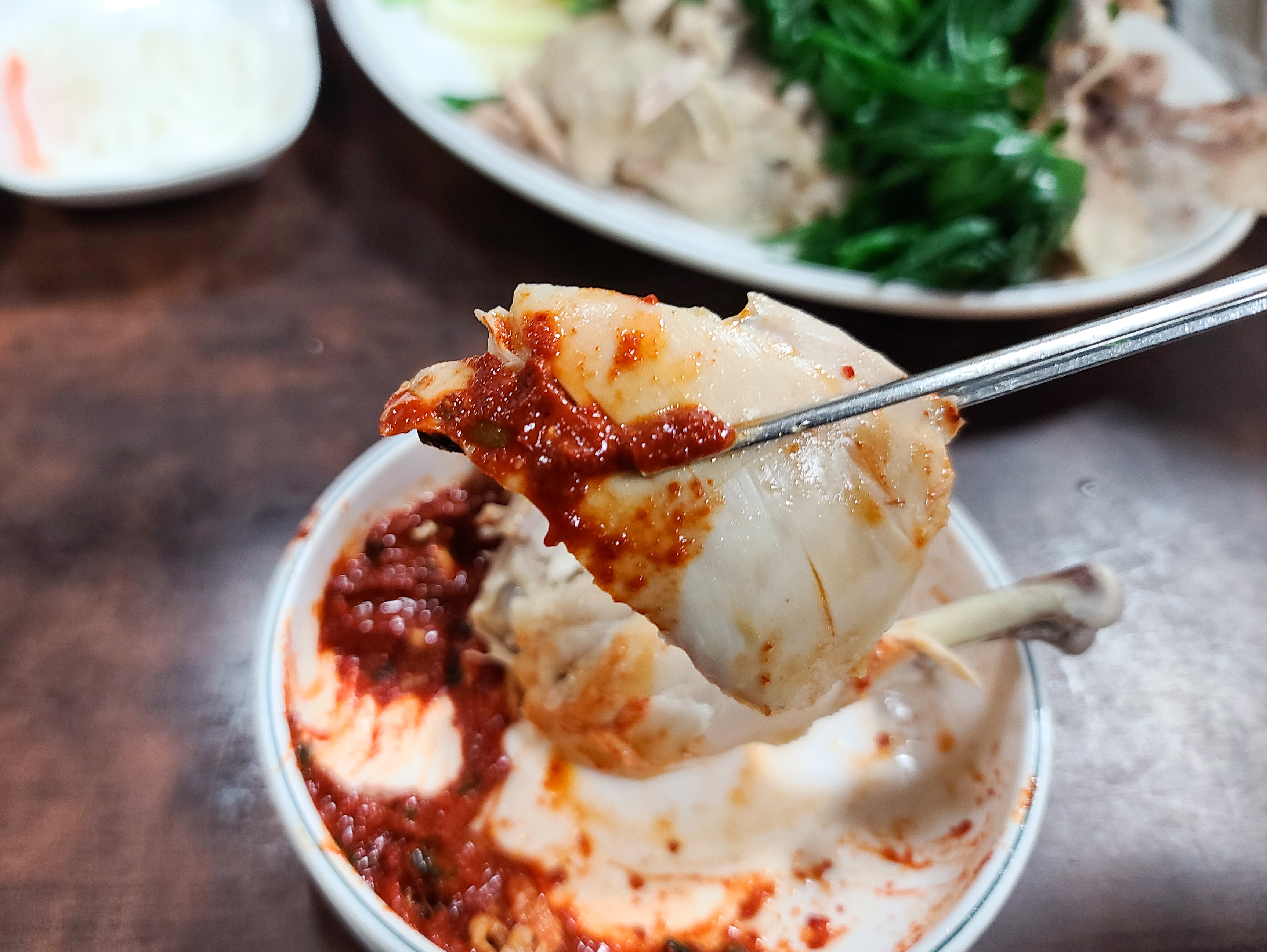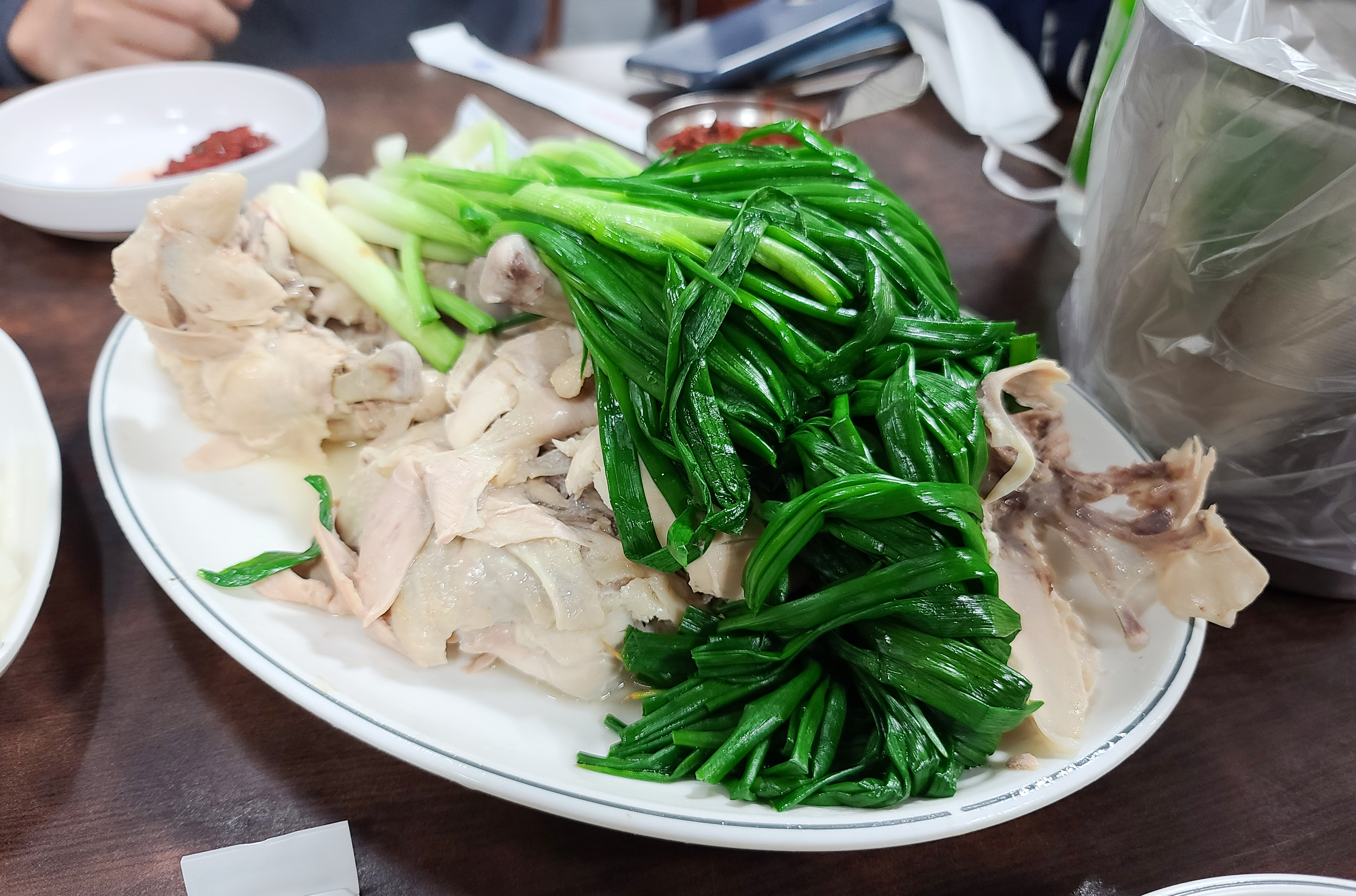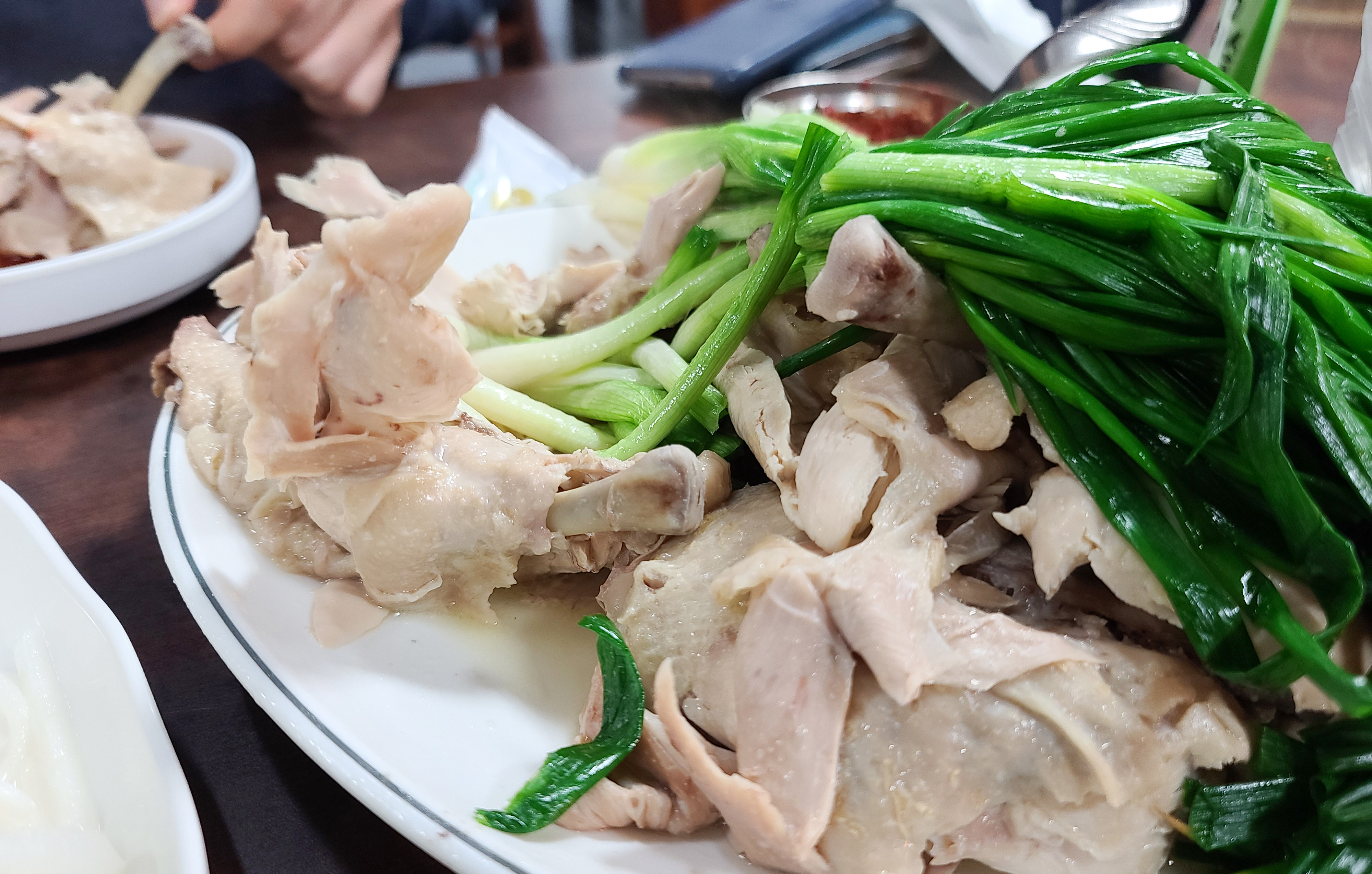 이북식 찜닭은 닭과 쪽파를 함께 쪄내어 담백한 맛이 특징인 찜닭이었는데, 우리가 아는 간장 양념에 졸여낸 찜닭과는 사뭇 다른 모습이라 만포막국수의 찜닭을 모르고 방문하였다면 생소할 수도 있을 것 같습니다.