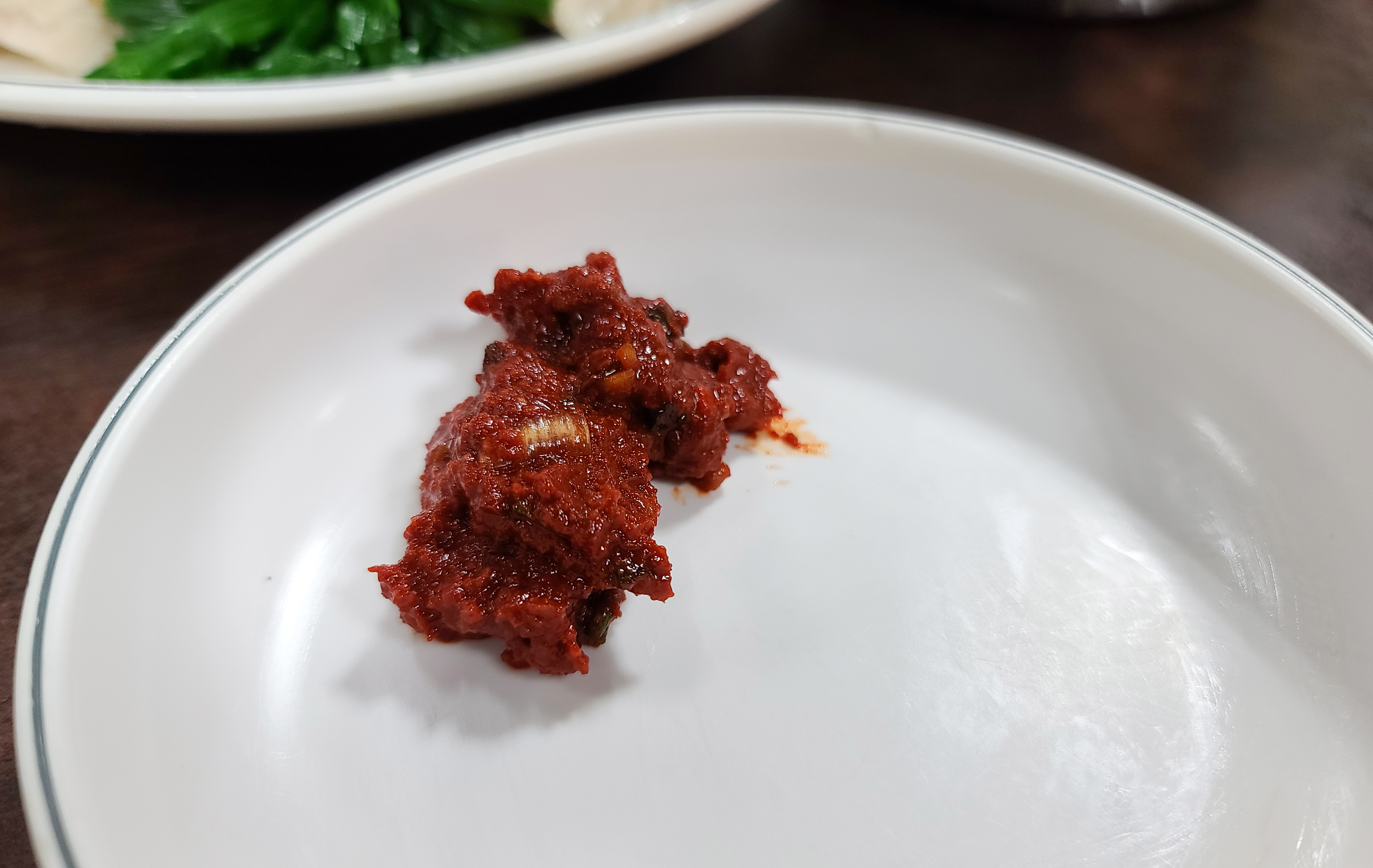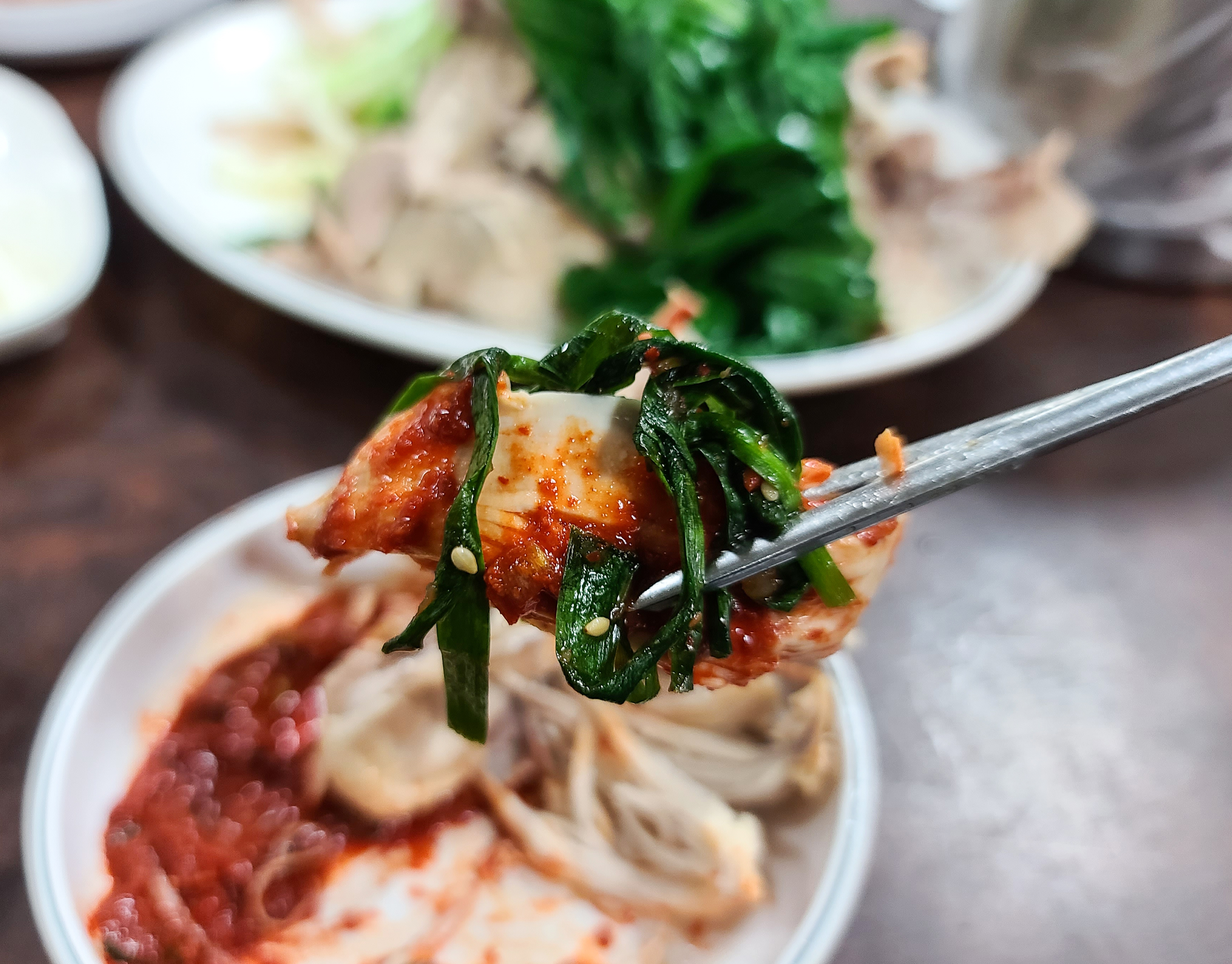 만포막국수 찜닭용 양념장에 식초, 겨자 등을 섞고 양념장에 닭고기를 찍어서 먹었습니다. 찜닭은 굉장히 부드럽고 담백한 맛이 일품이었으며, 양념장 또한 너무 자극적이지 않고 닭고기와 잘 어울렸습니다. 닭고기는 부추무침과 먹어도 맛있었고, 쪽파와 곁들여도 맛있게 먹을 수 있었습니다.