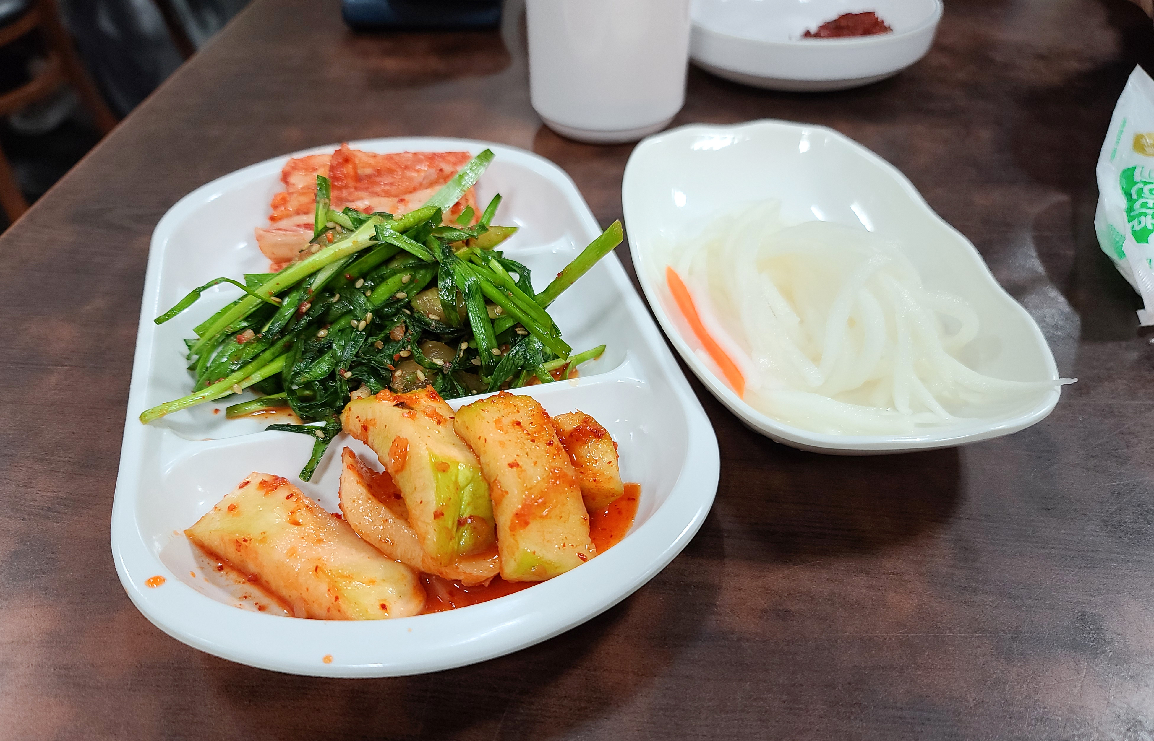 찜닭은 미리 준비되어 있었는지, 주문하고 거의 동시에 반찬과 함께 제공되었습니다. 반찬은 무김치, 부추무침, 배추김치, 무채 등이 있었는데 반찬들이 전체적으로 맛깔나게 맛있었습니다. 쪽파로 덮여 나온 찜닭은 겉보기에도 부드러워 보였습니다.