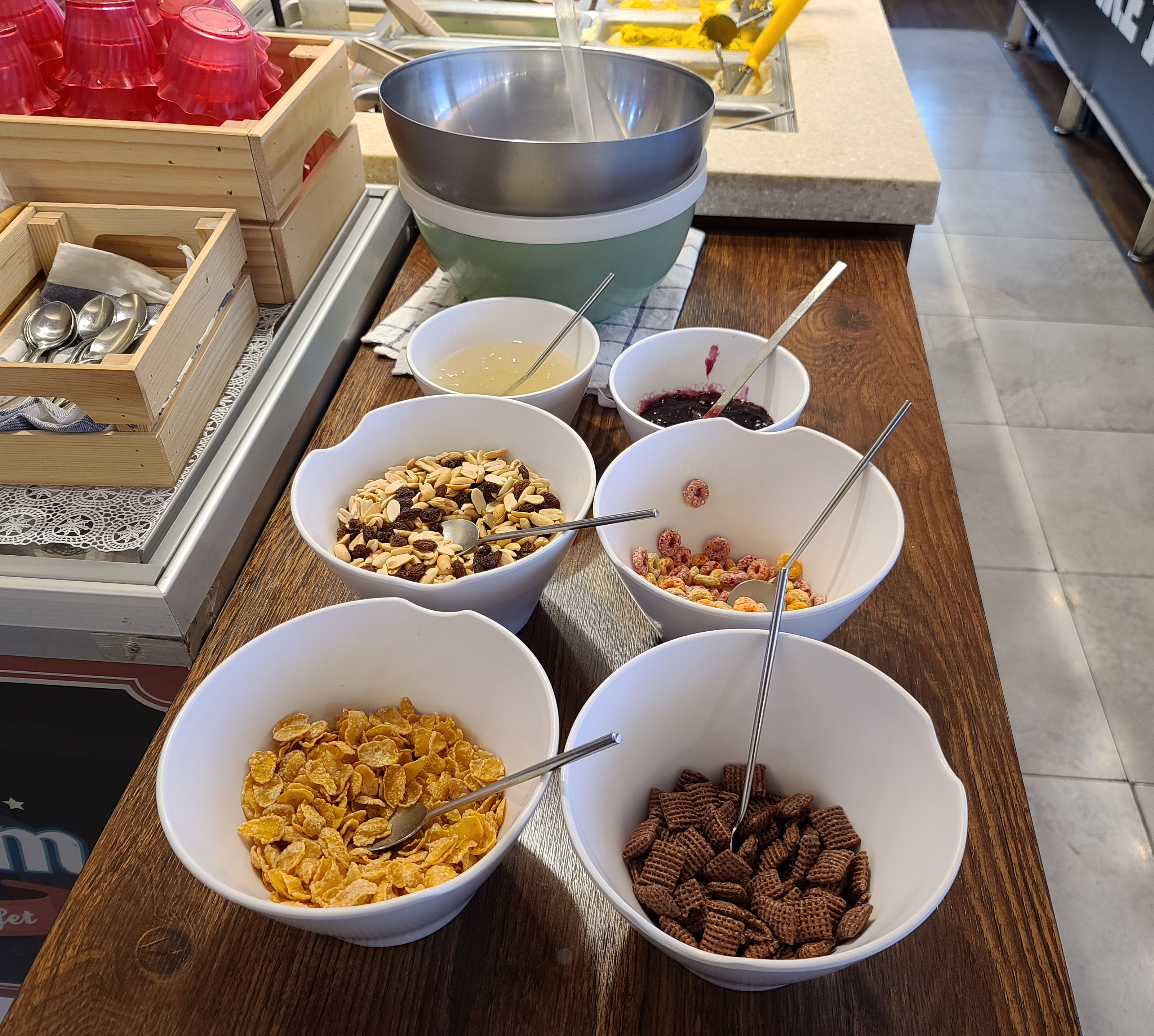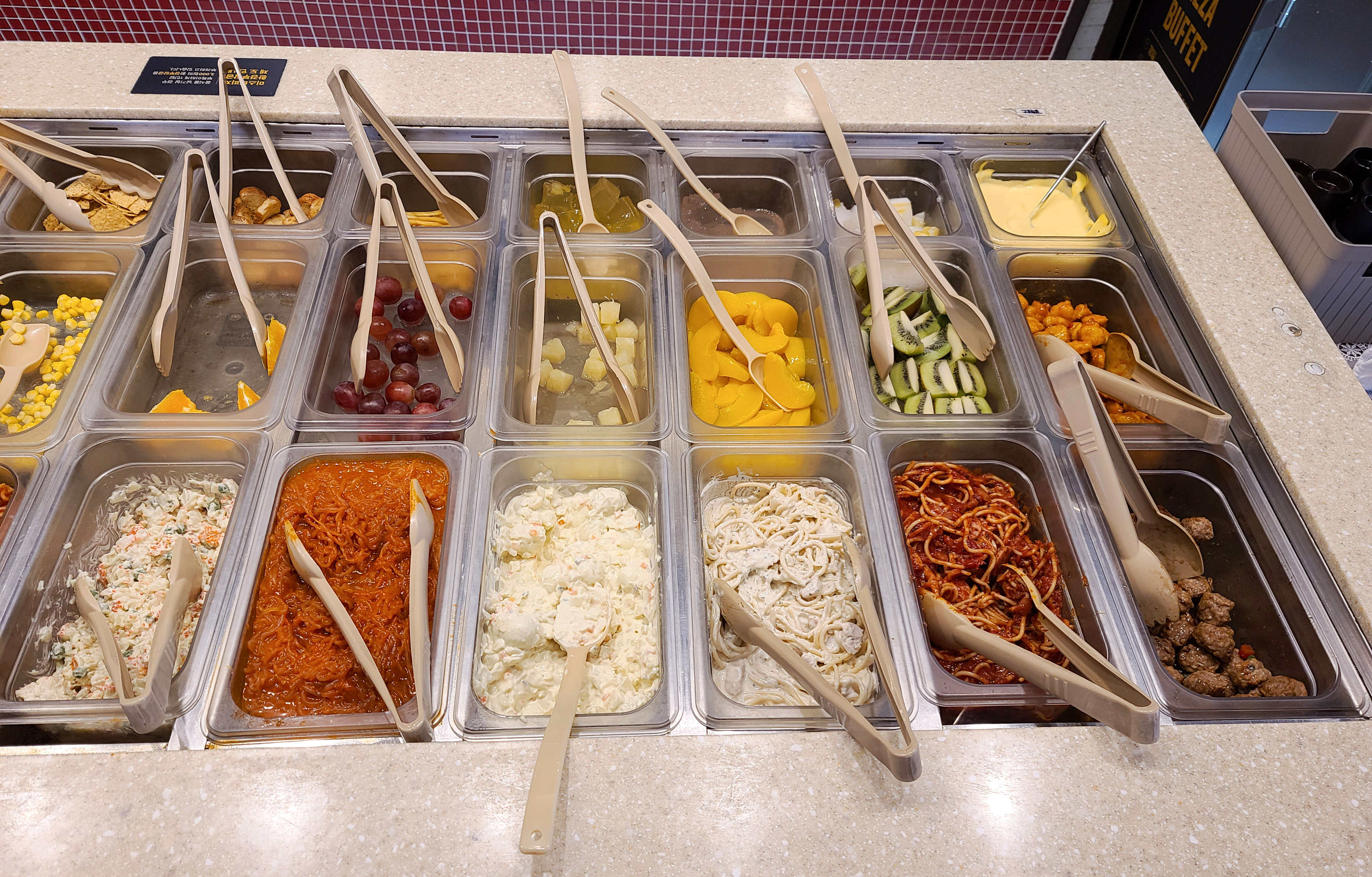 특히 탄산음료와 샐러드를 마음껏 골라먹을 수 있는 코너에서는 제가 좋아하는 치즈들도 많이 있고, 단호박샐러드, 감자샐러드, 계란샐러드, 계절과일, 시리얼 및 파스타까지 다양하게 갖추어져 있었습니다. 저는 요즘 샌드위치에 넣어먹는 계란 샐러드가 왜 이리도 맛있는지 계란 샐러드만 집중적으로 먹었습니다.