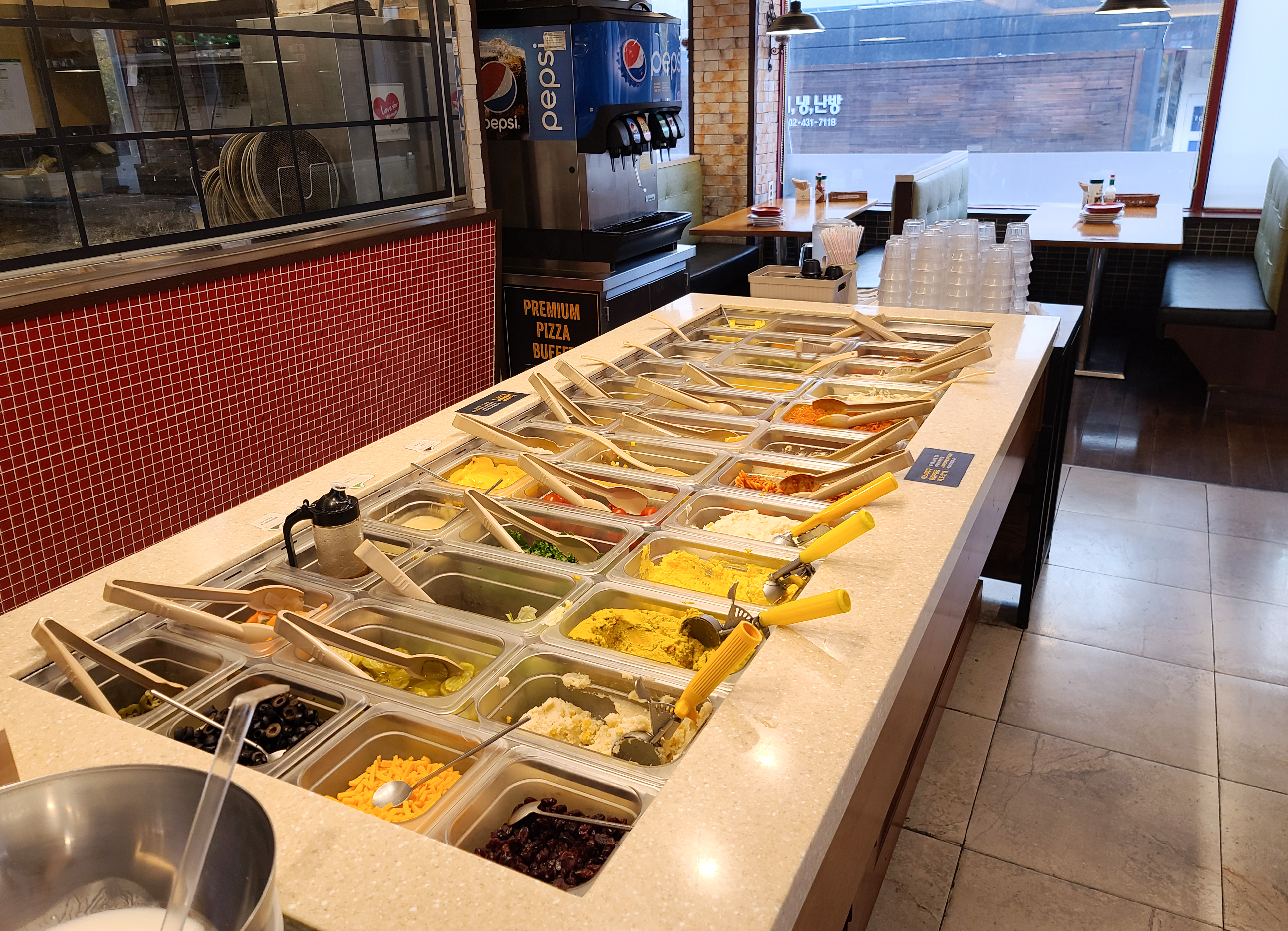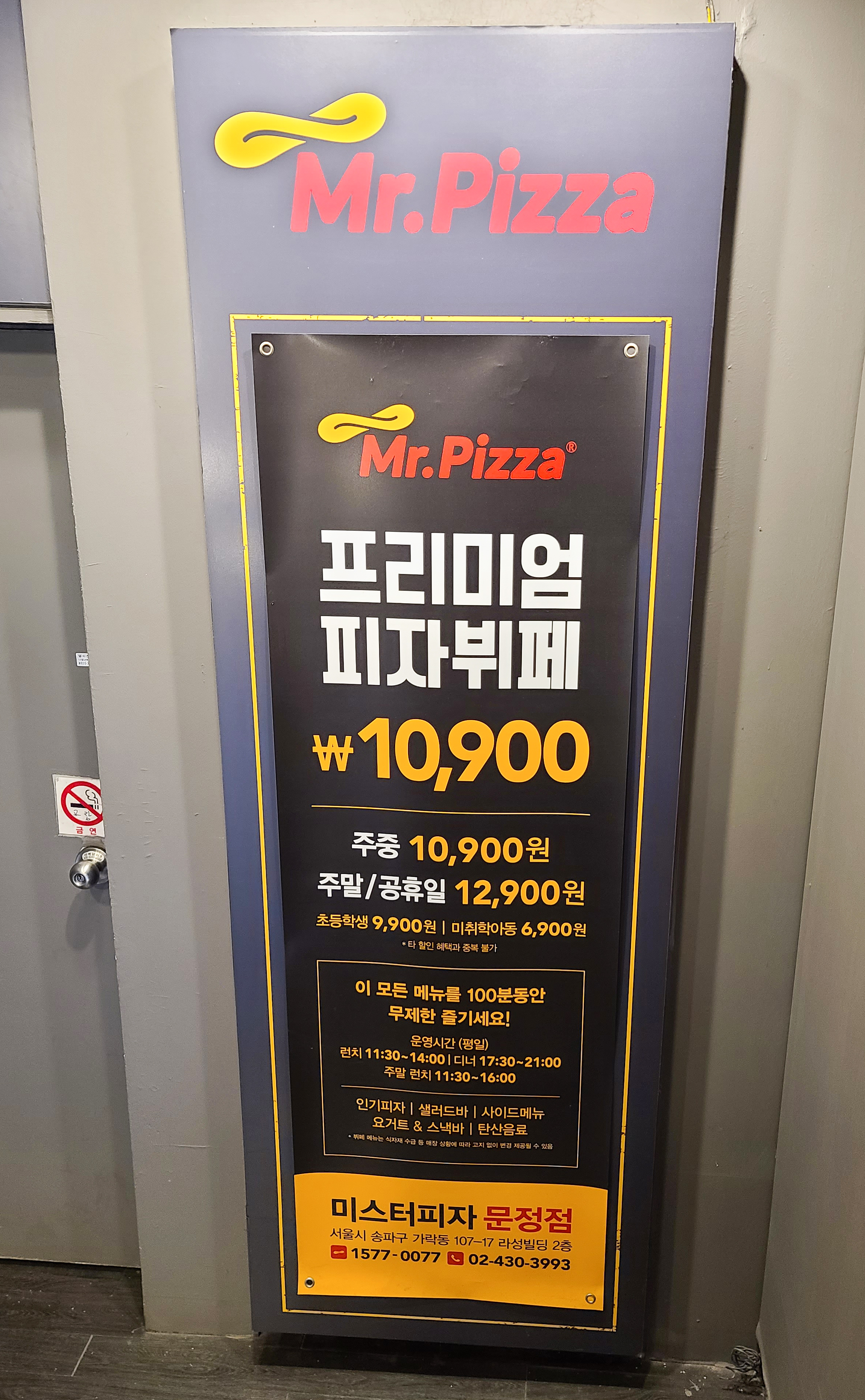 미스터피자의 피자뷔페는 평일 10,900원 주말 및 공휴일은 12,900원이라는 가격에 피자 및 샐러드바를 이용할 수 있는 가성비 피자 뷔페입니다. 100분이라는 시간 동인 자유롭게 매장 내 음식과 음료를 맛볼 수 있는데, 사실 말이 100분이지 시간을 다 채워가며 먹기엔 많이 힘이 들더라고요.