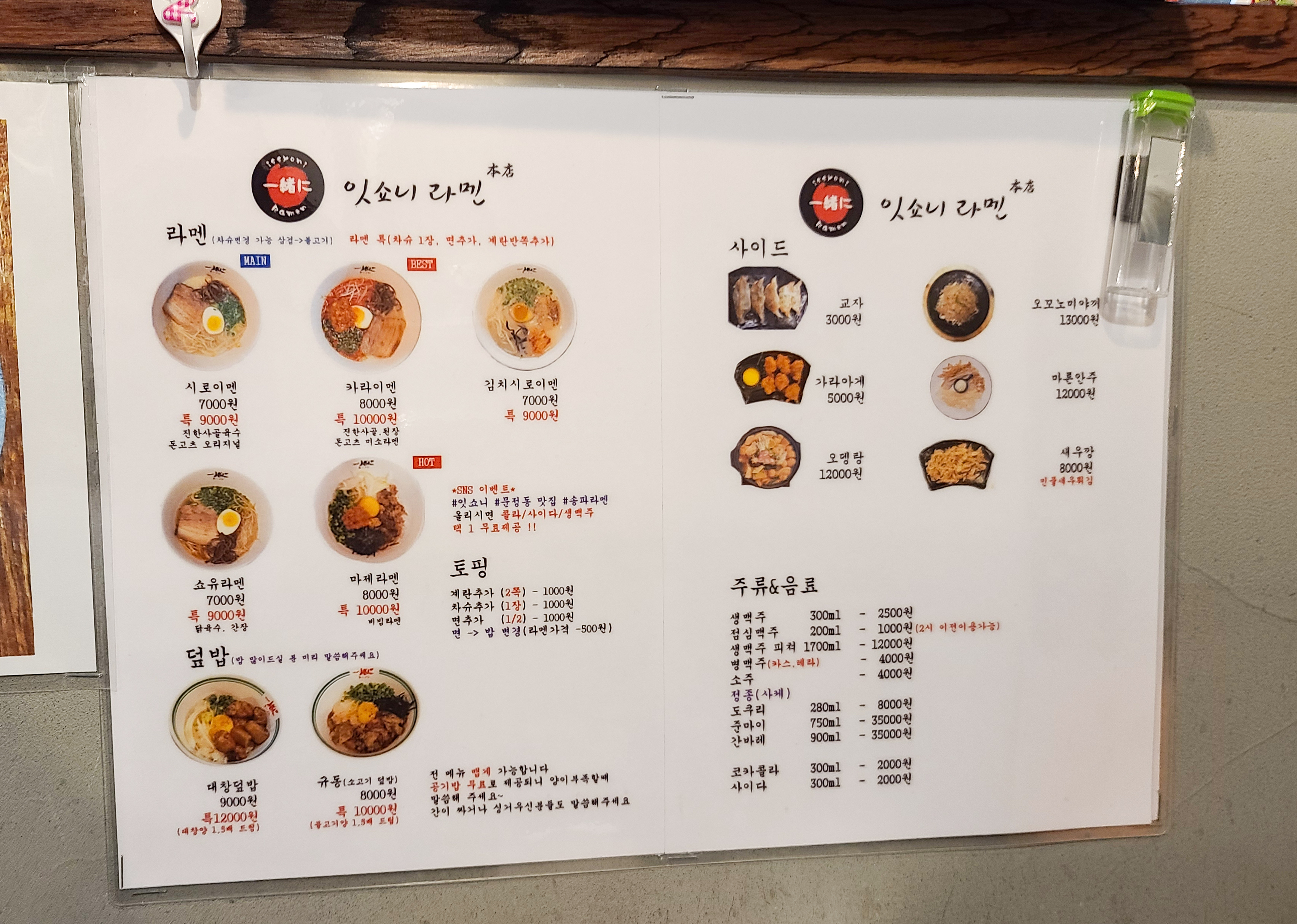문정역 잇쇼니의 메뉴는 시로이멘, 카라이멘, 김치시로이멘, 쇼유라멘, 마제라멘, 대창마제라멘, 대창덮밥, 규동, 교자, 오꼬노미야끼, 가라아게, 마른안주, 오뎅탕, 새우깡 등이 있었습니다. 이 날 저희는 마제라멘, 대창덮밥, 가라아게, 교자, 오꼬노미야끼, 새우깡, 오뎅탕을 주문하였습니다.