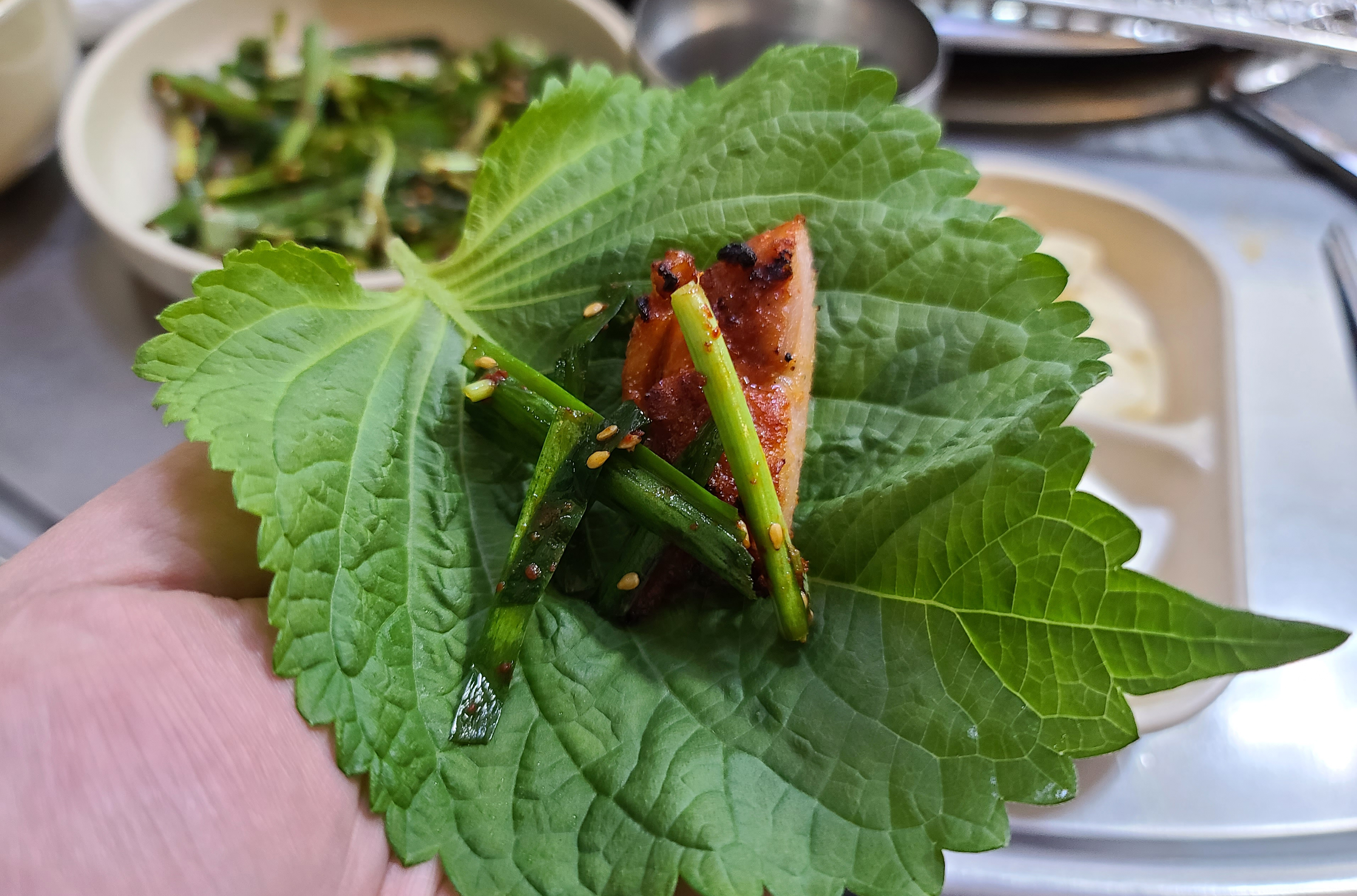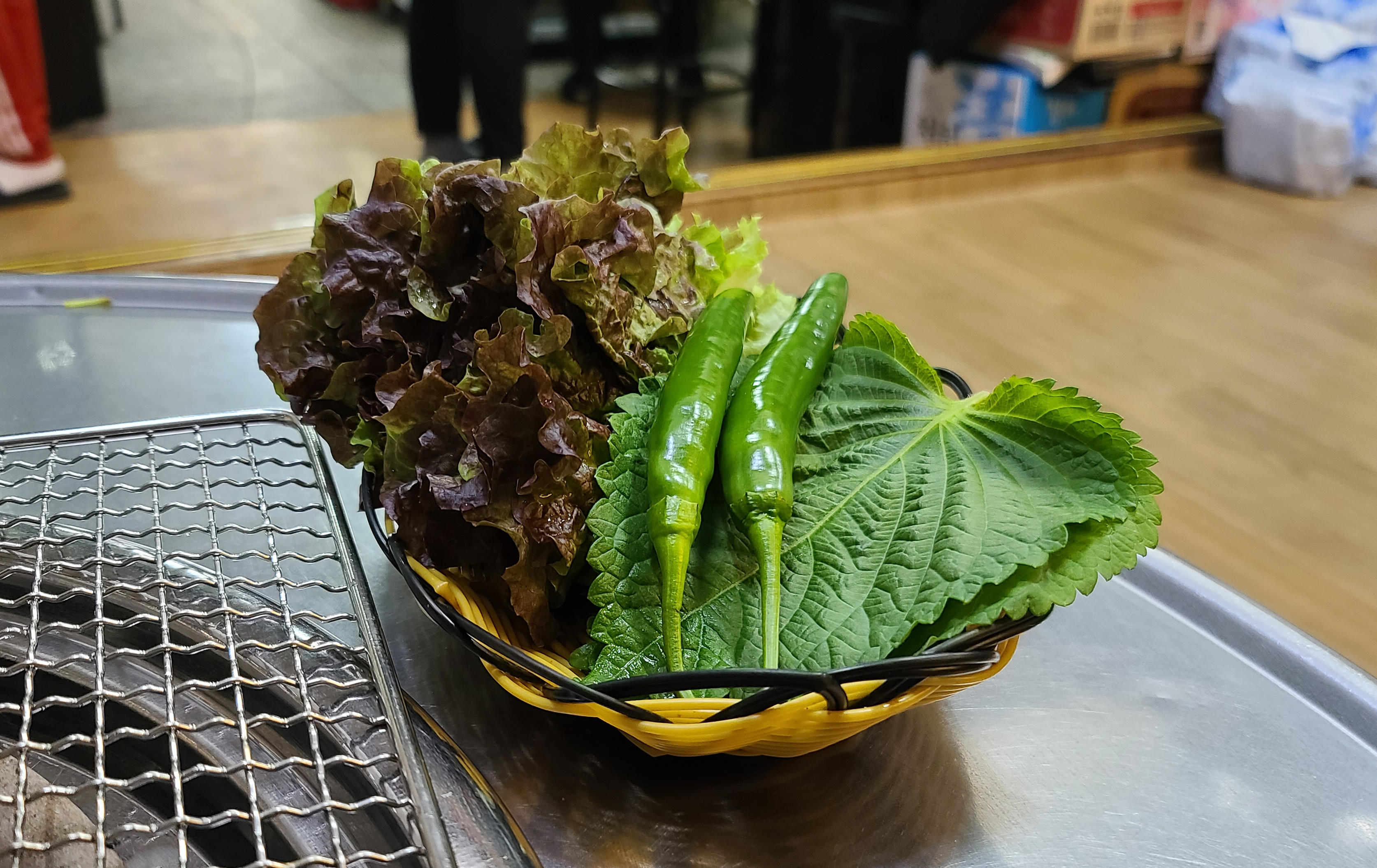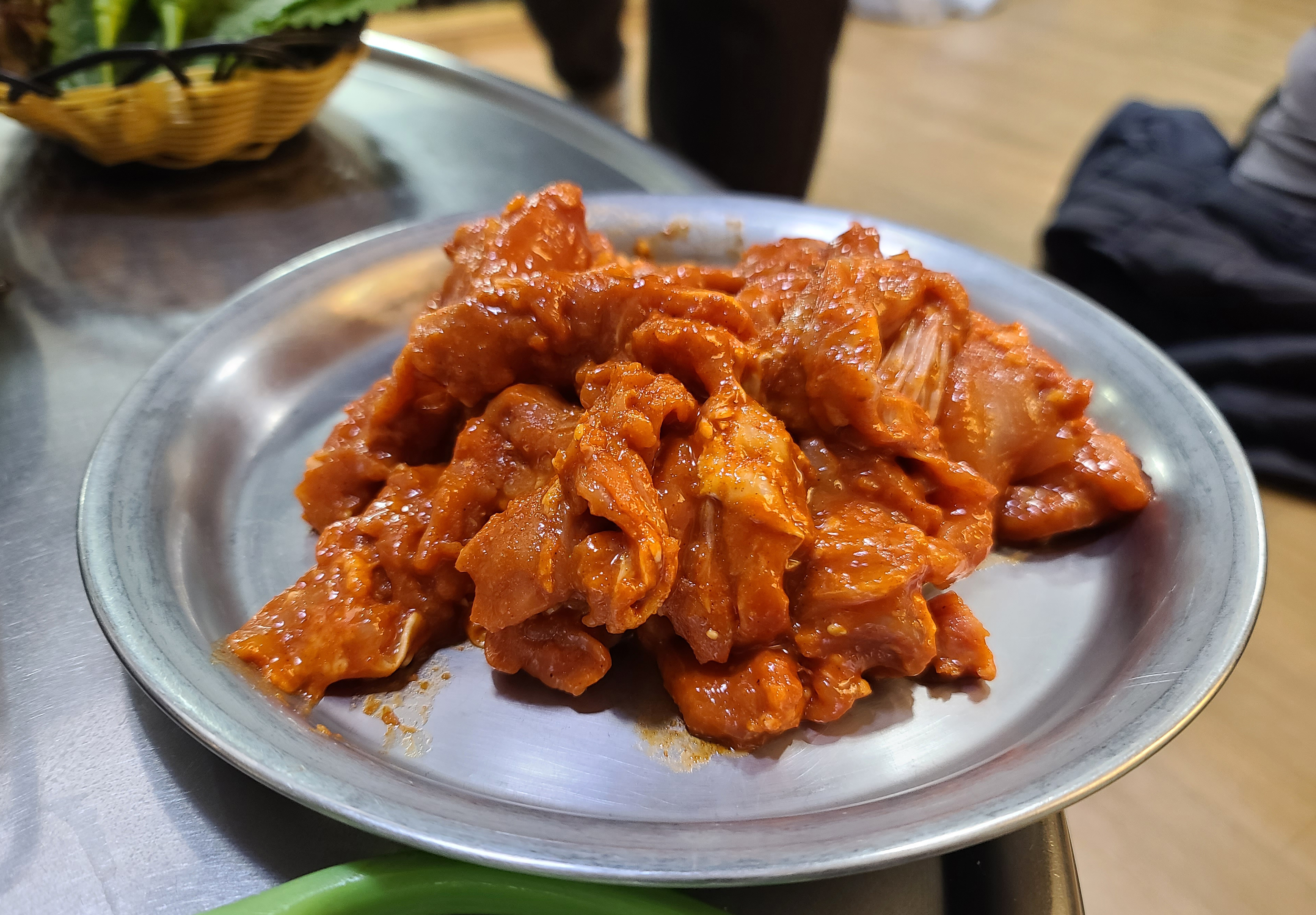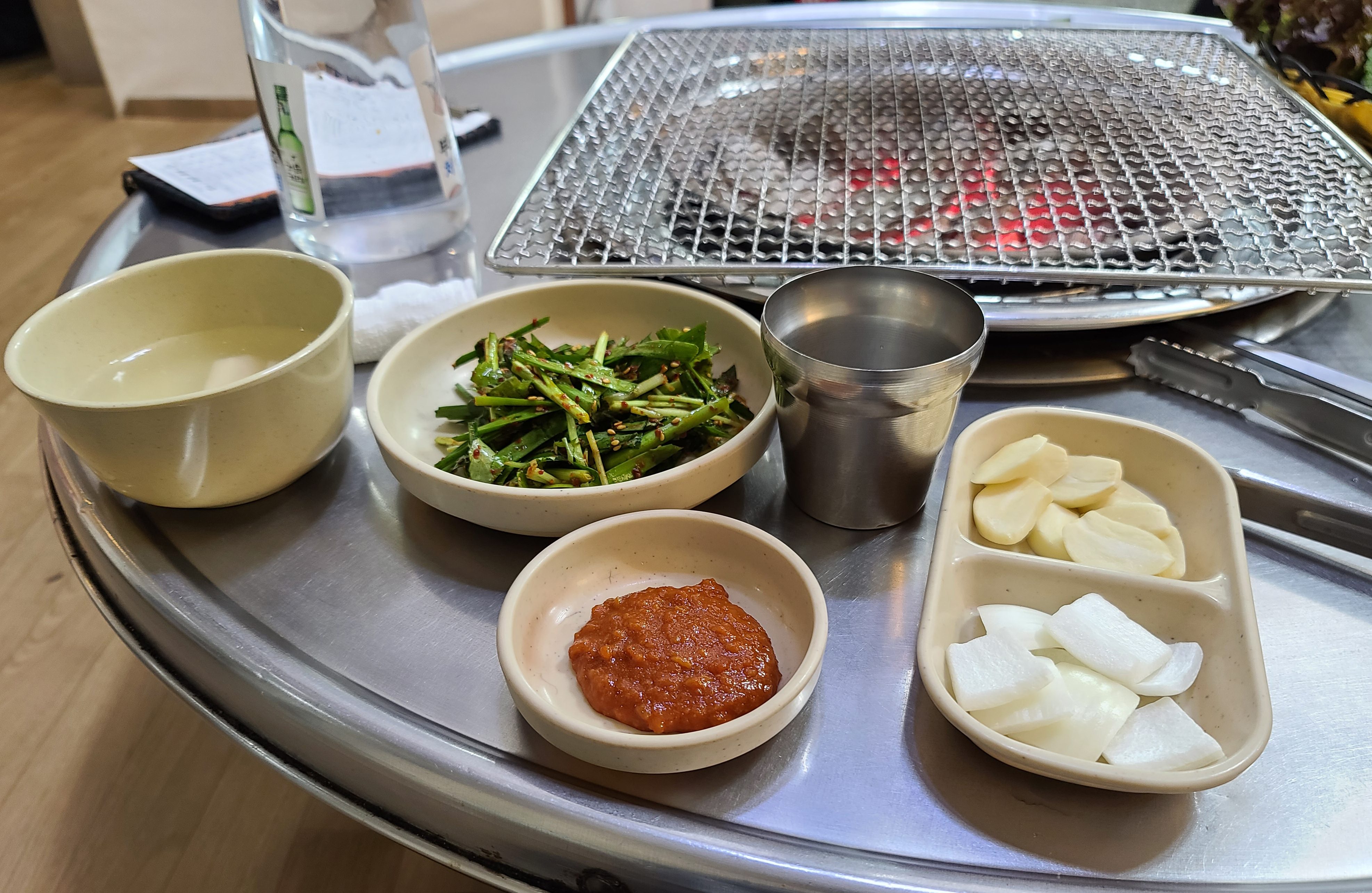 곧이어 뼈없는 닭갈비가 나왔고, 부추무침 마늘, 양파, 고추, 깻잎, 상추가 나왔습니다. 특히 인상적이었던 것은 동치미였는데, 막걸리에다가 담근 건지 톡 쏘는 맛이 너무 자극적이어서 한 입 먹고 다시는 입도 대기 싫더라고요. 나머지 채소들은 그나마 손을 대지 않아서 먹을만하더라고요.