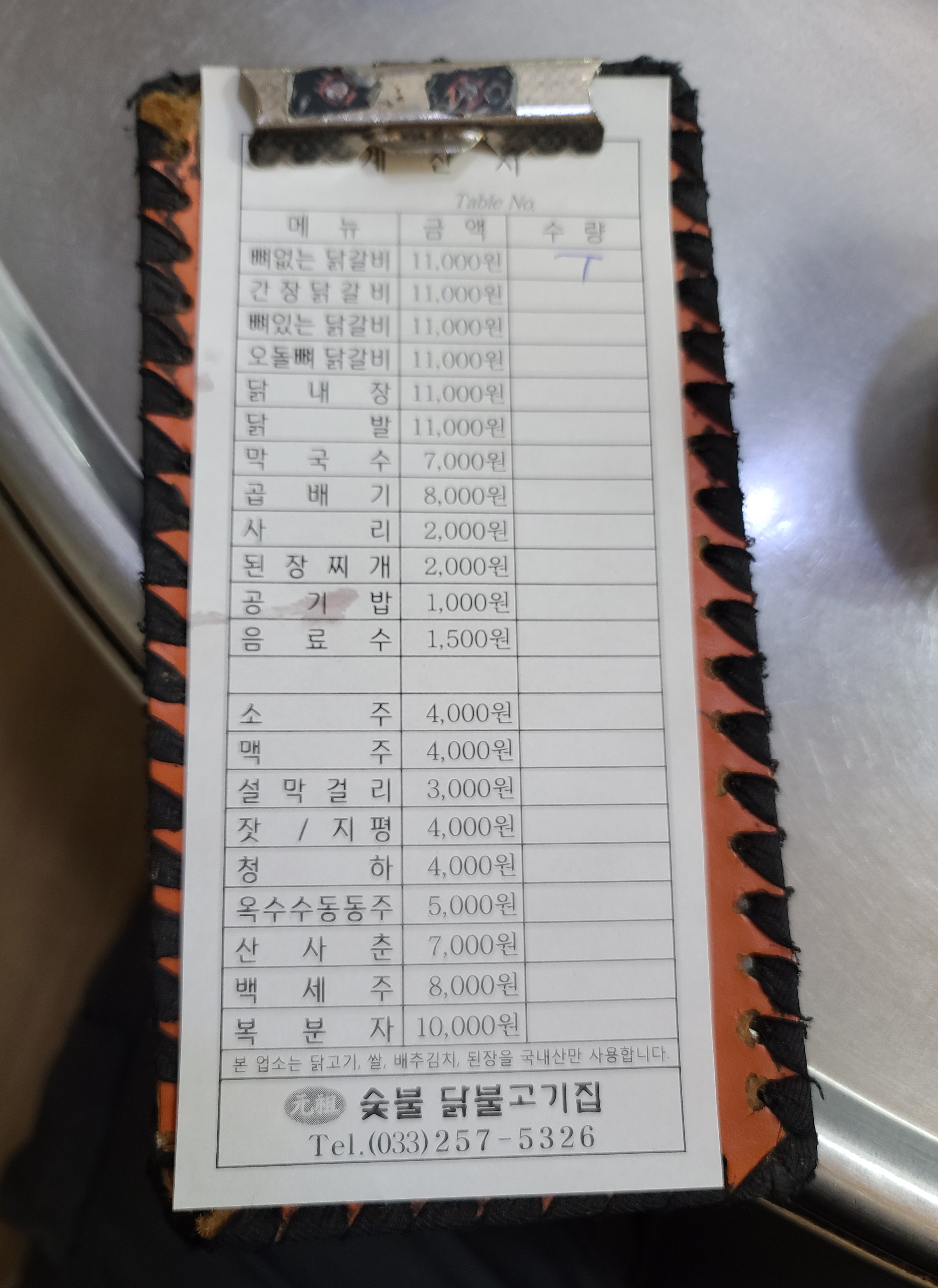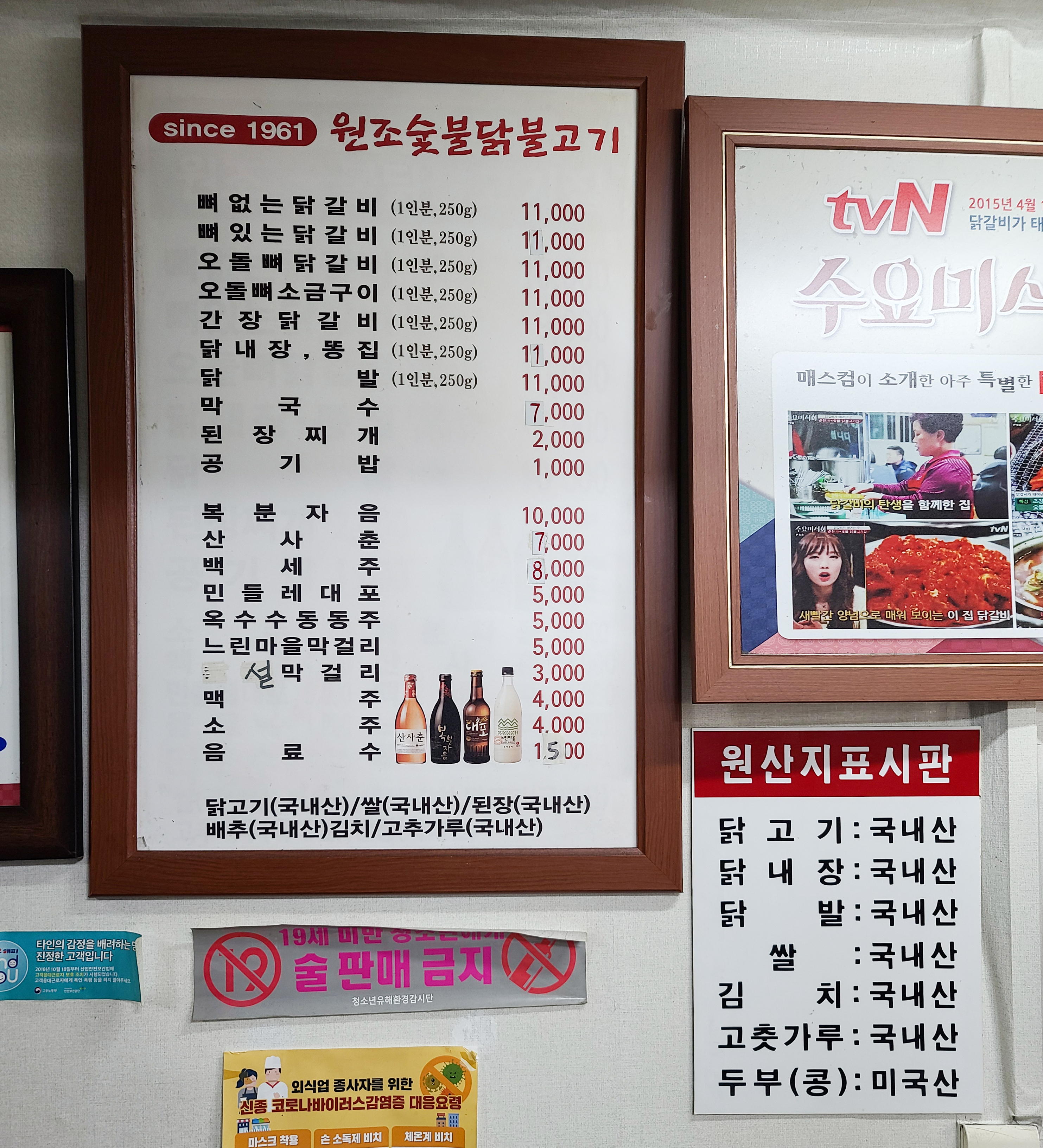 제가 오들오들 떨면서 밖에서 기다리고 있었는데, 손님이 곧 나와서 드디어 식당 안으로 들어갈 수 있었습니다. 원조숯불닭불고기 가게는 1961년부터 운영된 가게로 뼈없는닭갈비, 뼈있는닭갈비, 오돌뼈닭갈비, 오돌뼈소금구이, 간장닭갈비, 닭내장, 똥집, 닭발, 막국수, 된장찌개, 공기밥 등이 있었습니다.