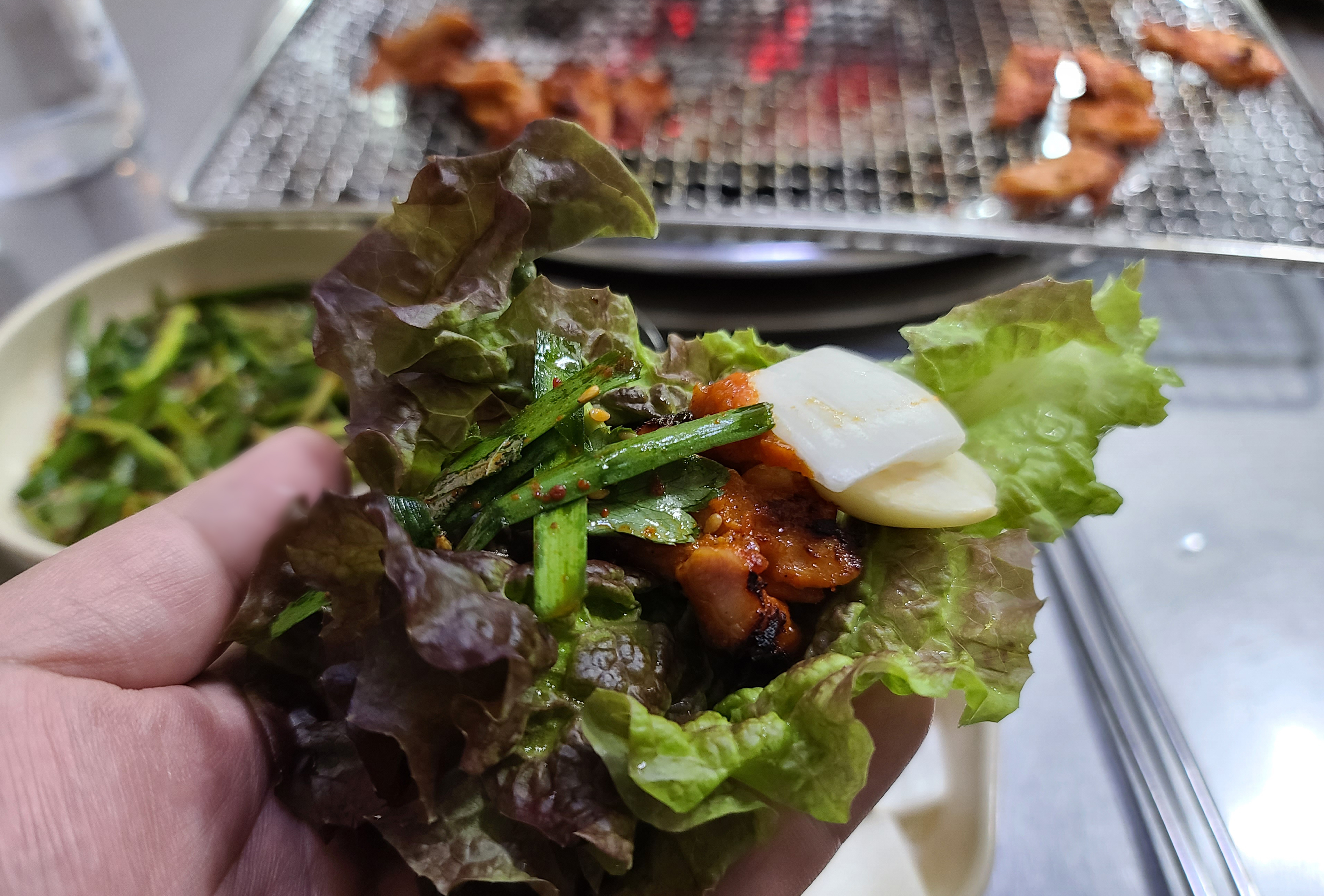 곧이어 뼈없는 닭갈비가 나왔고, 부추무침 마늘, 양파, 고추, 깻잎, 상추가 나왔습니다. 특히 인상적이었던 것은 동치미였는데, 막걸리에다가 담근 건지 톡 쏘는 맛이 너무 자극적이어서 한 입 먹고 다시는 입도 대기 싫더라고요. 나머지 채소들은 그나마 손을 대지 않아서 먹을만하더라고요.