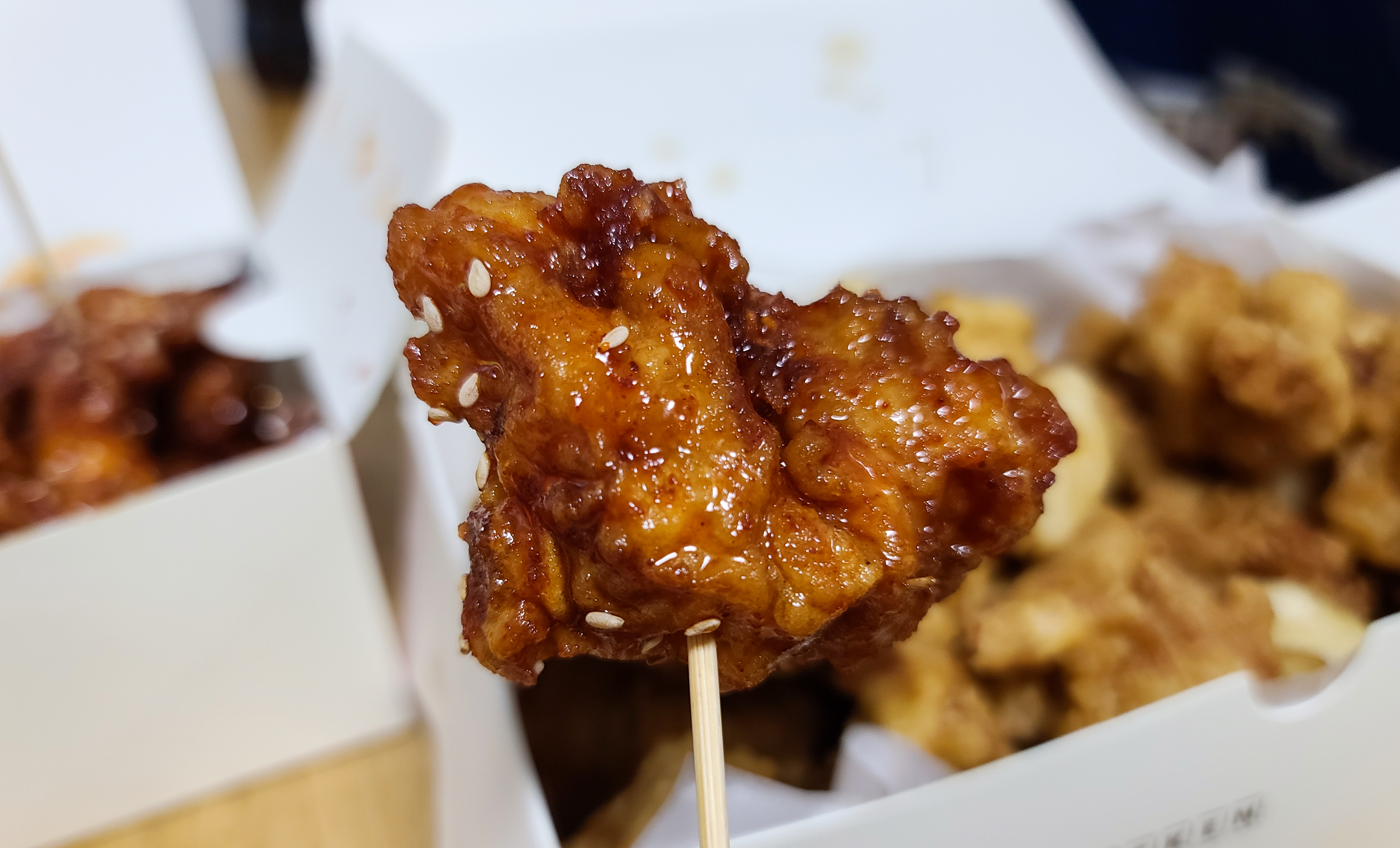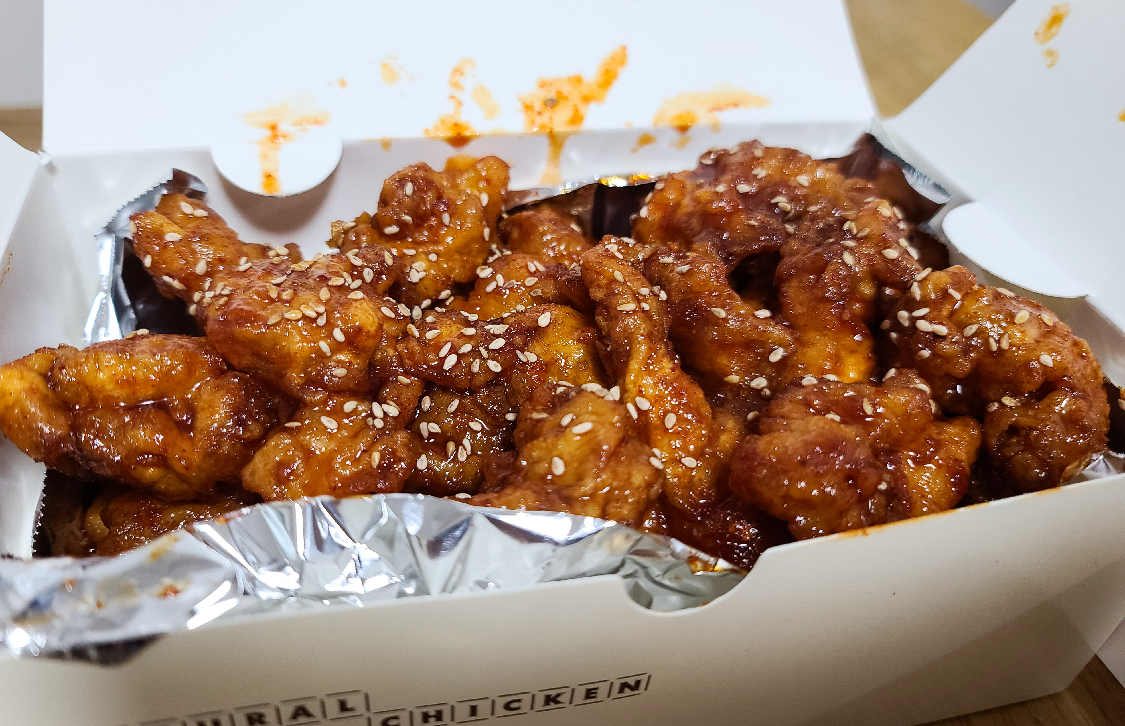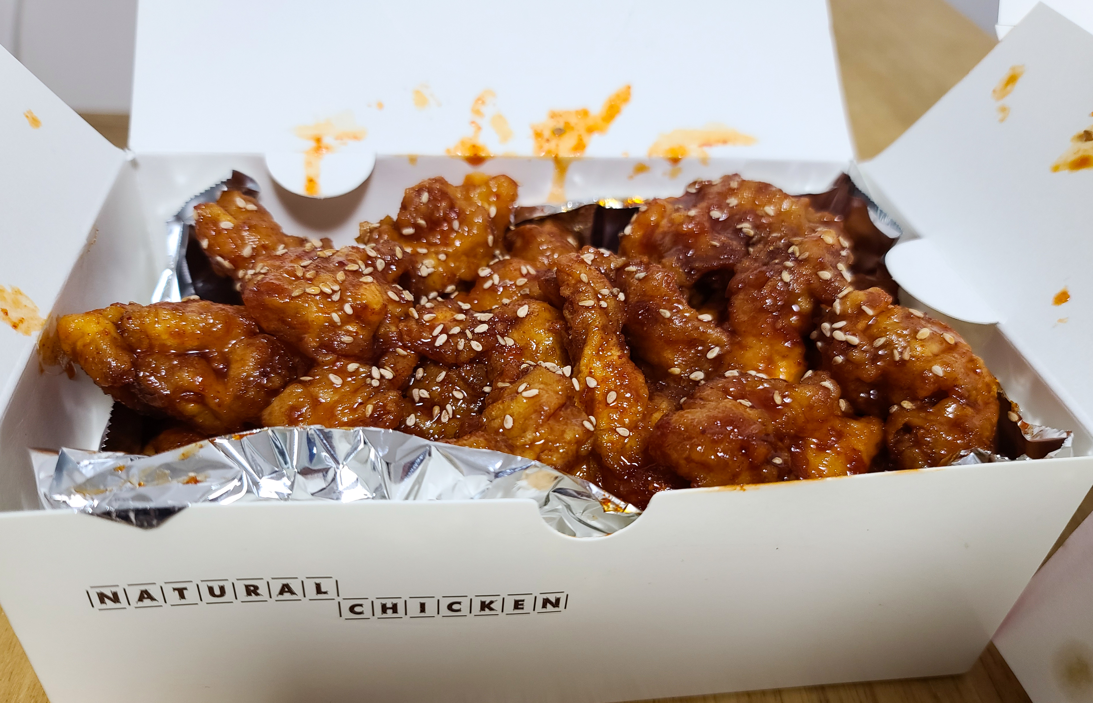 가마솥 달서닭강정&치킨의 닭강정 두마리 세트는 위와 같이 순살치킨과 양념 닭강정이 같이 제공되는 메뉴입니다. 순살 후라이드 치킨과 양념 닭강정(양념순살)은 가격 대비 양이 제법 많았고, 뼈를 발라내고 먹지 않아도 되어 먹기에 편했습니다.