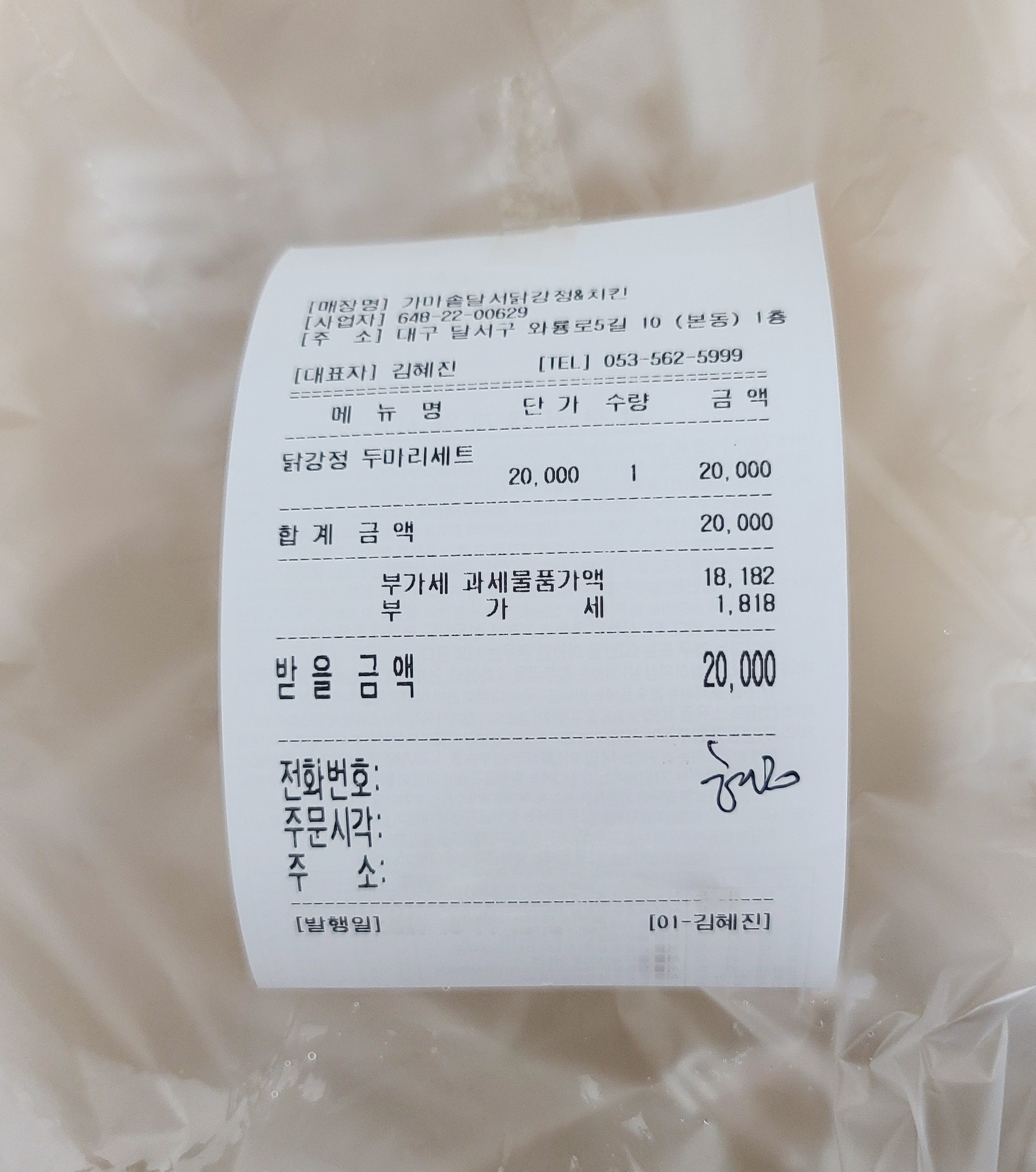 요즘 전염병 예방과 확산 방지를 위해 비대면으로 식사하는 게 필수가 된 시대인 것 같습니다. 식당도 일찍 문을 닫고, 카페나 다중이용 시설도 제한적으로 이용이 가능하면서 배달음식으로 끼니를 때우는 날이 늘어난 것 같습니다. 저는 이 날 대구 달서닭강정의 20,000원 메뉴인 닭강정 두마리세트를 주문했습니다. 배달 주문이기 때문에 영수증부터 찍어보았습니다.