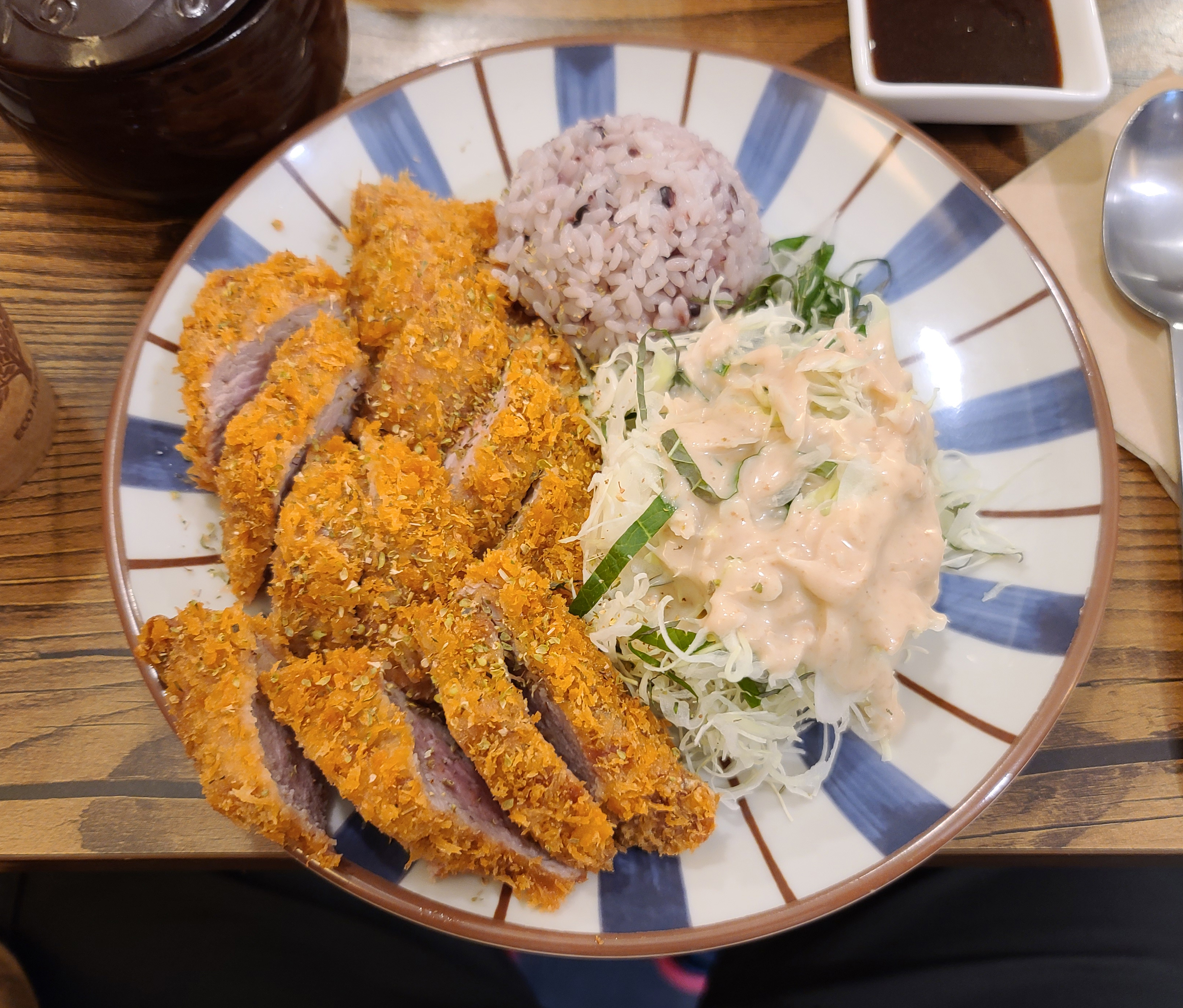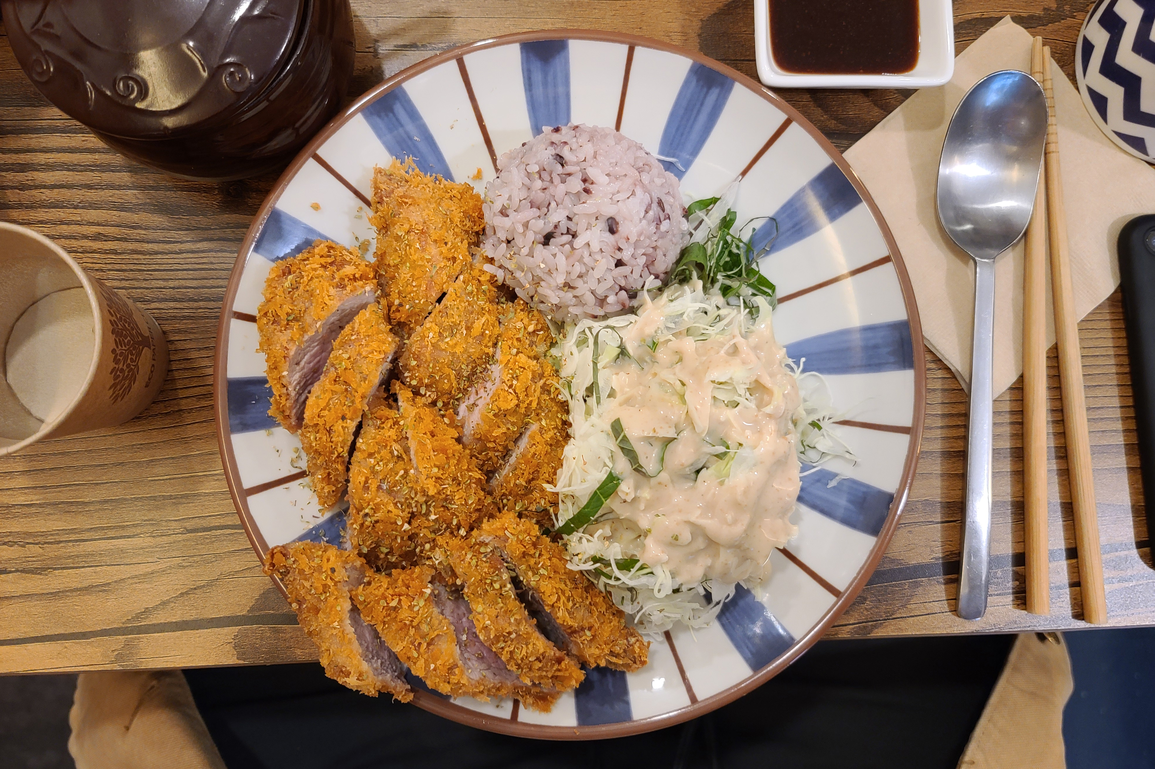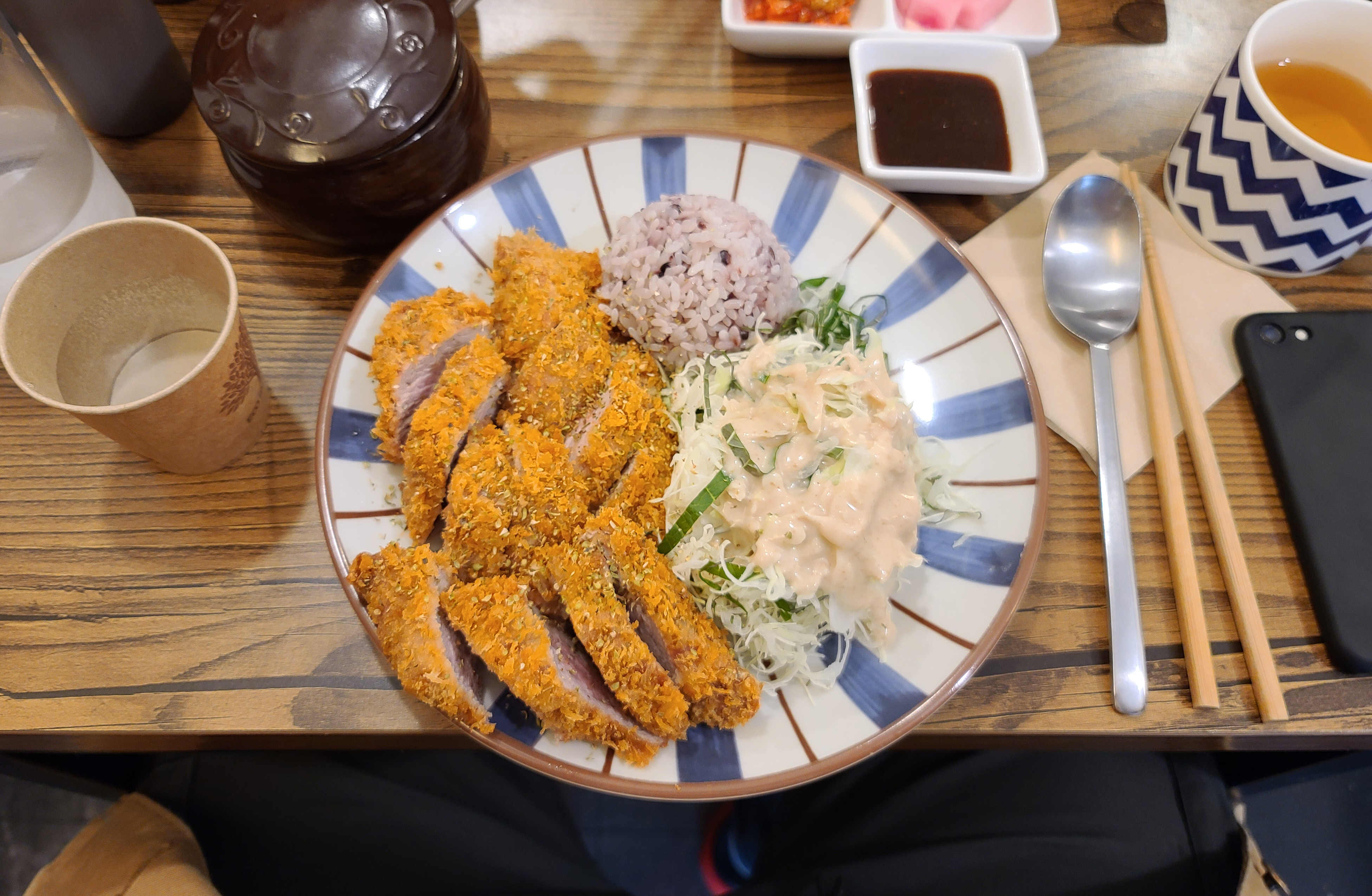 곧이어 주문한 돈까스가 나왔습니다. 곱빼기로 주문하였더니 기대했던 것만큼 넉넉한 양을 제공해주었습니다. 깻잎을 활용한 샐러드도 향이 좋았고 저에겐 밥도 양이 괜찮았습니다.