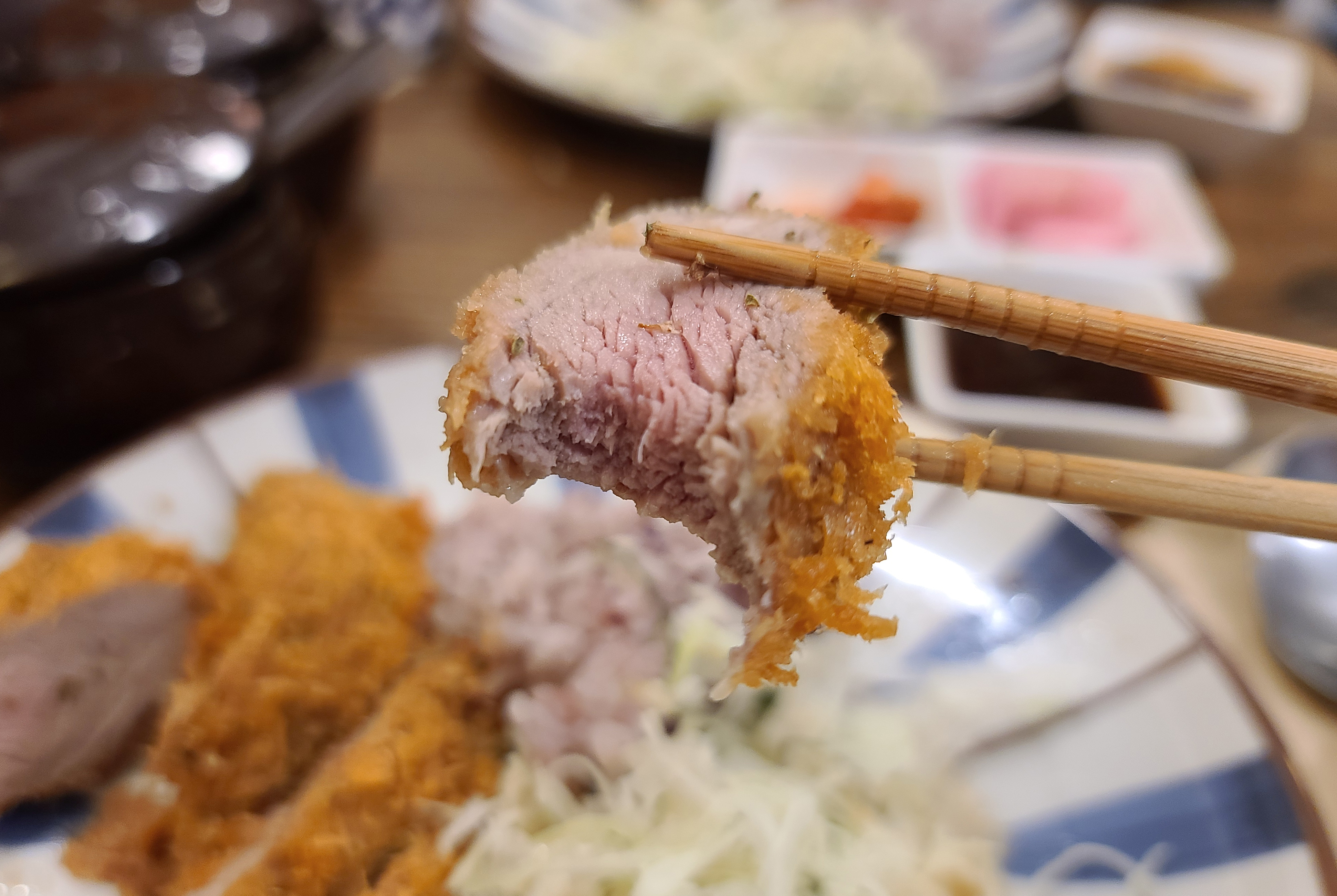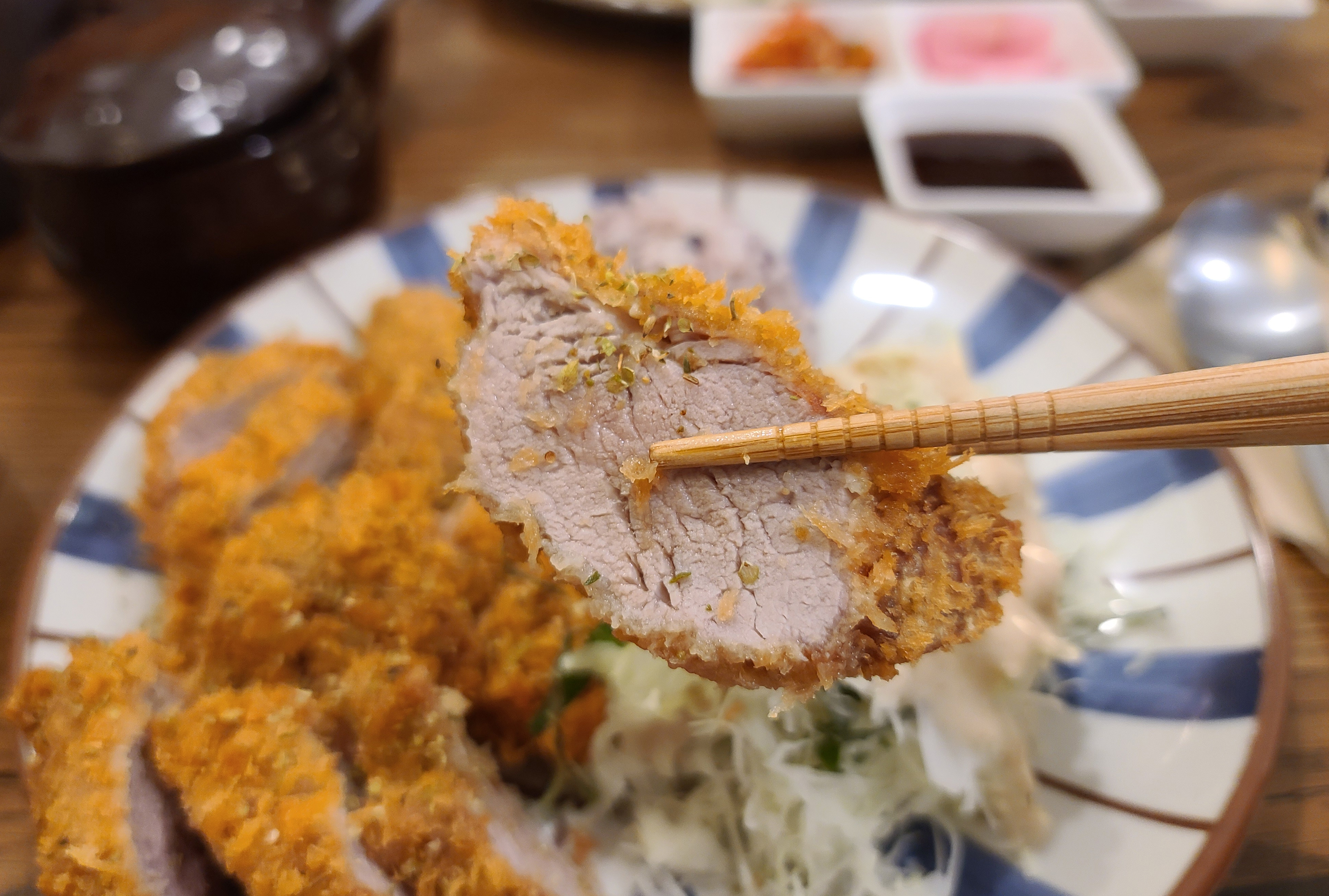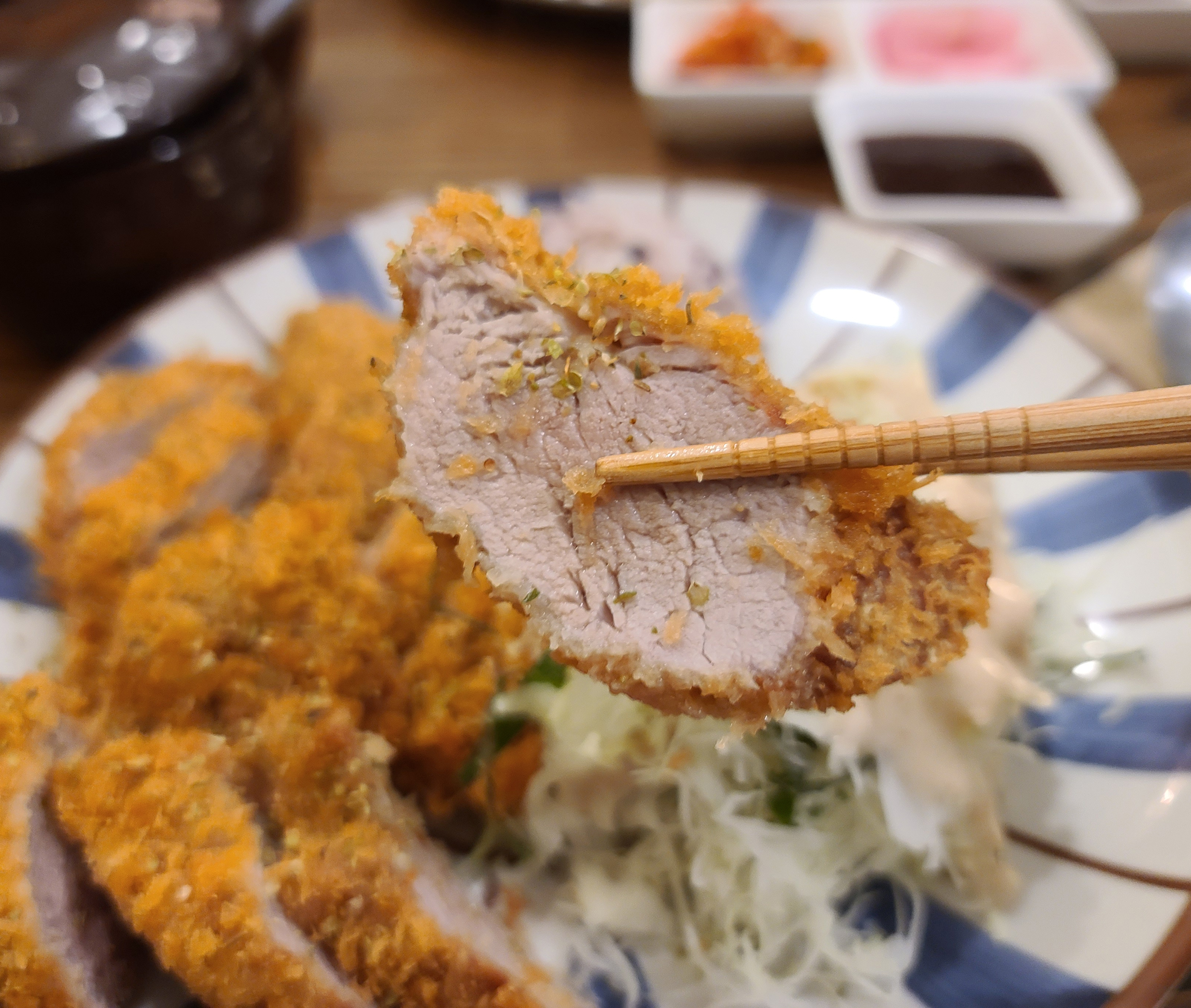 돈까스를 직접 먹어보면 허브가 살짝 뿌려져 나오며, 돈까스는 앞서 설명한 것과같이 한 입 크기로 도톰하게 썰어져나오며, 촉촉한 육즙이 느껴지는 식감이 일품이었습니다.