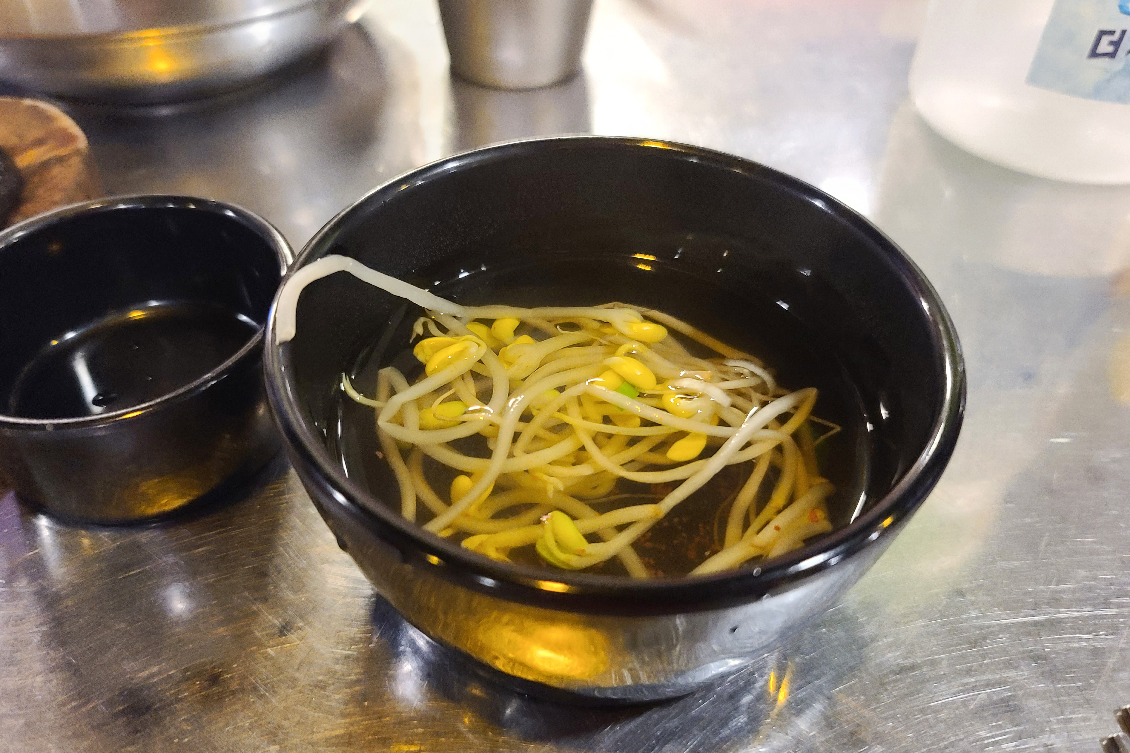 기본적으로 나오는 반찬은 콩나물국, 콘샐러드, 깻잎장아찌가 제공되었습니다. 그리고 테이블별로 코인 물티슈를 제공해주고 있어서 손을 닦고 나서 식사를 했습니다.