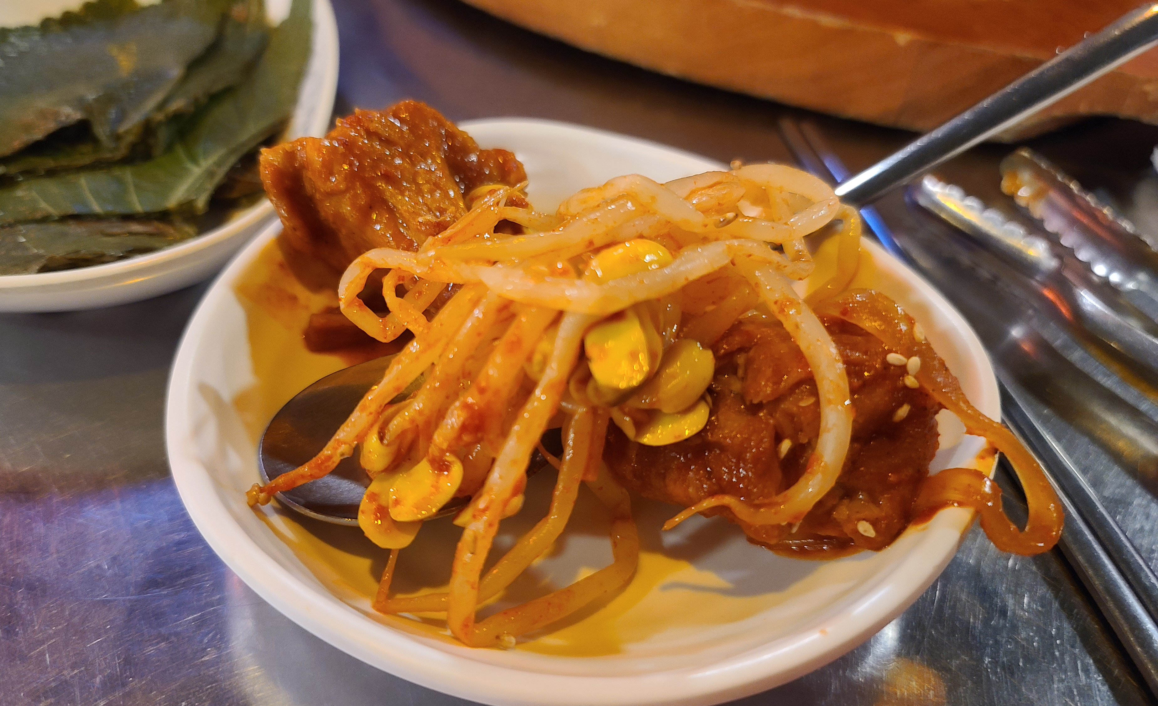 곧이어 주문한 김치 등갈비가 나왔습니다. 등갈비와 묵은지 콩나물이 잘 어우러진 메뉴로 맵기는 중간 정도로 했는데, 크게 매운 건 아니었고 기분 좋게 매콤한 맛이었습니다. 특히 부드러운 등갈비와 묵은지의 조합이 잘 어울렸습니다.
