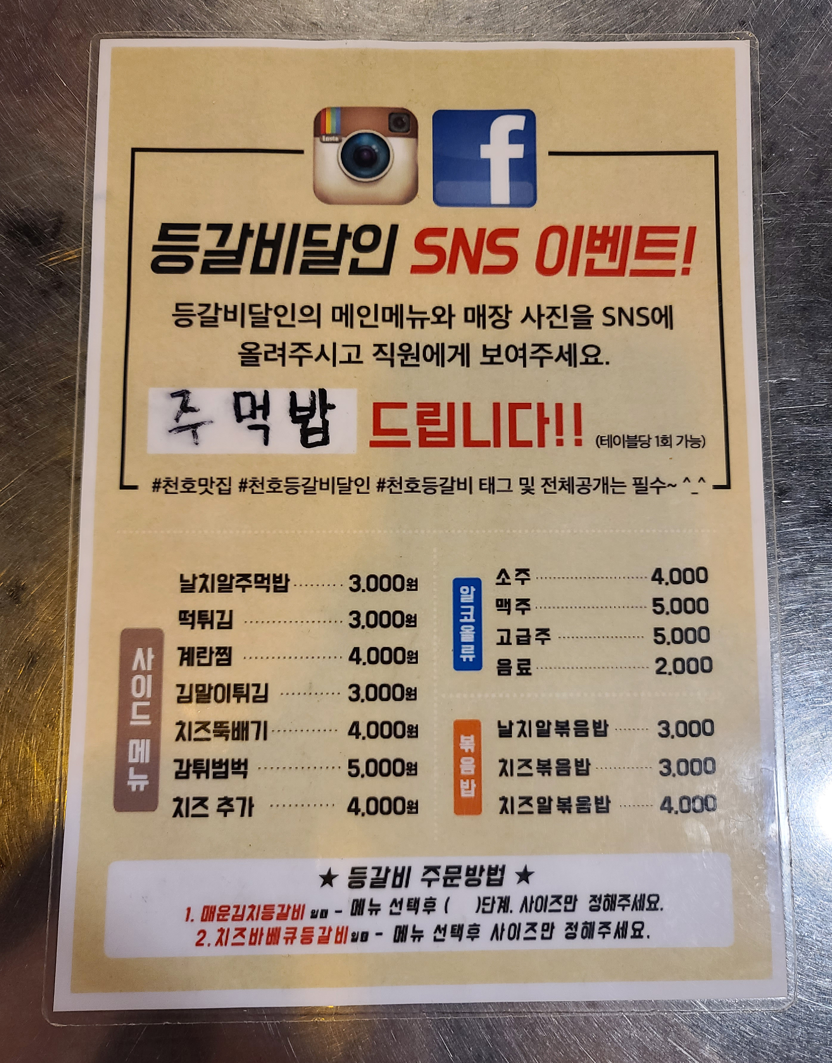 등갈비달인의 메뉴는 위와 같습니다. 매운김치등갈비, 치즈등갈비, 치즈철판등갈비, 바베큐등갈비, 날치알주먹밥, 떡튀김, 계란찜, 김말이튀김, 치즈뚝배기, 감튀범벅, 치즈추가, 날치알볶음밥, 치즈볶음밥, 치즈알볶음밥 등이 있었습니다. 메인 메뉴와 매장의 사진을 직원에게 보여주면 주먹밥을 서비스로 주는 SNS 이벤트도 하고 있었습니다. 우선 저희는 매운김치등갈비와 계란찜을 주문했습니다.