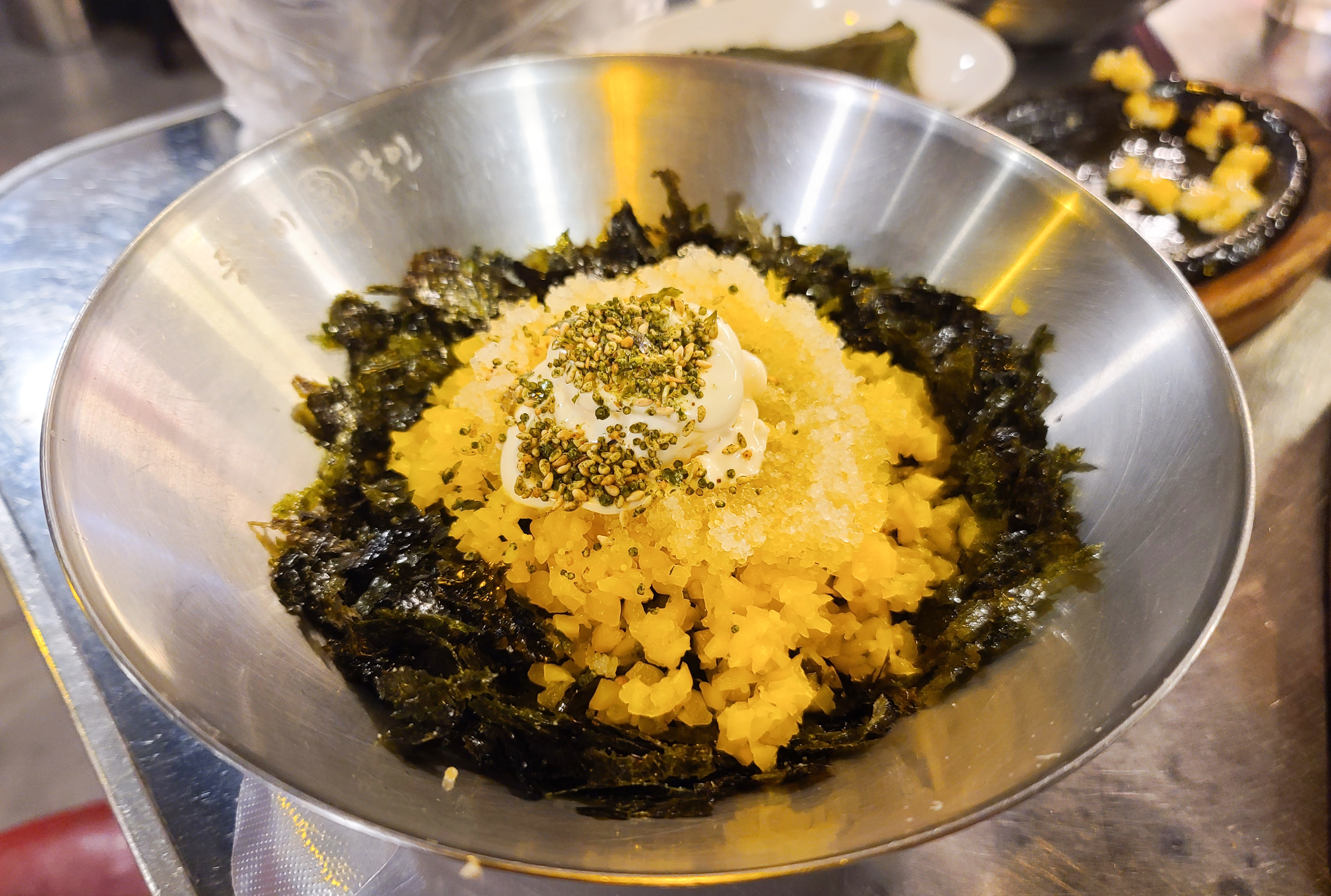주문한 계란찜과 서비스로 받은 날치알 주먹밥의 모습입니다. 날치알주먹밥은 마요네즈, 김가루 등을 조물조물 섞어서 주먹밥 형태로 말아먹게 되어있었고, 계란찜은 군더더기 없이 무난한 맛이었습니다.