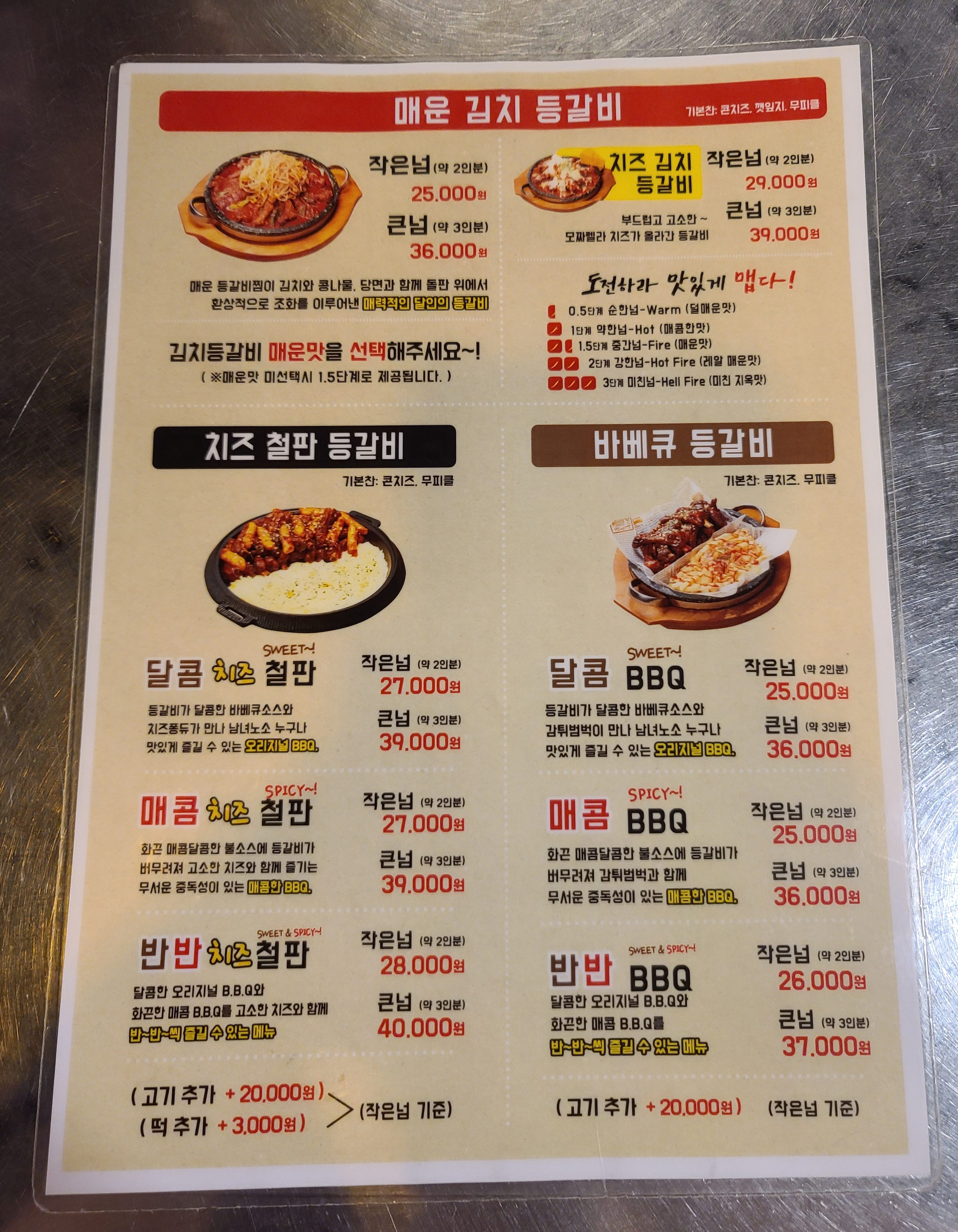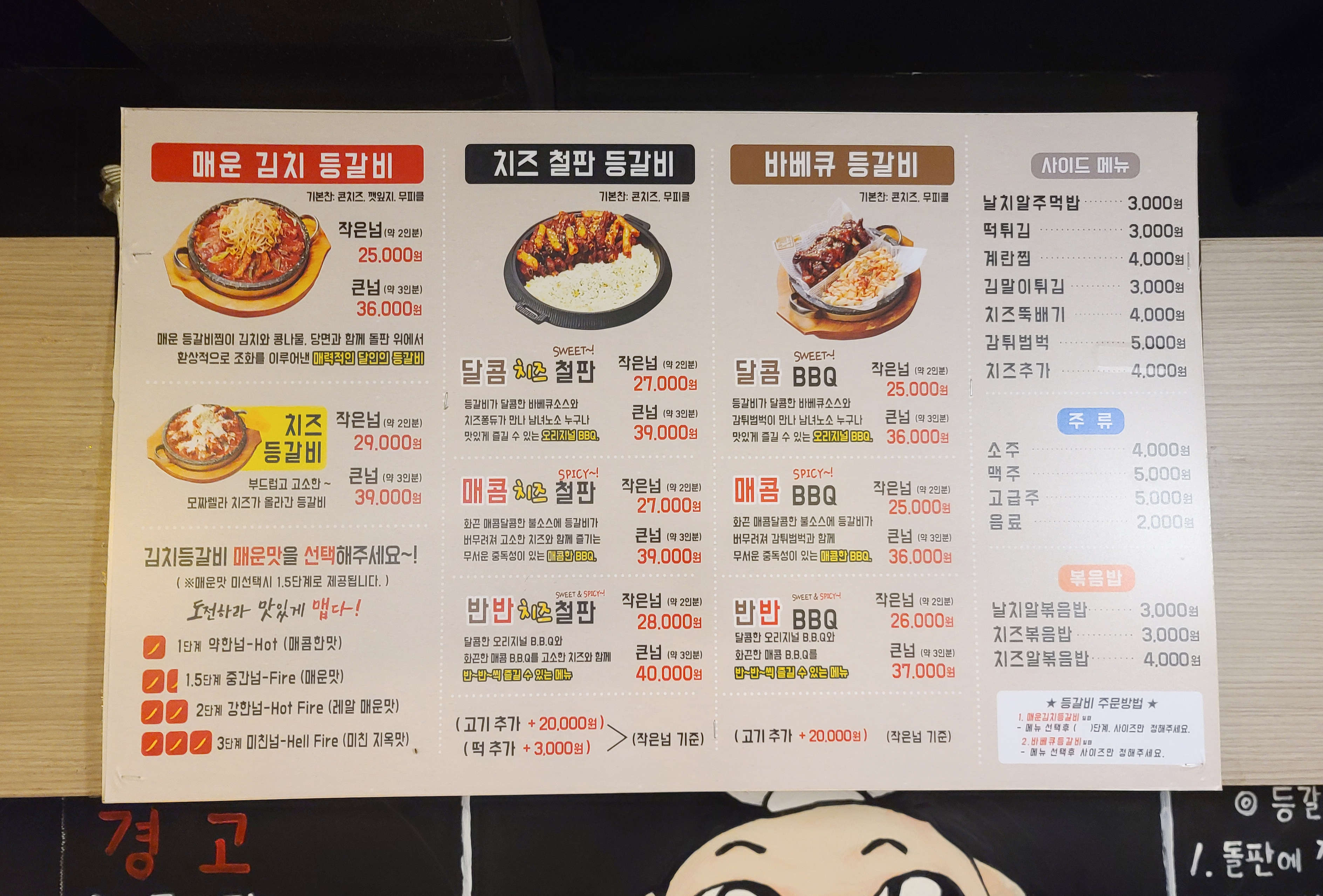 다른 날 다시 방문했을 때는 치즈철판등갈비도 주문해보았습니다. 약간 매콤한 맛이 있었는데, 김치등갈비는 자연스러운 매콤함이었다면 약간 인위적인 매운맛이라 톡 쏘는 맛이 조금 별로였습니다. 치즈랑 곁들이면 중화가 되어 괜찮았는데, 다음에 등갈비달인에 다시 방문한다면 그냥 기본적인 메뉴인 김치등갈비를 먹을 것 같습니다.