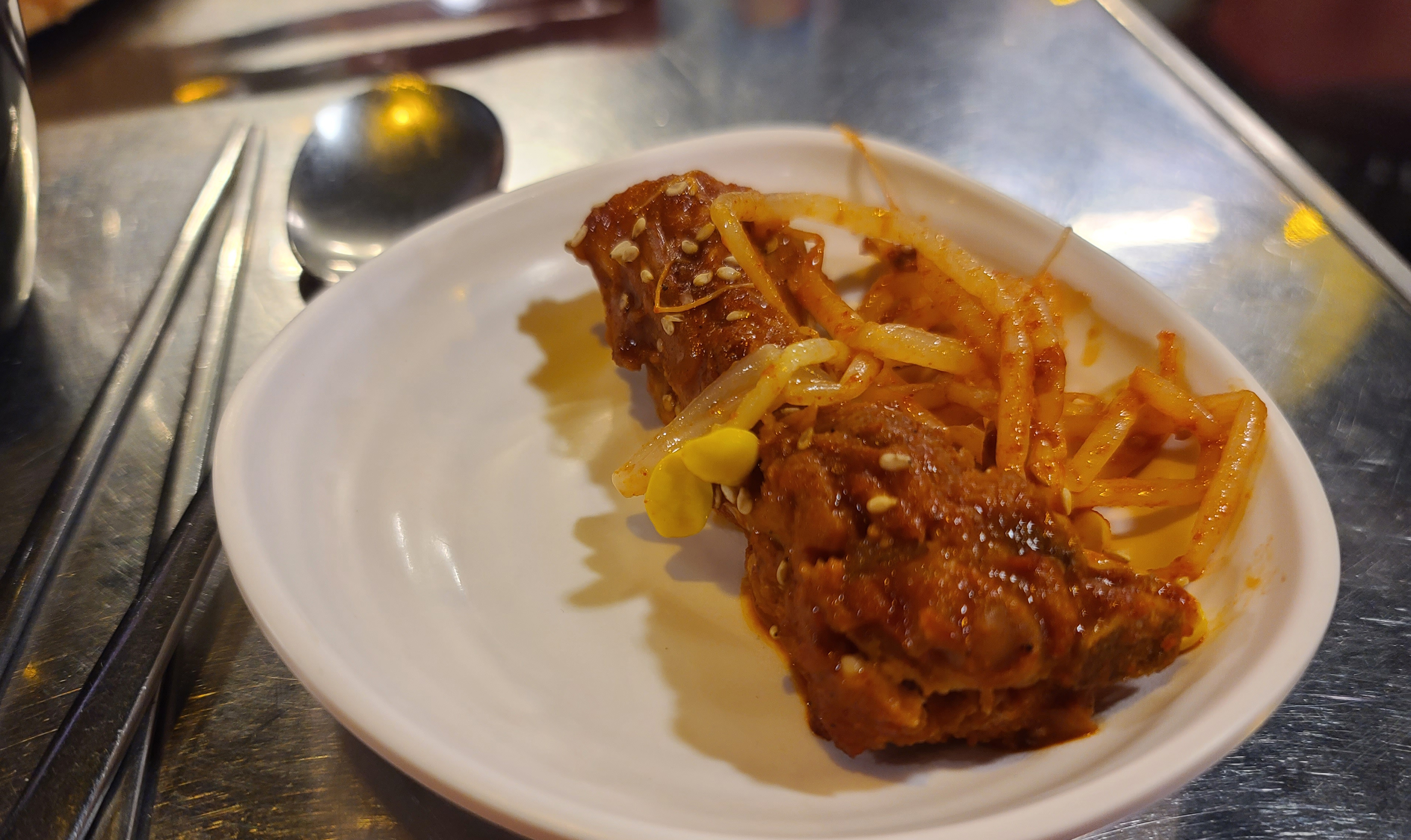 곧이어 주문한 김치 등갈비가 나왔습니다. 등갈비와 묵은지 콩나물이 잘 어우러진 메뉴로 맵기는 중간 정도로 했는데, 크게 매운 건 아니었고 기분 좋게 매콤한 맛이었습니다. 특히 부드러운 등갈비와 묵은지의 조합이 잘 어울렸습니다.