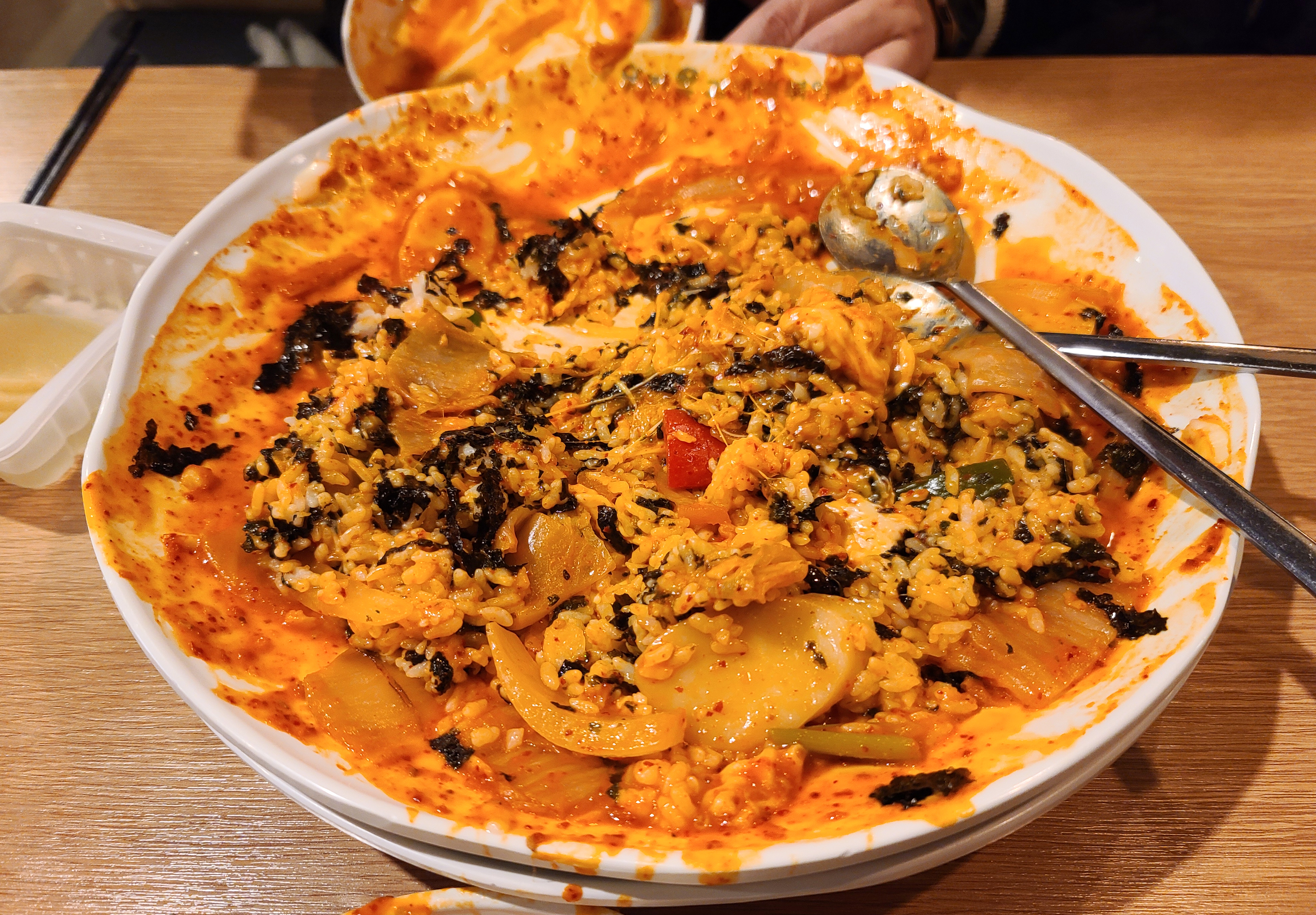 떡볶이를 먹고 약간 부족한 듯하여 밥과 김가루가 나오는 메뉴를 주문하여 남은 국물에 밥을 비벼먹었습니다. 밥이랑 먹기엔 나쁘지 않았고요, 전체적으로 이색적인 맛은 있었지만 찾아가서 먹을만한 메뉴는 아녔습니다. "차라리 저 가격이면 다른 떡볶이 가게에서 푸짐하게 먹었을 텐데"라는 아쉬움도 좀 남았고요. 아무튼 기대했던 것보다는 조금 아쉬움이 있던 가게였습니다.