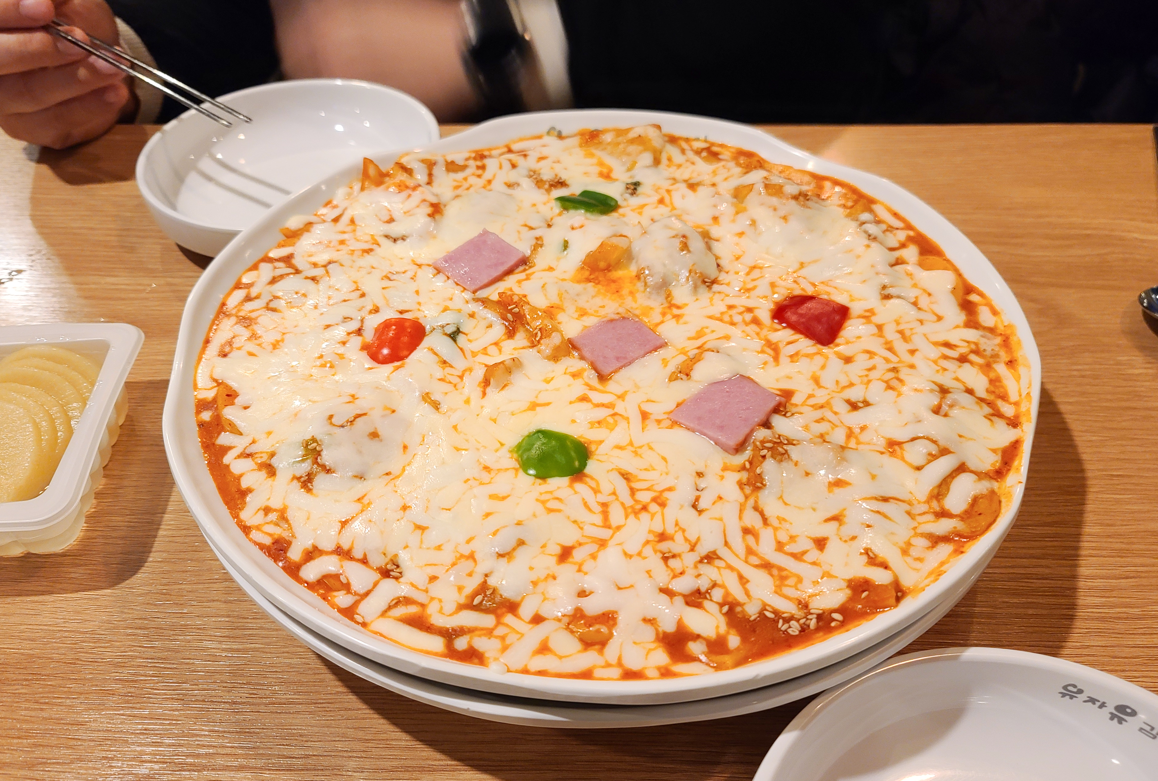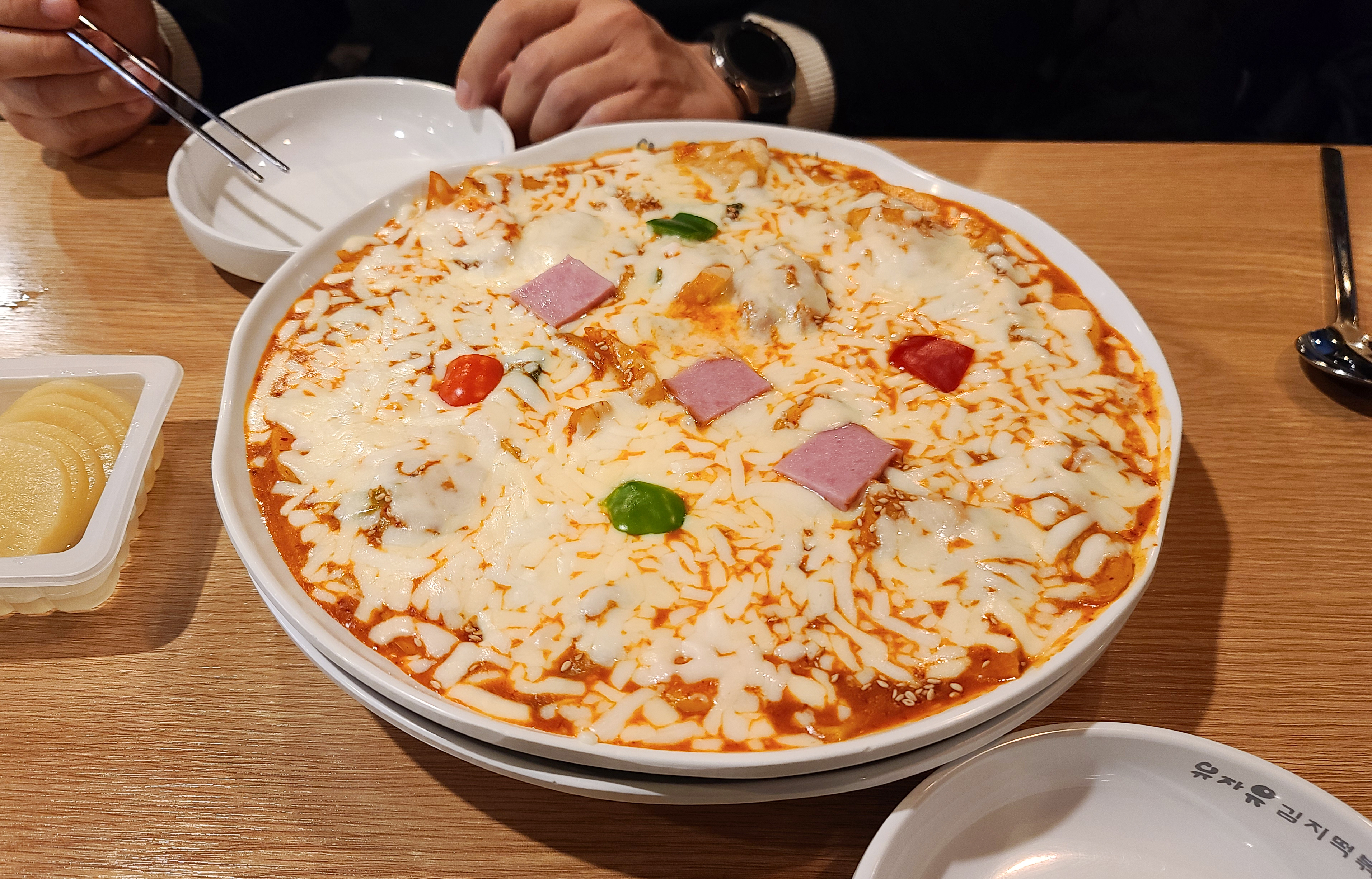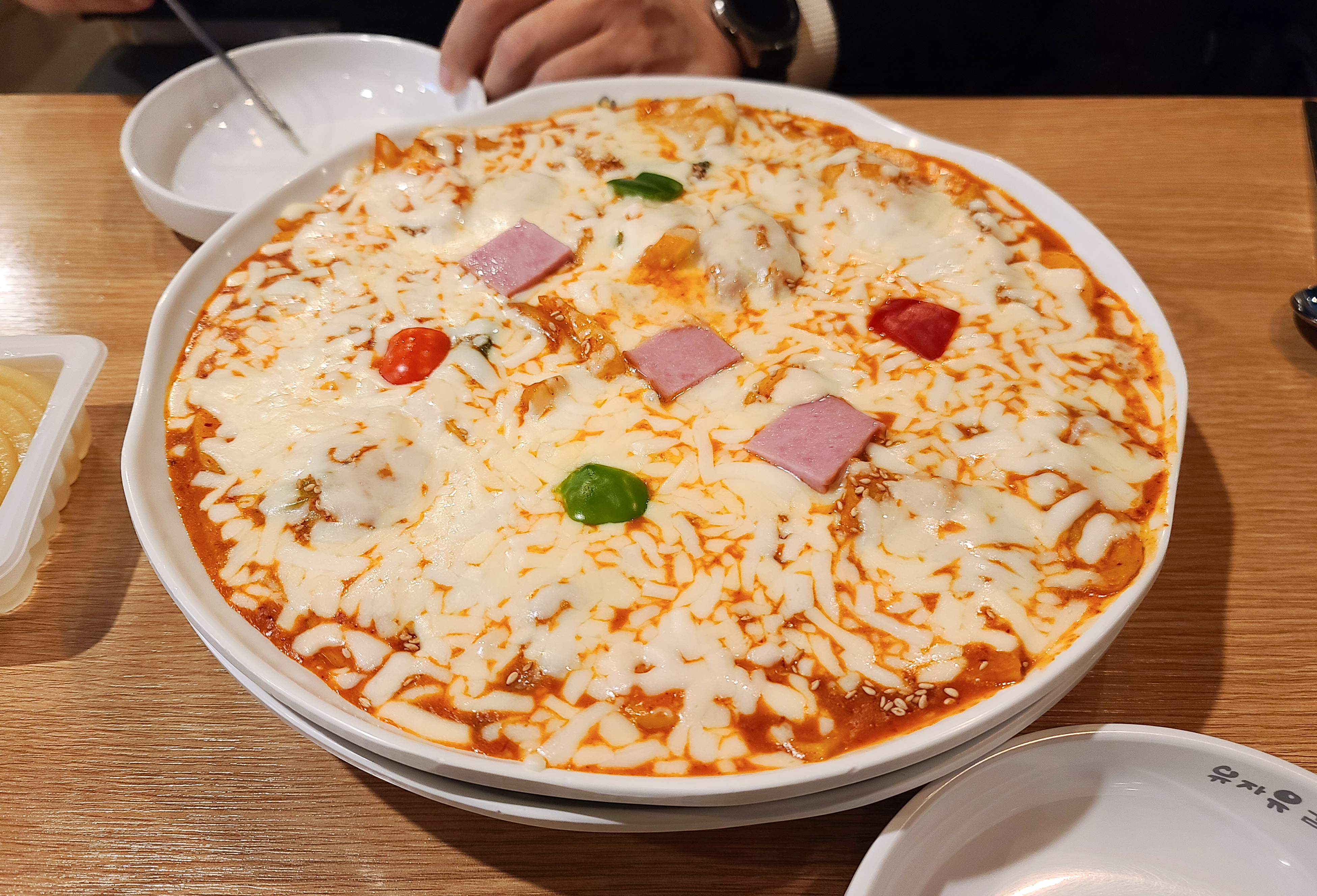 곧이어 주문한 유자유김치떡볶이 가게의 피자 김치떡볶이가 나왔고, 피자 김치떡볶이는 피자치즈가 파프리카와 햄 등과 토핑 되어있는 떡볶이였습니다. 떡은 떡국에 들어가는 떡국떡이 들어가 있었고, 김치떡볶이 상호명과 일치하게 떡볶이에 김치가 들어간 게 특징이었습니다.