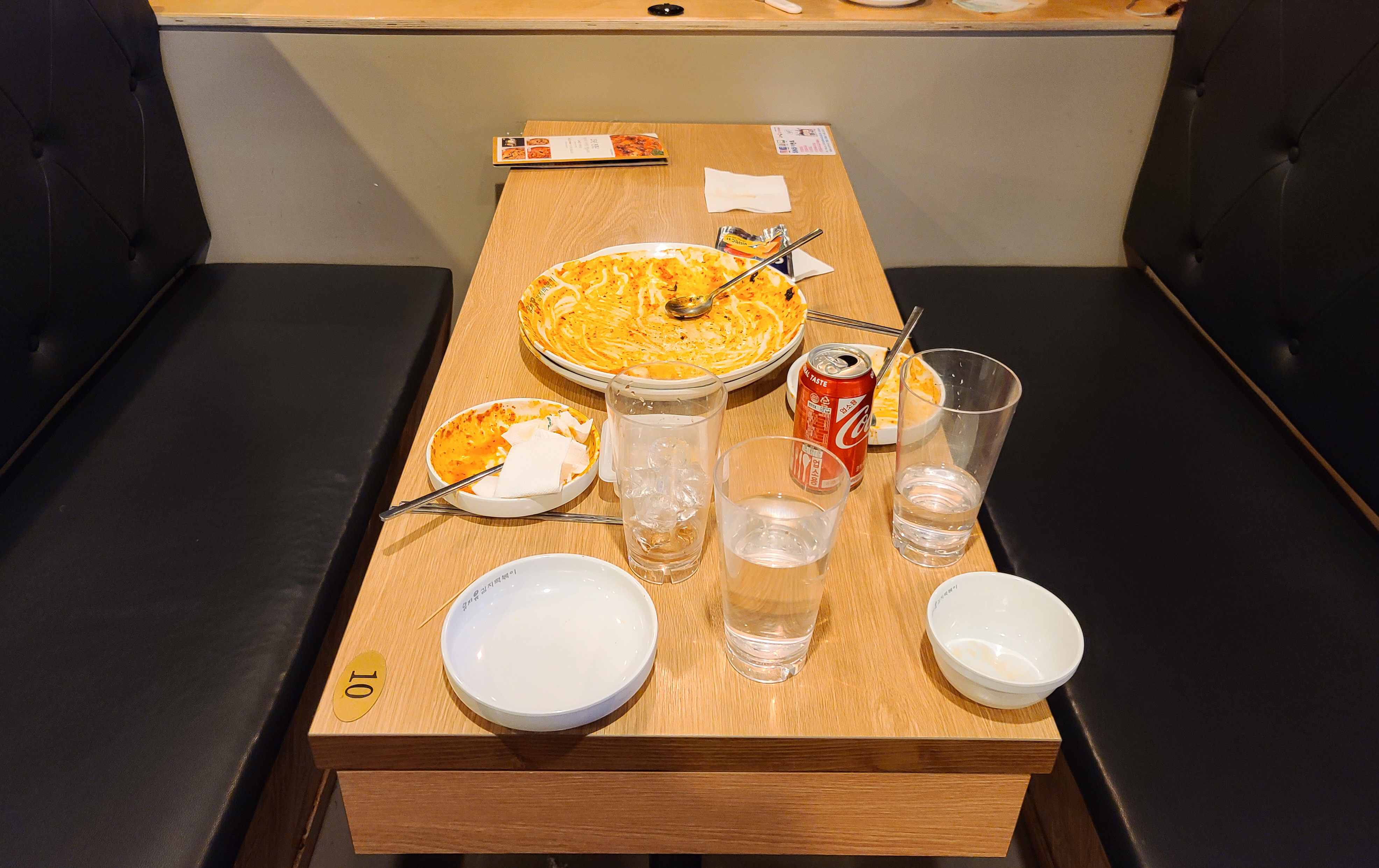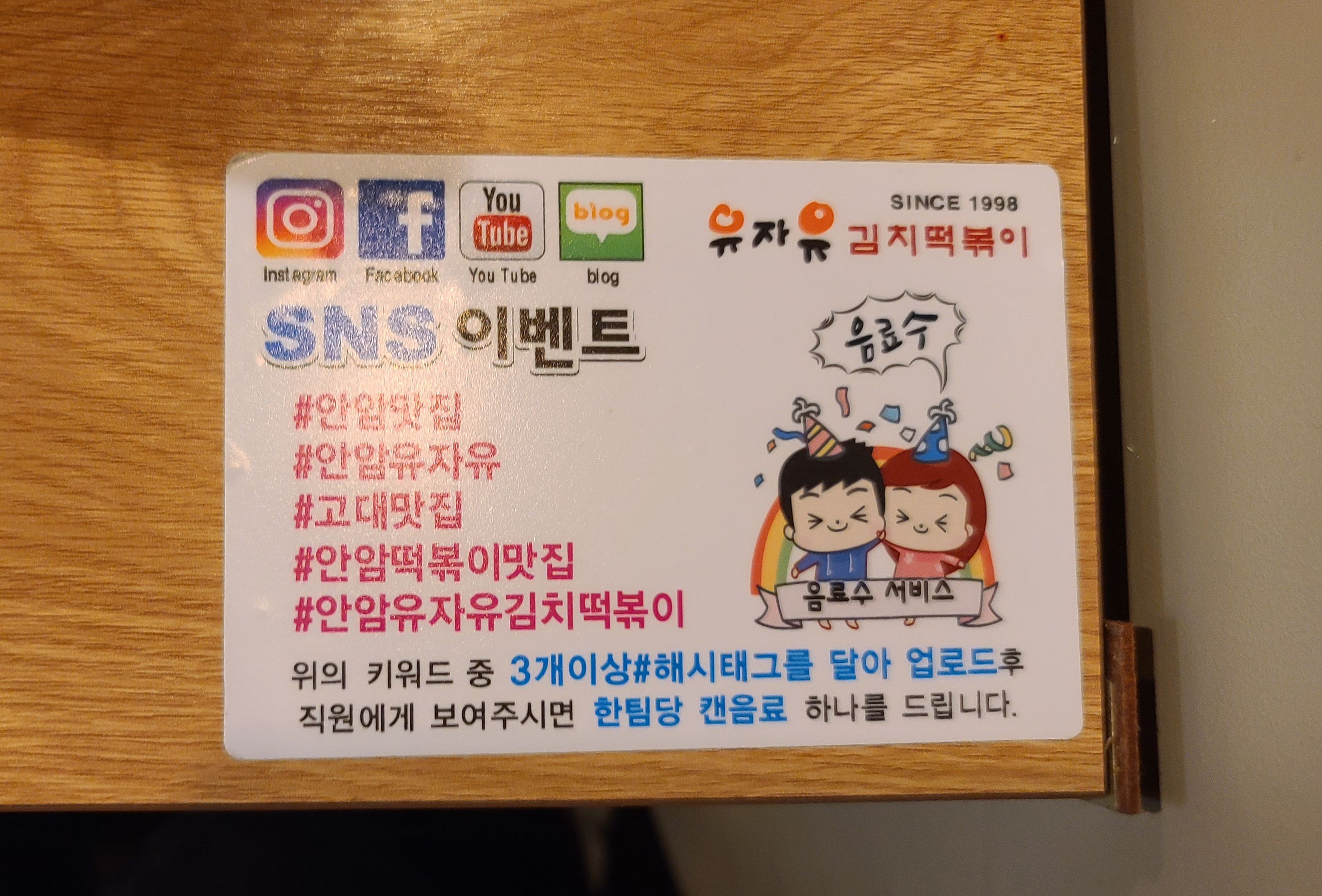 기본적으로 음료수(?)가 제공되었고, 단무지가 함께 나왔습니다. SNS 이벤트로 #안암맛집 #안암유자유 #고대맛집 #안암떡볶이맛집 #안암유자유김치떡볶이 중 3개 이상 태그를 달면 음료수를 서비스로 제공해주고 있어서, 해시태그 이벤트에 참가하여 음료를 서비스로 제공받았습니다.