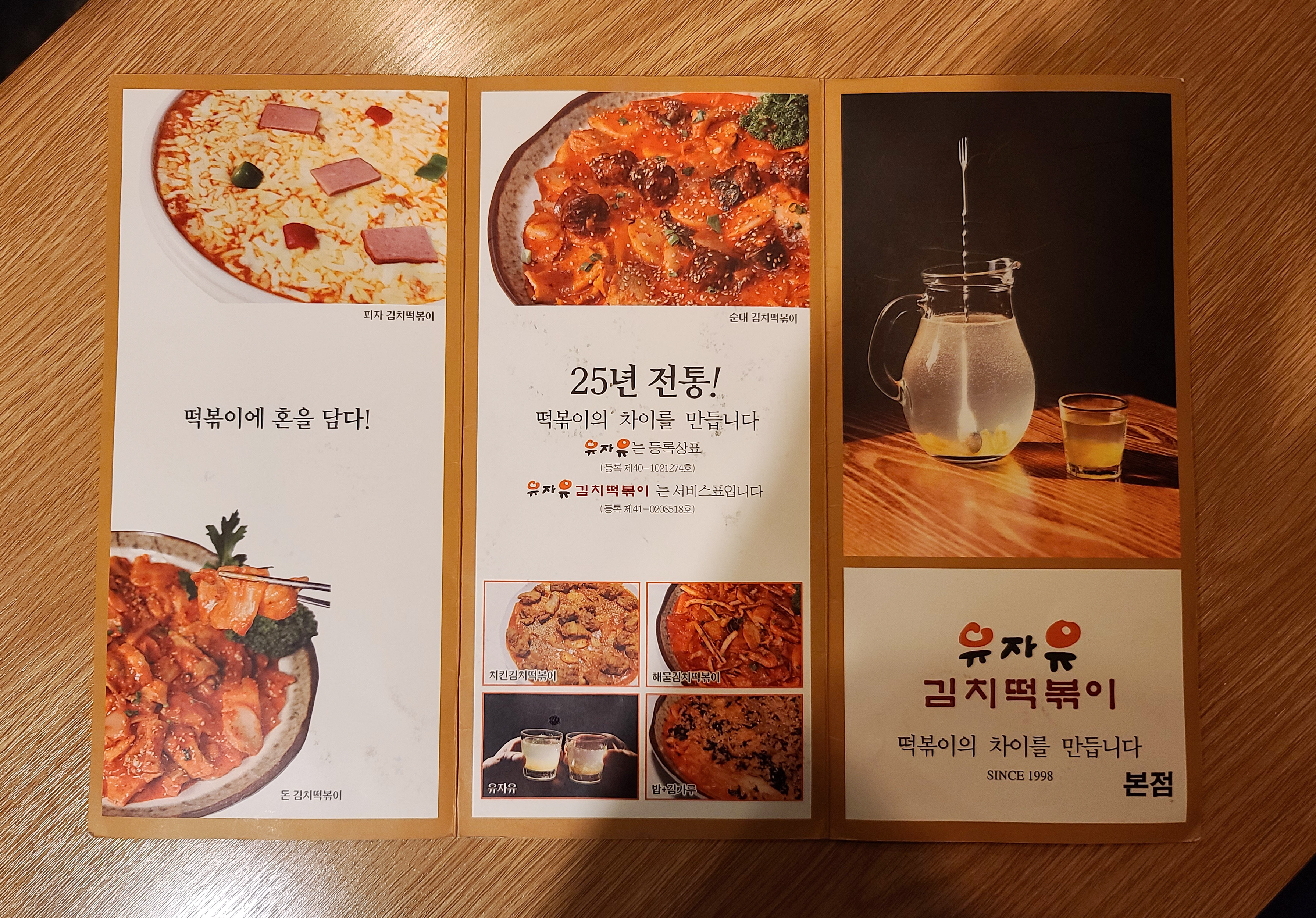 가게의 메뉴판에는 1998년부터 영업해 약 20년이 넘은 떡볶이 전문점이었습니다. 1998년부터 영업했다면 25년 전통이라는 문구를 사용하기에는 아직 부족한 것으로 아는데,,(ㅋㅋㅋ) 아무튼 가게는 25년 전통이라고 표현하고 있었습니다. 메뉴는 김치떡볶이, 순대김치떡볶이, 닭김치떡볶이, 돈김치떡볶이, 쭈꾸미김치떡볶이, 해물김치떡볶이, 피자김치떡볶이, 차돌박이김치떡볶이, 치킨김치떡볶이, 치킨피자김치떡볶이, 순살치킨, 계란말이, 치즈계란말이, 모둠감자튀김, 김치전, 치즈김치전, 해물파전, 오징어튀김, 먹태 등 이 있었습니다.
