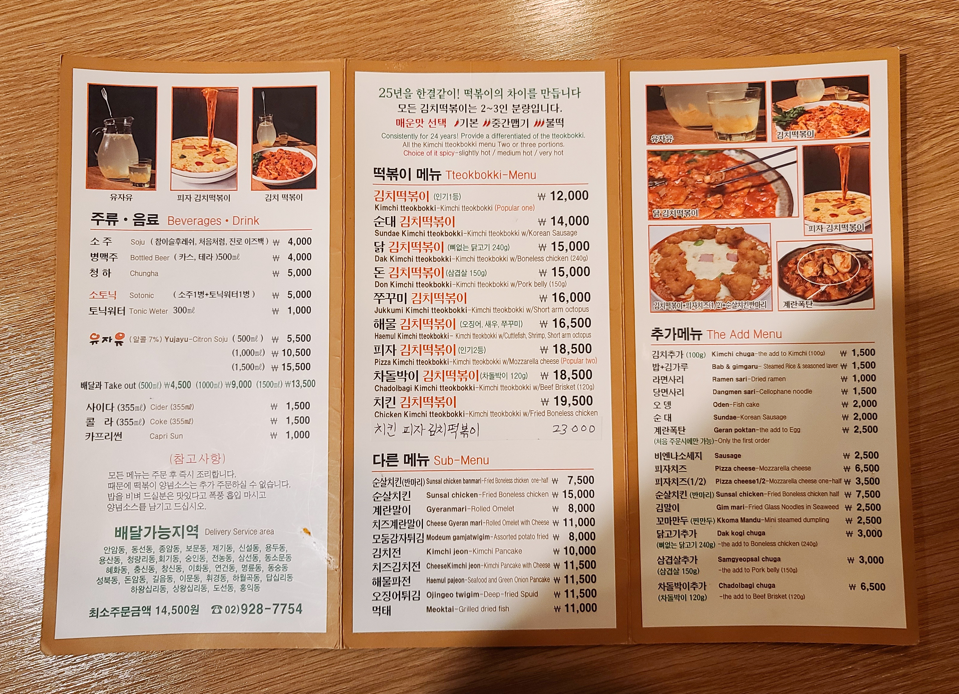 가게의 메뉴판에는 1998년부터 영업해 약 20년이 넘은 떡볶이 전문점이었습니다. 1998년부터 영업했다면 25년 전통이라는 문구를 사용하기에는 아직 부족한 것으로 아는데,,(ㅋㅋㅋ) 아무튼 가게는 25년 전통이라고 표현하고 있었습니다. 메뉴는 김치떡볶이, 순대김치떡볶이, 닭김치떡볶이, 돈김치떡볶이, 쭈꾸미김치떡볶이, 해물김치떡볶이, 피자김치떡볶이, 차돌박이김치떡볶이, 치킨김치떡볶이, 치킨피자김치떡볶이, 순살치킨, 계란말이, 치즈계란말이, 모둠감자튀김, 김치전, 치즈김치전, 해물파전, 오징어튀김, 먹태 등 이 있었습니다.