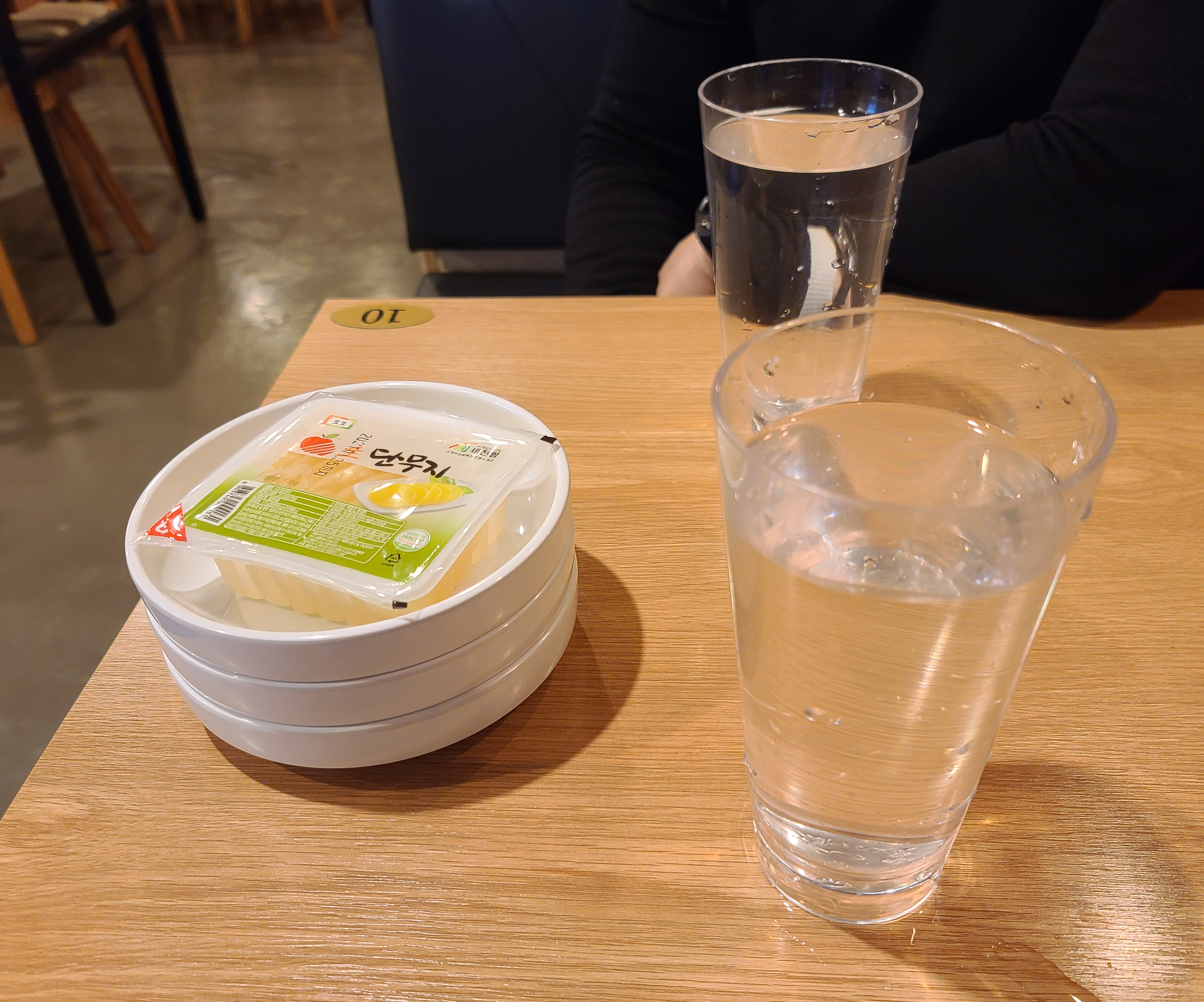 기본적으로 음료수(?)가 제공되었고, 단무지가 함께 나왔습니다. SNS 이벤트로 #안암맛집 #안암유자유 #고대맛집 #안암떡볶이맛집 #안암유자유김치떡볶이 중 3개 이상 태그를 달면 음료수를 서비스로 제공해주고 있어서, 해시태그 이벤트에 참가하여 음료를 서비스로 제공받았습니다.