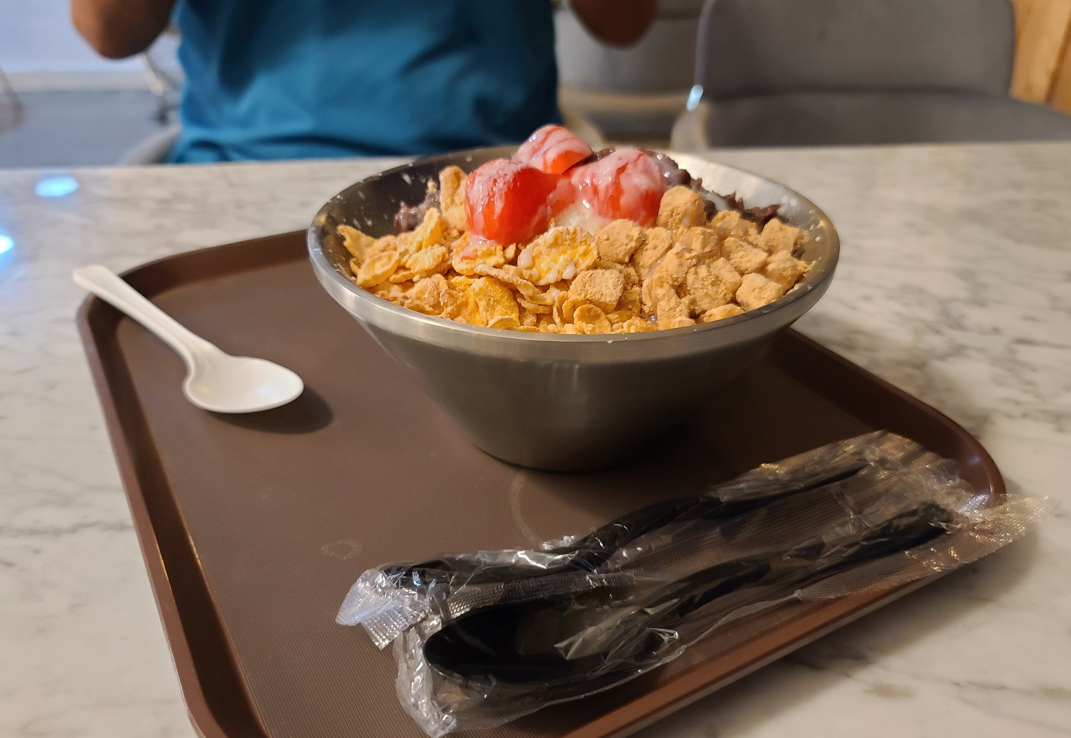 빙수는 시리얼과 냉동딸기가 얹어진 형태의 빙수였고, 베이스는 우유로 만든 눈꽃 빙수였습니다. 가격도 8,000원~ 10,000원에 양도 시골인심(?)이라 그런지 푸짐하게 주셔서, 배불리 먹을 수 있는 메뉴였습니다.