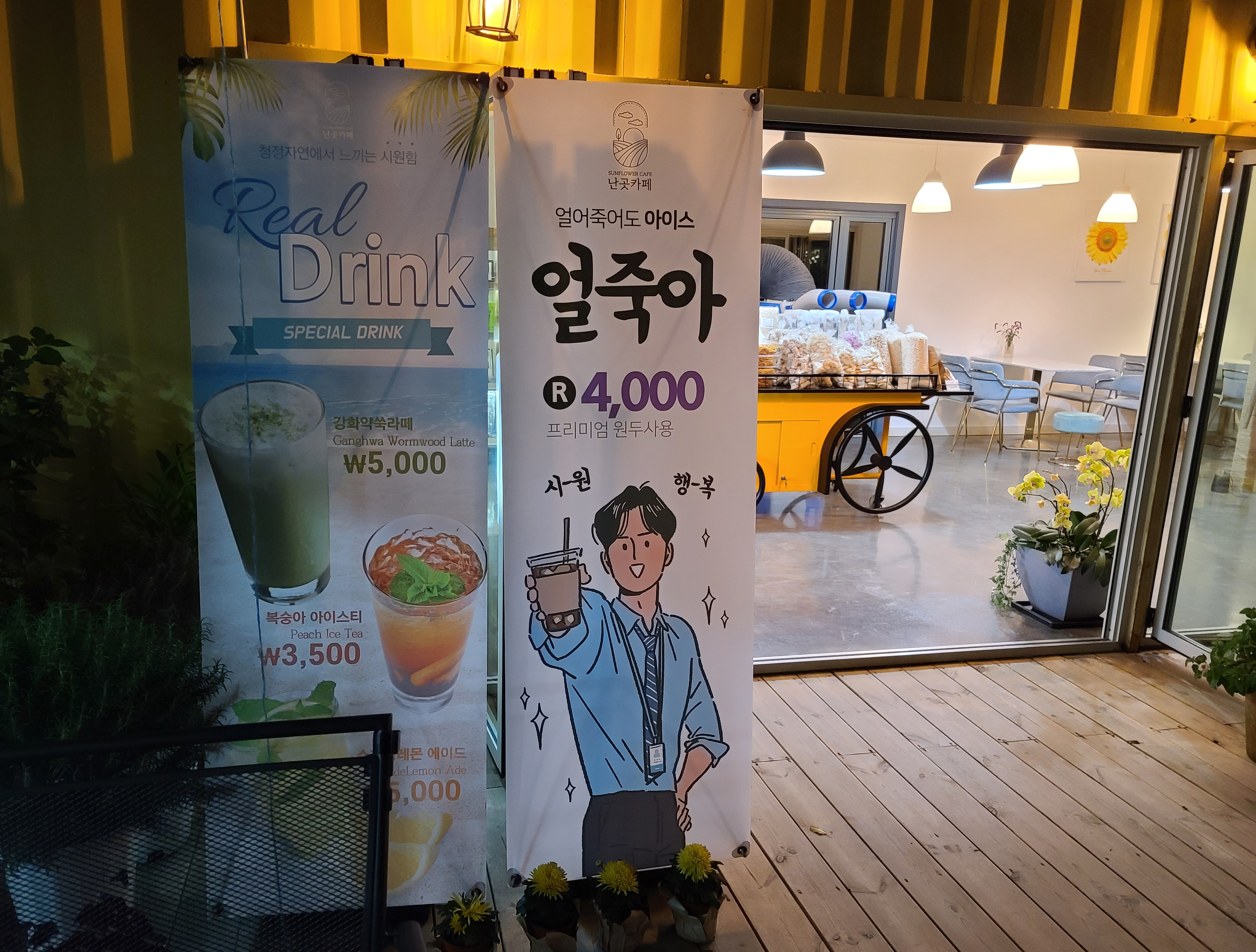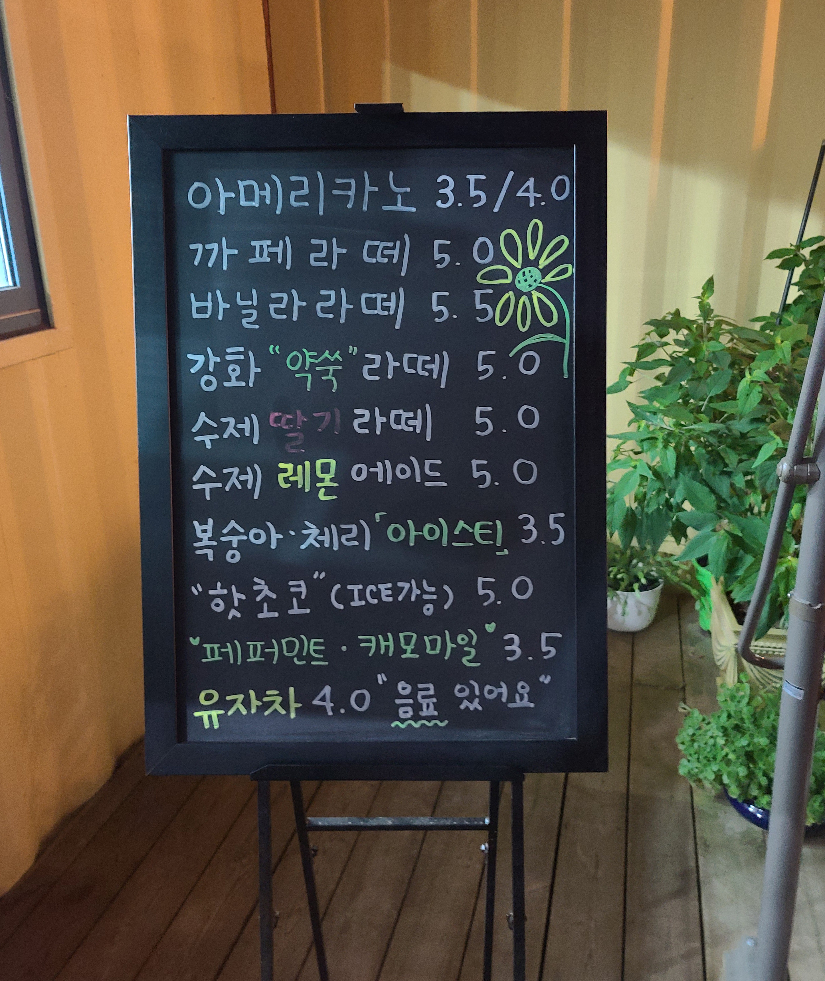편안한 분위기와 합리적인 가격이 특징인 이 곳은 아메리카노가 3,500원이었고, 카페라떼, 바닐라라떼, 강화약쑥라떼, 수제딸기라떼, 수제레몬에이드, 복숭아・체리아이스티, 핫초코, 페퍼민트・캐모마일, 유자차 등이 있는 카페입니다. 특히 눈꽃처럼 부드러운 식감의 우유빙수는 시골에서 맛볼 수 있는 최고의 빙수인 것 같습니다.