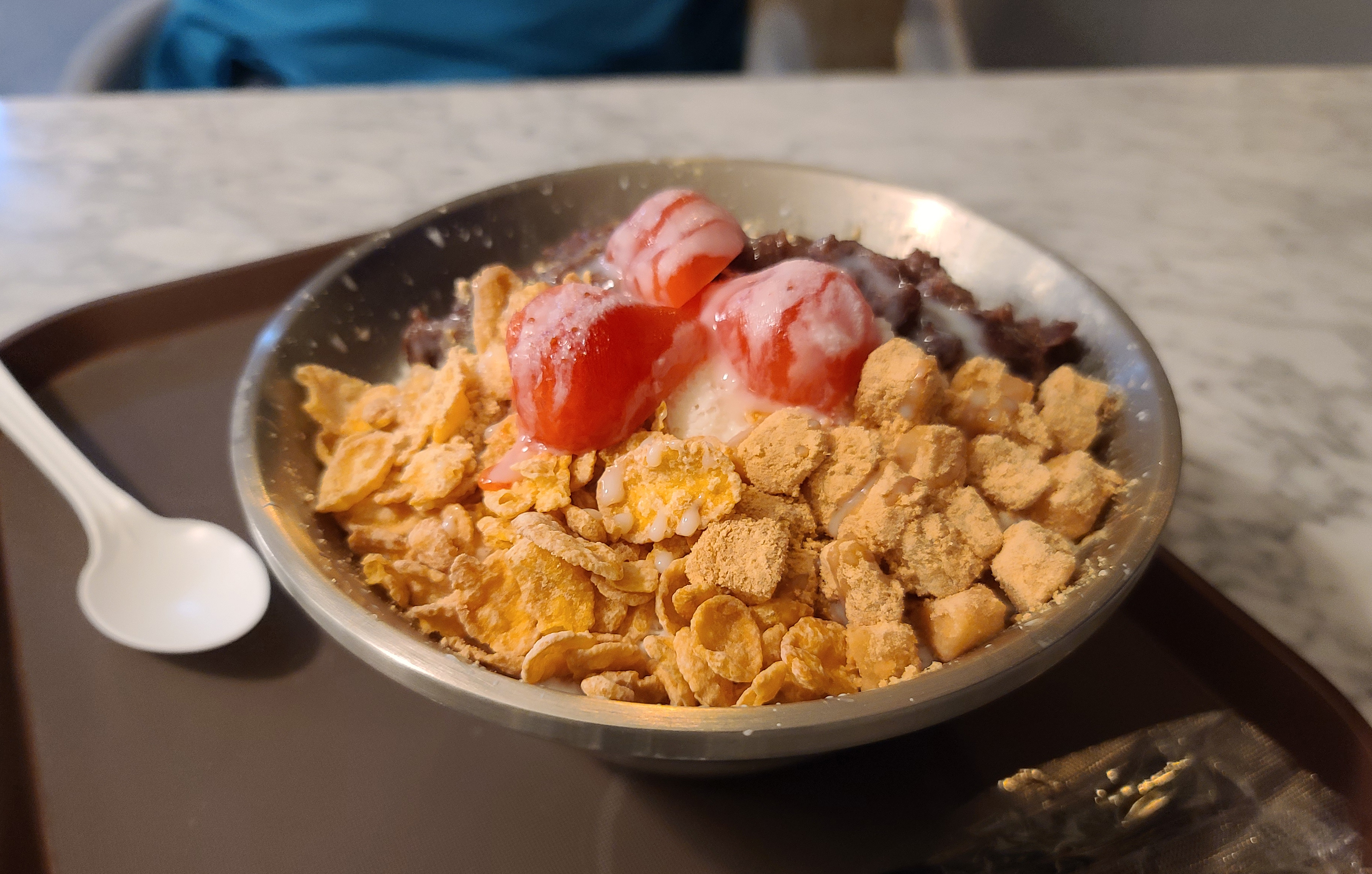 빙수는 시리얼과 냉동딸기가 얹어진 형태의 빙수였고, 베이스는 우유로 만든 눈꽃 빙수였습니다. 가격도 8,000원~ 10,000원에 양도 시골인심(?)이라 그런지 푸짐하게 주셔서, 배불리 먹을 수 있는 메뉴였습니다.