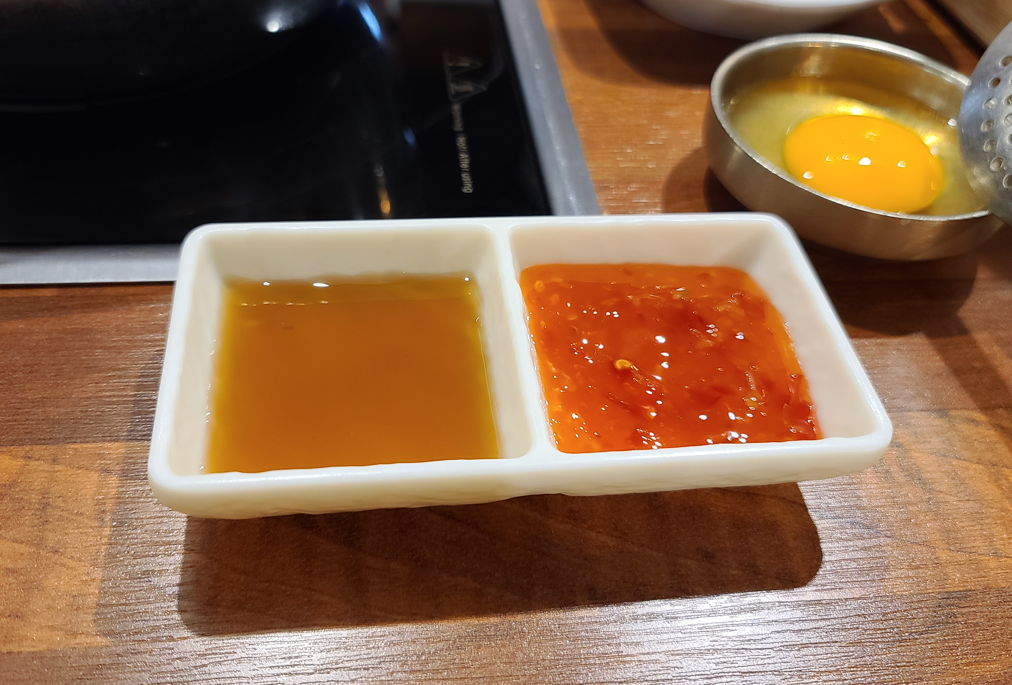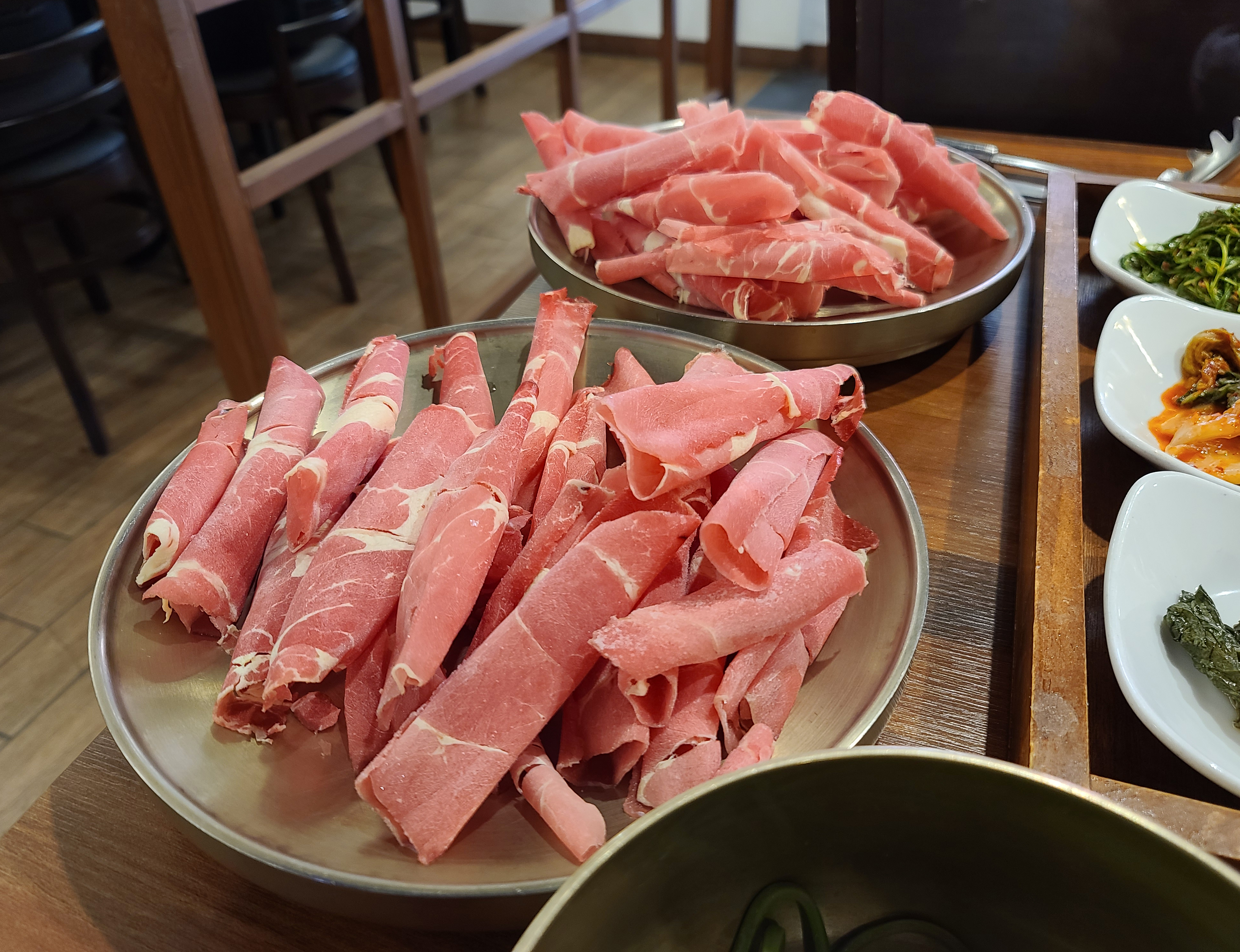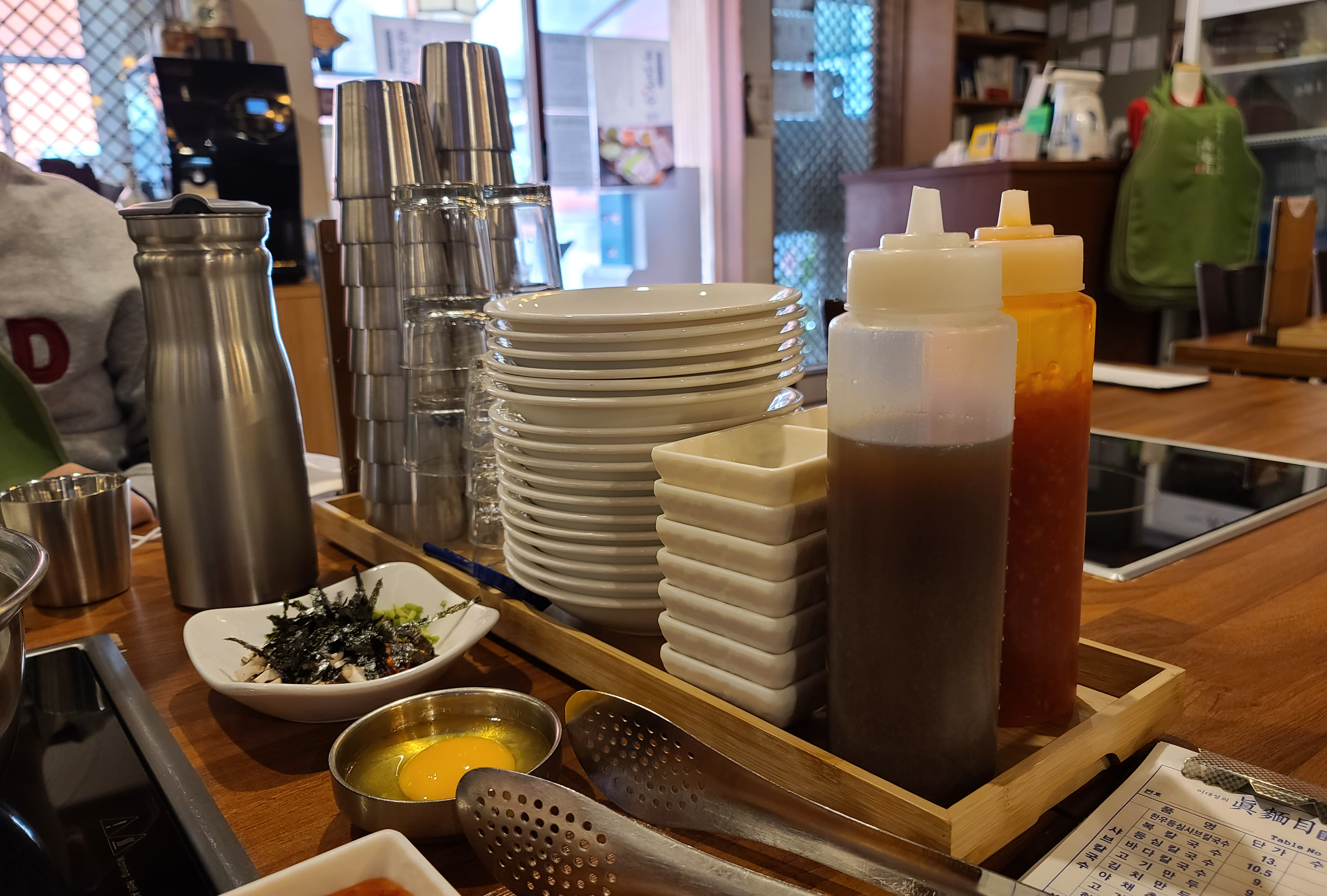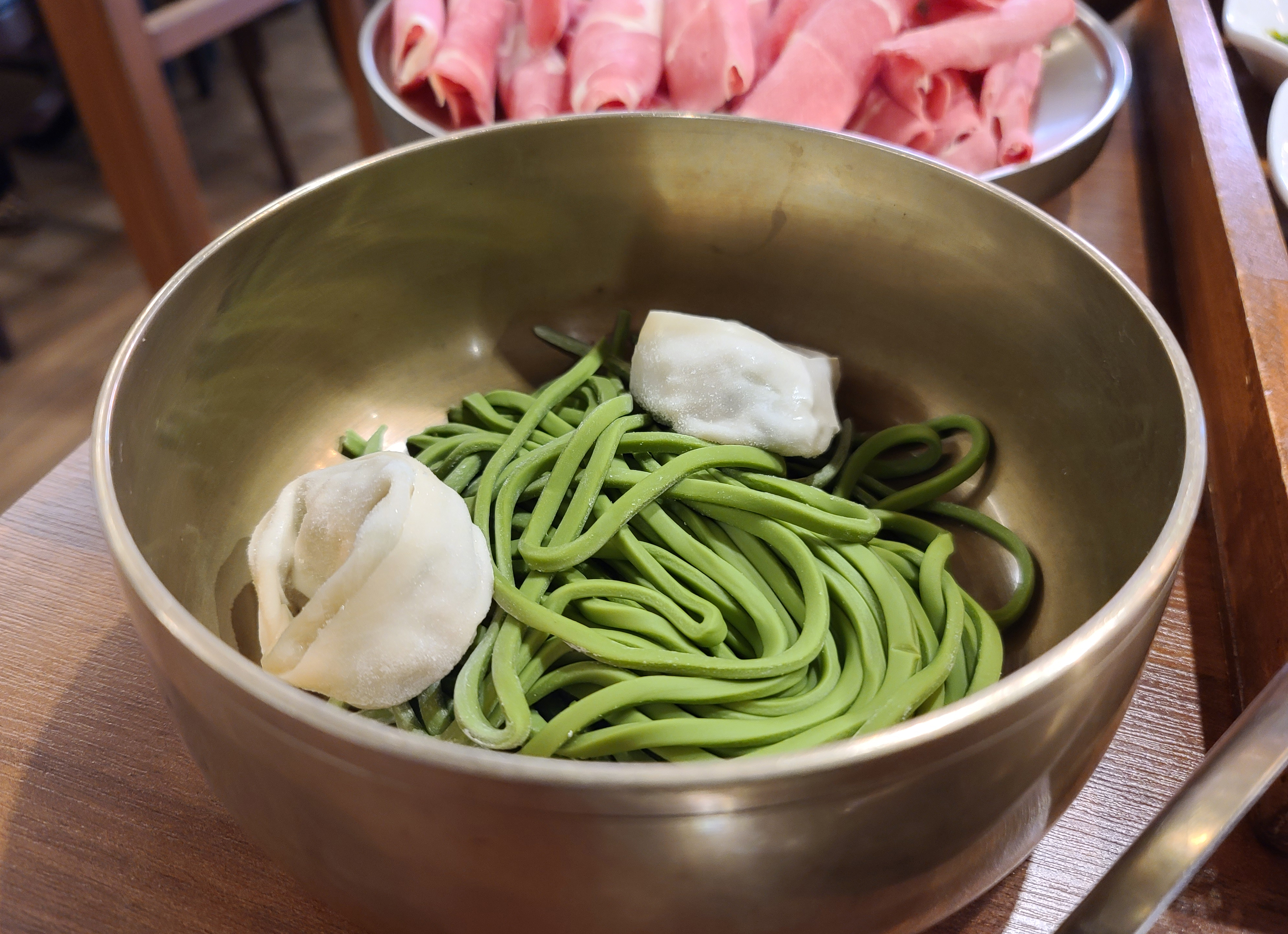 소스와 소스 그릇, 앞접시, 컵들이 깔끔하게 정돈되어 있었고, 필요한 만큼 소스를 덜어서 고기와 함께 찍어먹었습니다. 샤브샤브 고기를 어느 정도 먹은 다음 칼국수 재료를 넣어 칼국수를 먹었습니다.