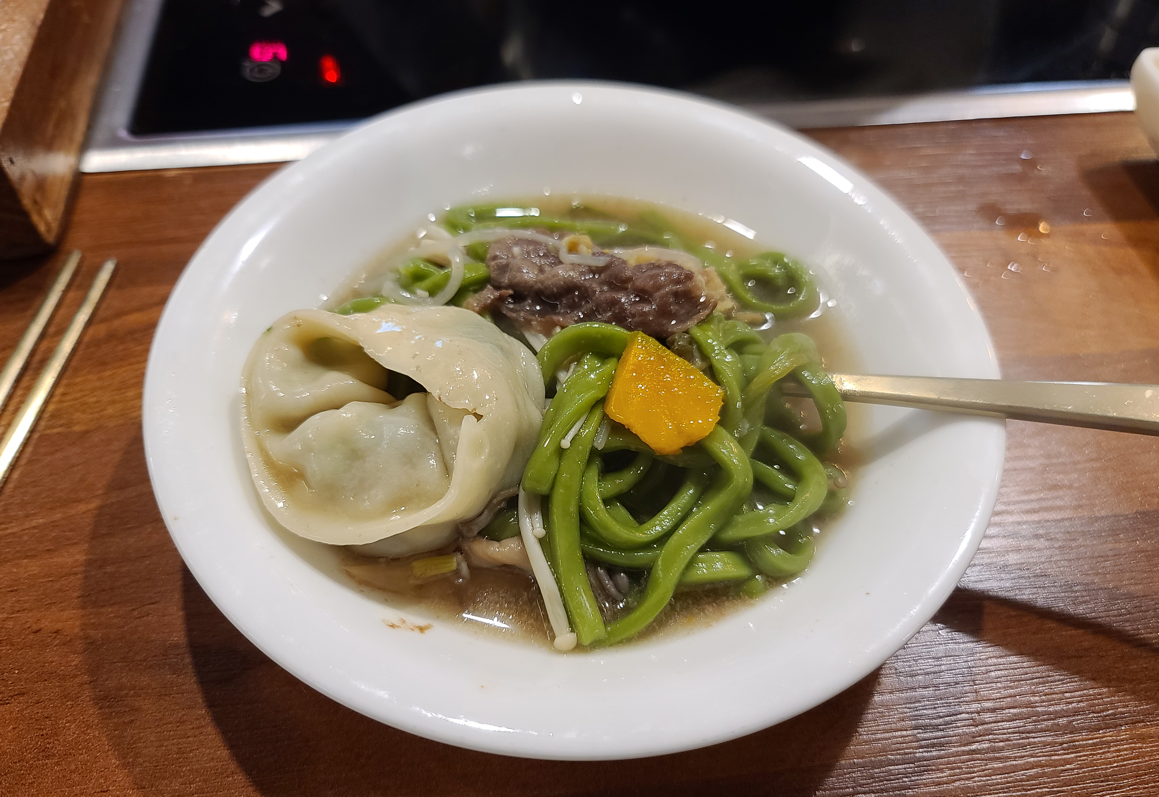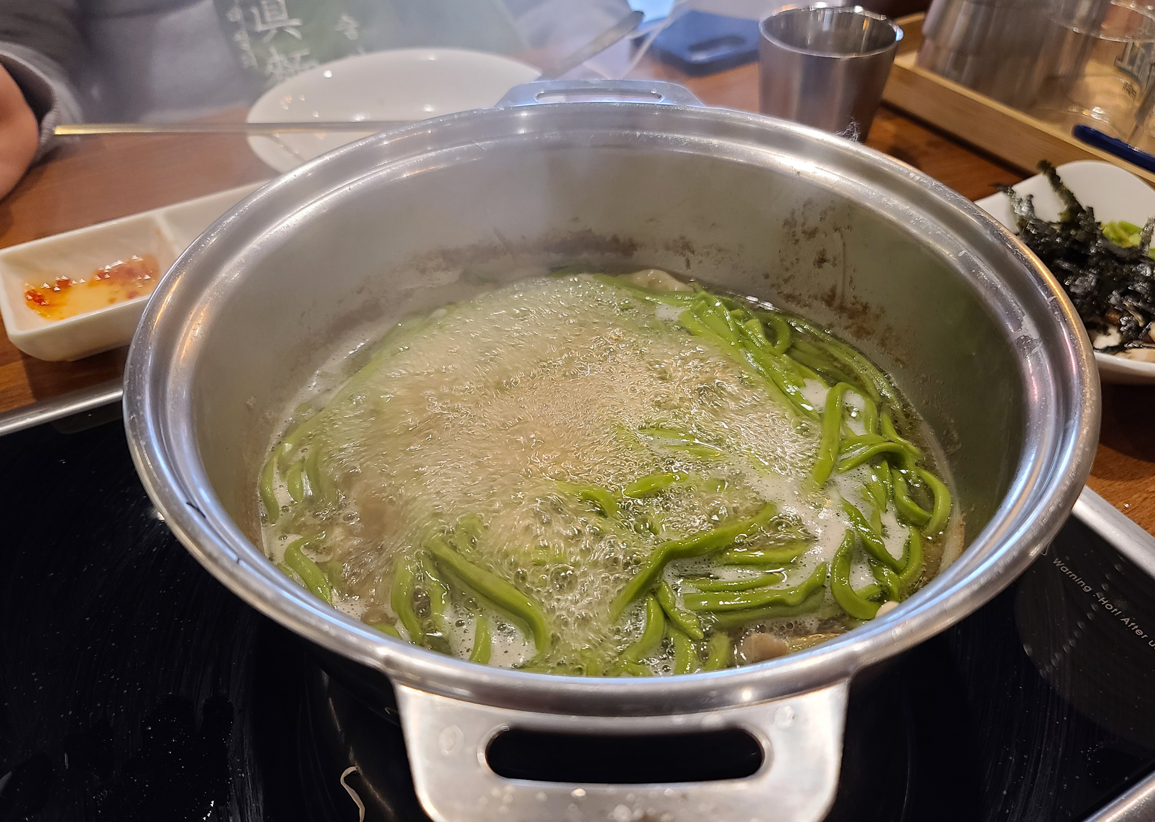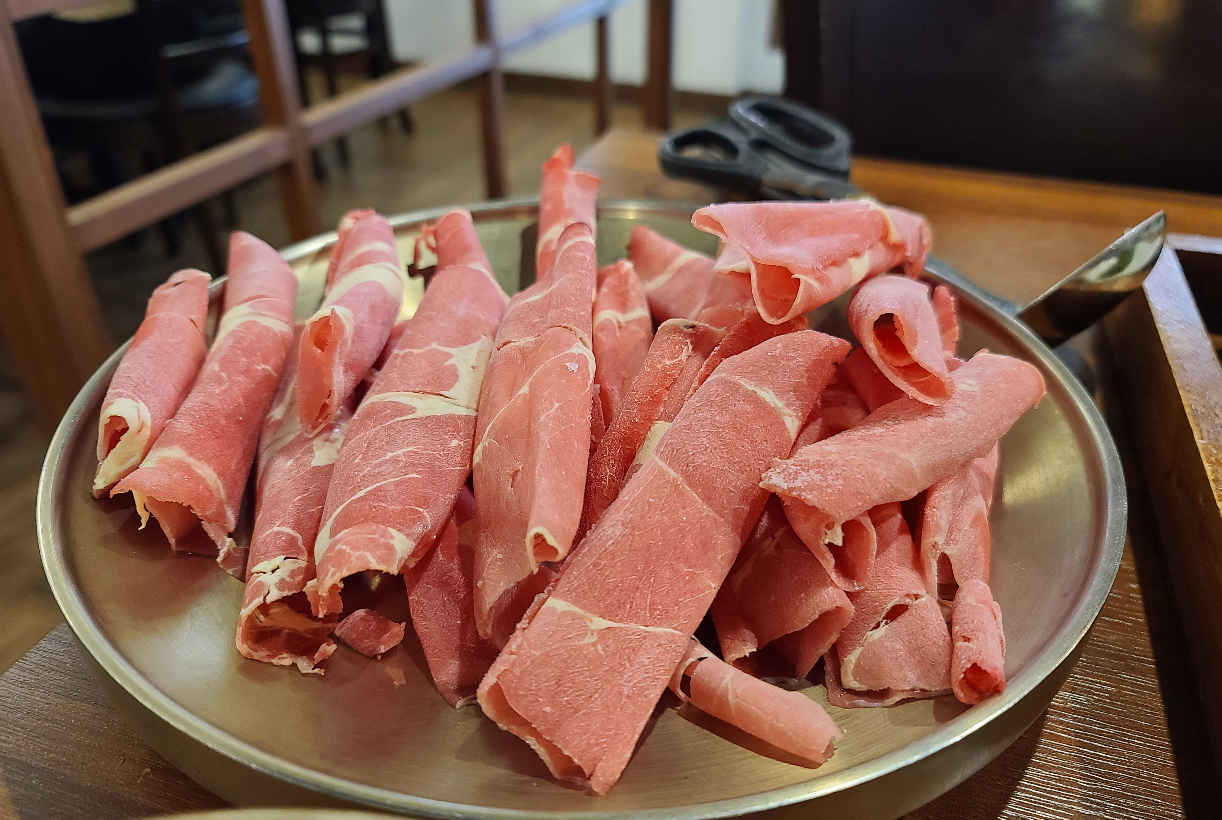 소스와 소스 그릇, 앞접시, 컵들이 깔끔하게 정돈되어 있었고, 필요한 만큼 소스를 덜어서 고기와 함께 찍어먹었습니다. 샤브샤브 고기를 어느 정도 먹은 다음 칼국수 재료를 넣어 칼국수를 먹었습니다.