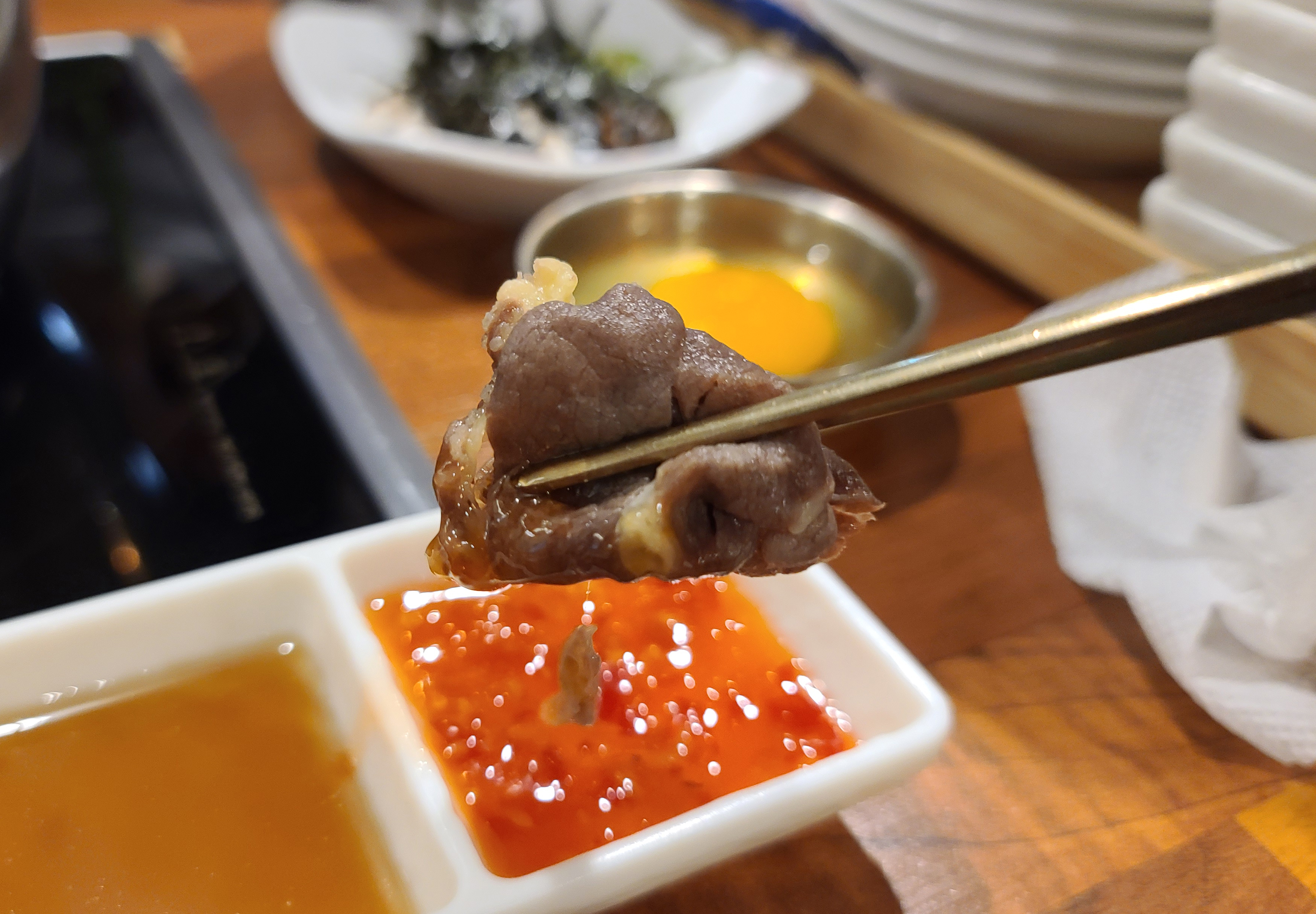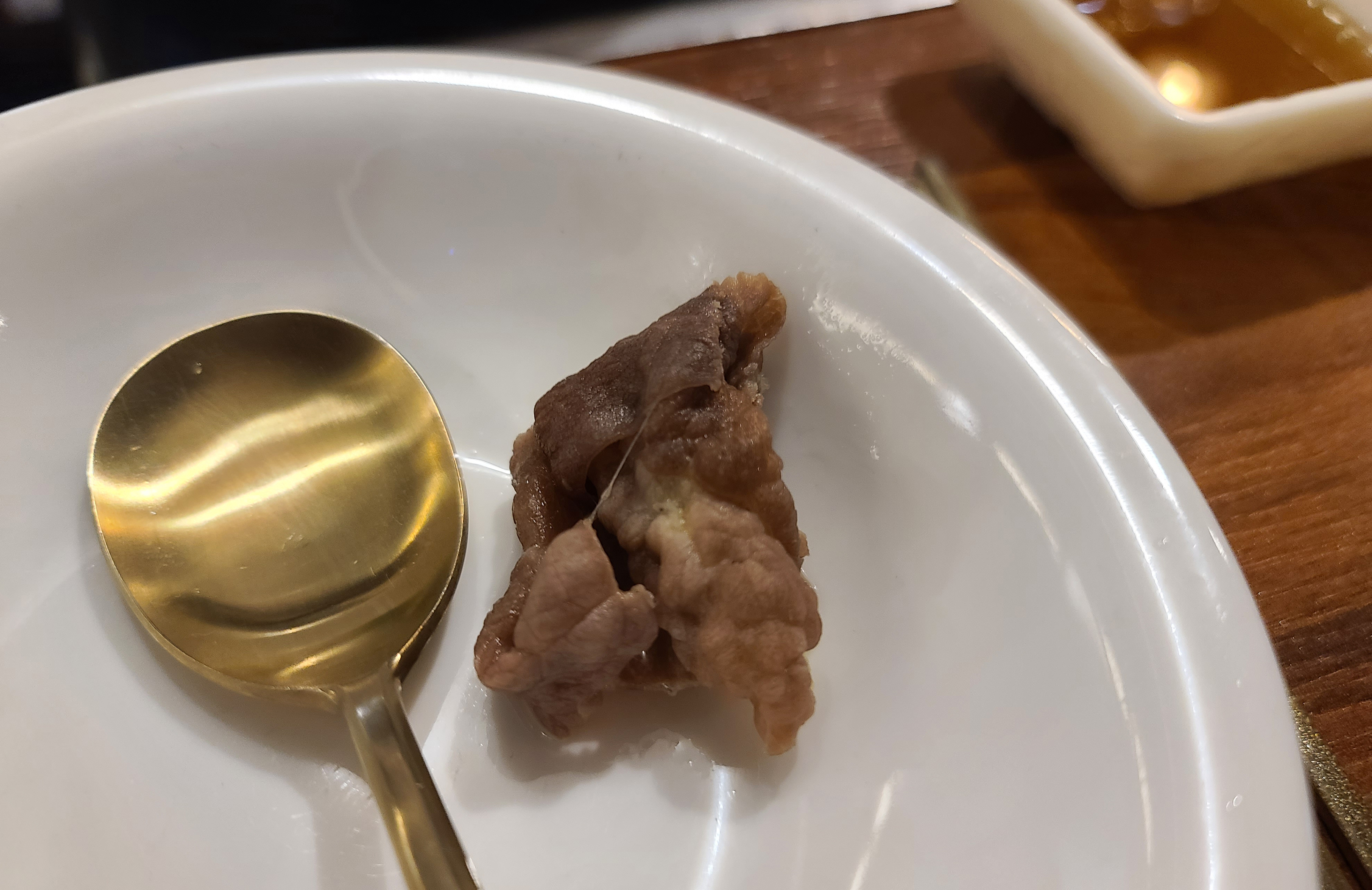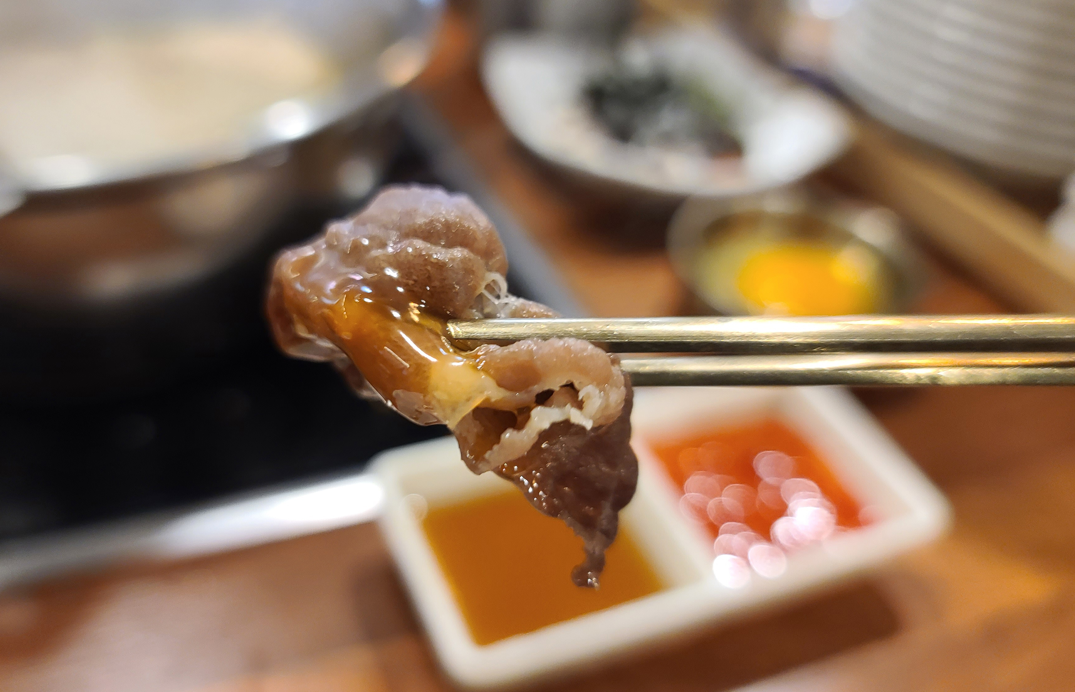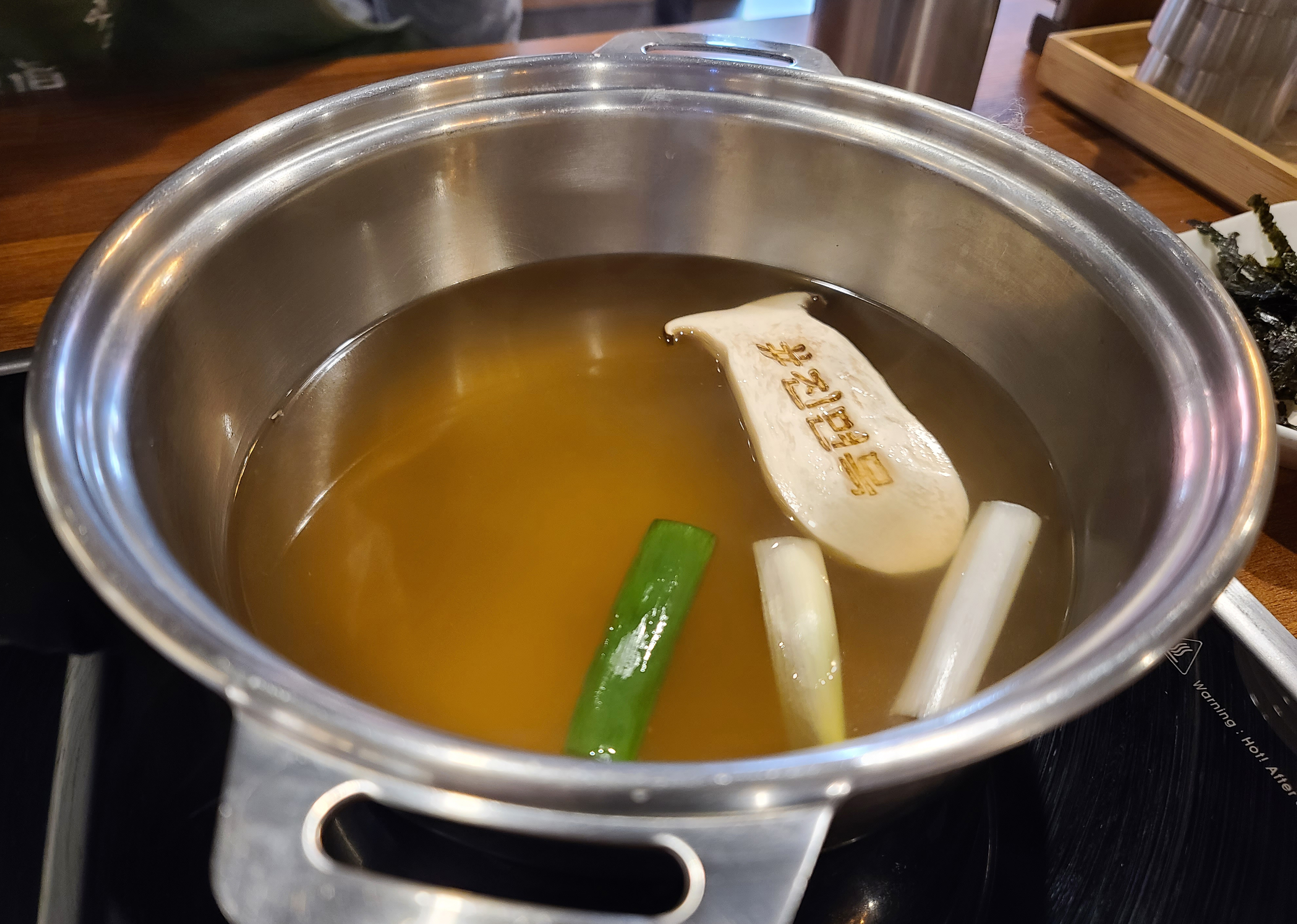 소스와 소스 그릇, 앞접시, 컵들이 깔끔하게 정돈되어 있었고, 필요한 만큼 소스를 덜어서 고기와 함께 찍어먹었습니다. 샤브샤브 고기를 어느 정도 먹은 다음 칼국수 재료를 넣어 칼국수를 먹었습니다.